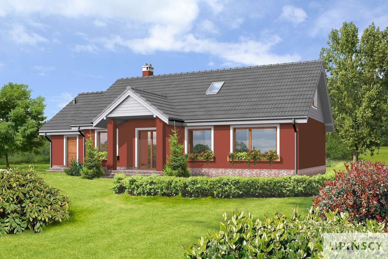 Nowa wersja projektu Haga z garażem. Akcentami elewacji są dwuspadowe zadaszenia wsparte na masywnych prostokątnych słupach. Taras wejściowy i spory wiatrołap z miejscem na pojemne szafy prowadzą do wnętrza domu. Trzy sypialnie i wygodna łazienka po lewej stronie wejścia to strefa nocna. Pokój dzienny łączy się z dużą kuchnią w jedną przestrzeń. Jest tu miejsce na kąt wypoczynkowy przy kominku, stół jadalny, kręcone schody na ewentualne poddasze. Z kuchnią sąsiaduje również praktyczne pomieszczenie gospodarcze z wyjściem do ogrodu. Dom dostępny jest w wersji bez garażu LMB47 i z garażem po lewej stronie LMB47a.