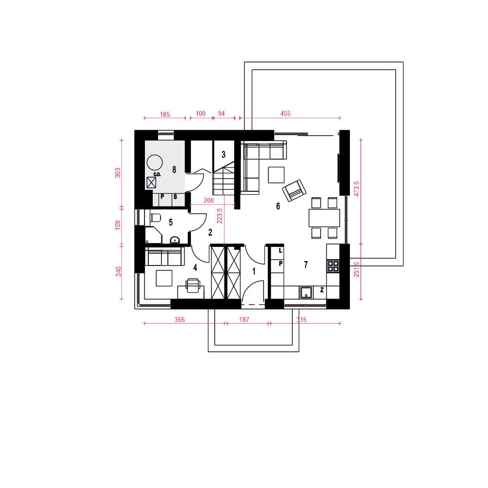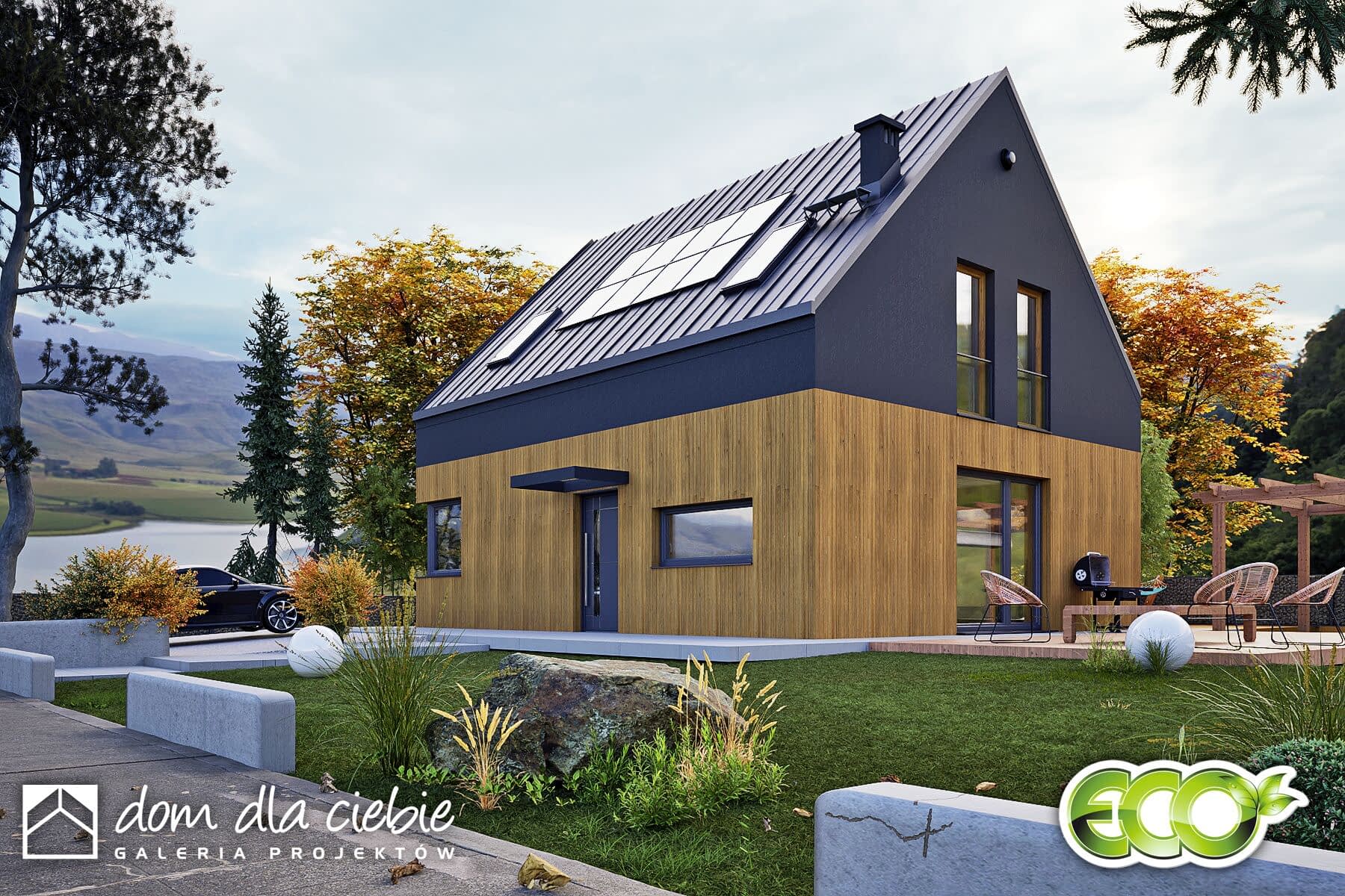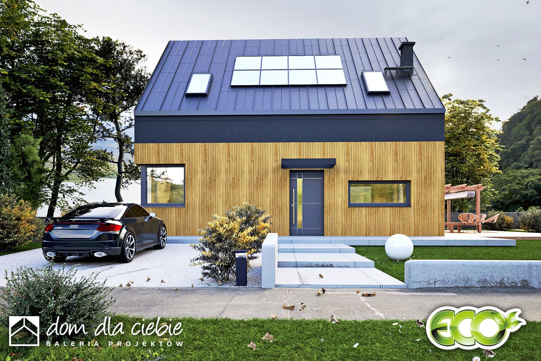 Hazi to nowoczesny, kompaktowy dom jednorodzinny z dwuspadowym dachem bez okapów, przeznaczony dla 4-osobowej rodziny. Prosta i elegancka bryła łączy estetykę współczesnej architektury z funkcjonalnością.Na parterze znajduje się przestronny salon z otwartą kuchnią i jadalnią, dodatkowy pokój (np. gabinet lub sypialnia), łazienka z prysznicem oraz pomieszczenie techniczne. Duże przeszklenia łączą wnętrze z ogrodem i tarasem, tworząc przyjazną przestrzeń do wypoczynku.Na poddaszu zaplanowano trzy sypialnie (dwie z garderobami) oraz łazienkę. Hazi to dom ekologiczny, łatwy w budowie i ekonomiczny w użytkowaniu – idealny dla rodzin ceniących wygodę, nowoczesność i rozsądne koszty.