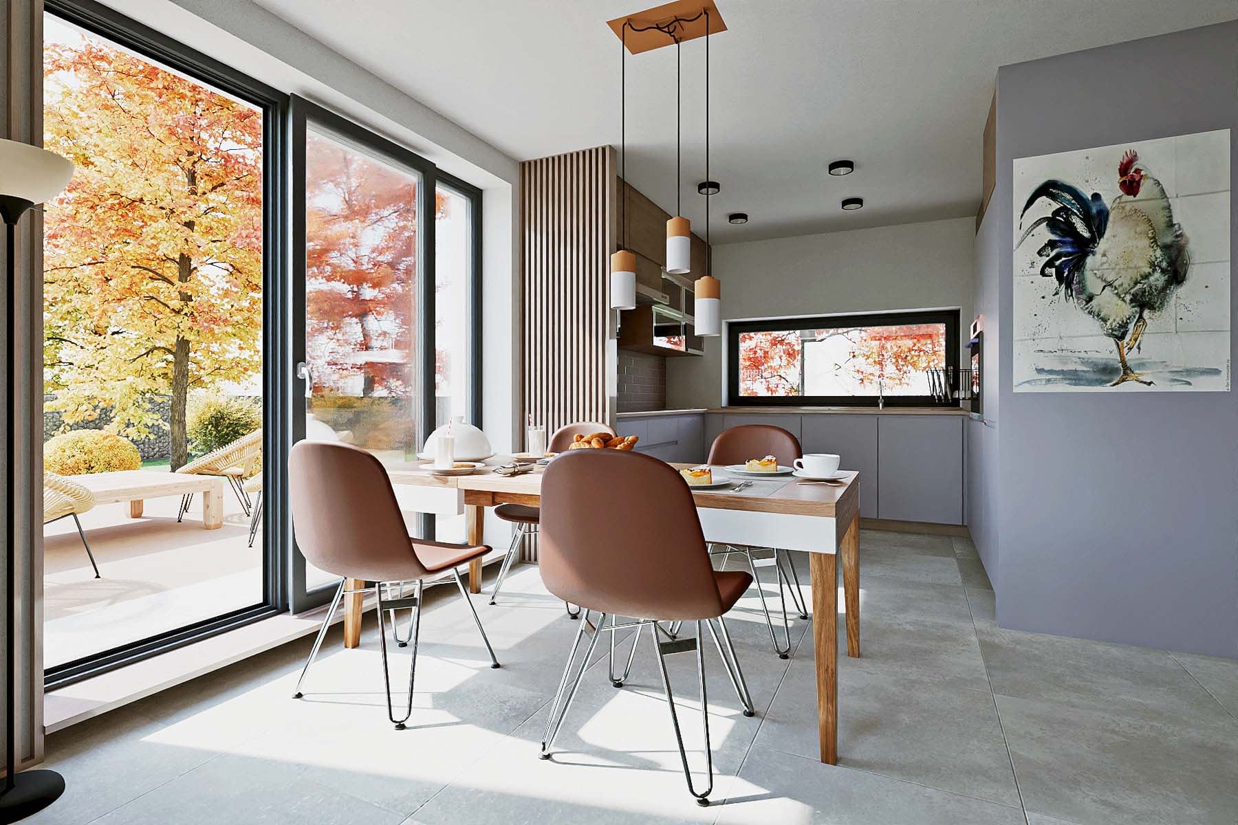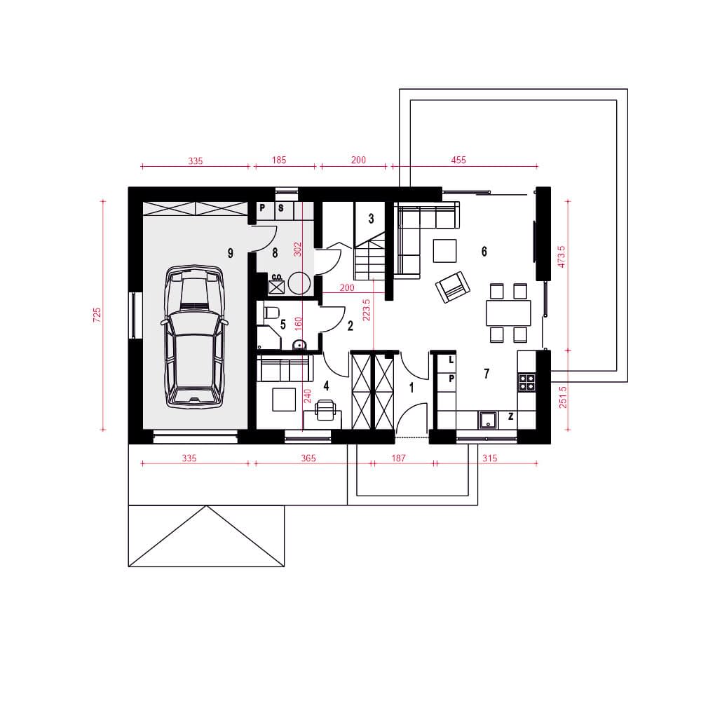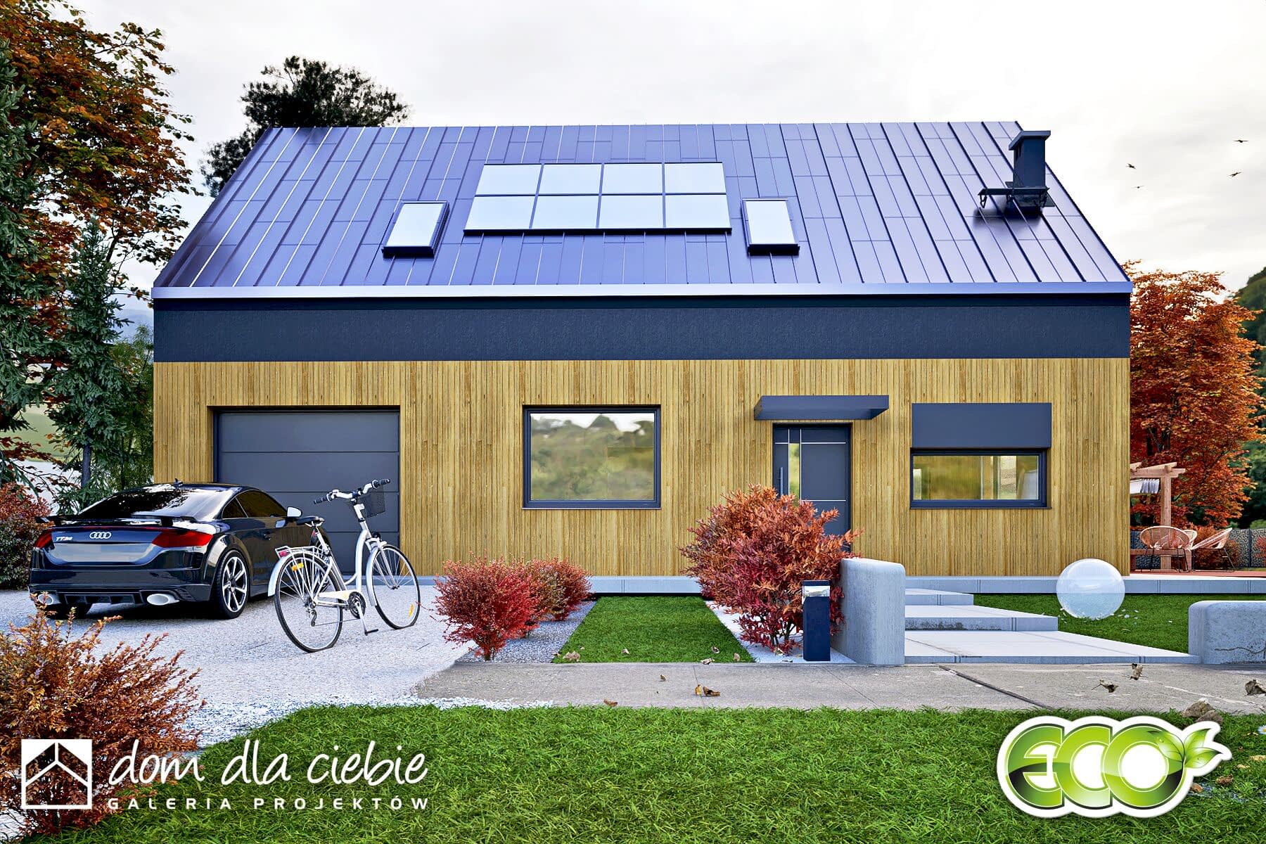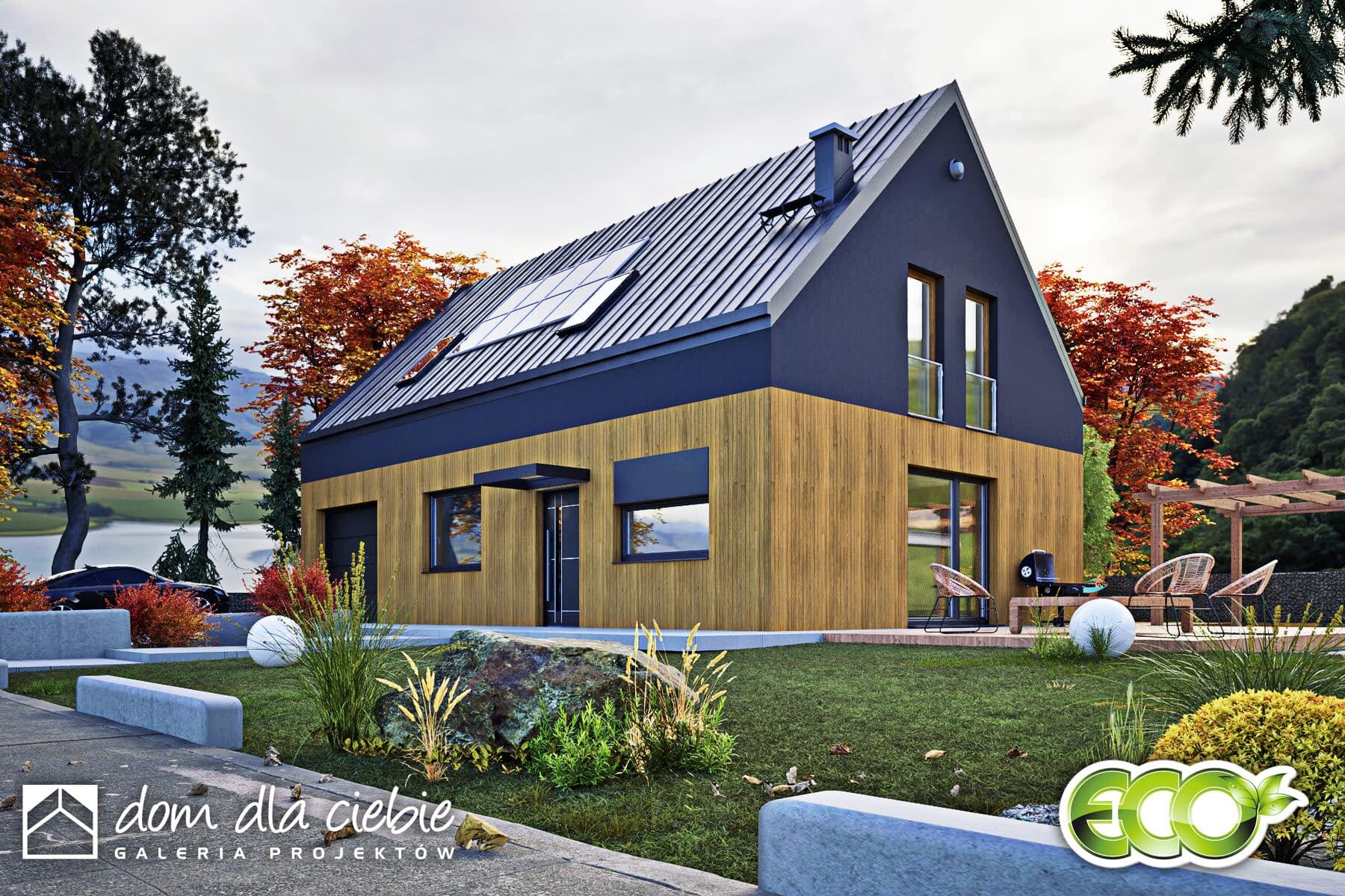Hazi z garażem to nowoczesny, kompaktowy dom jednorodzinny z dwuspadowym dachem bez okapów, przeznaczony dla 4-osobowej rodziny. Prosta i elegancka bryła łączy estetykę współczesnej architektury z funkcjonalnością.Na parterze znajduje się przestronny salon z otwartą kuchnią i jadalnią, dodatkowy pokój (np. gabinet lub sypialnia), łazienka z prysznicem, pomieszczenie techniczne oraz garaż. Duże przeszklenia łączą wnętrze z ogrodem i tarasem, tworząc przyjazną przestrzeń do wypoczynku.Na poddaszu zaplanowano trzy sypialnie (dwie z garderobami) oraz łazienkę. Hazi to dom ekologiczny, łatwy w budowie i ekonomiczny w użytkowaniu – idealny dla rodzin ceniących wygodę, nowoczesność i rozsądne koszty.