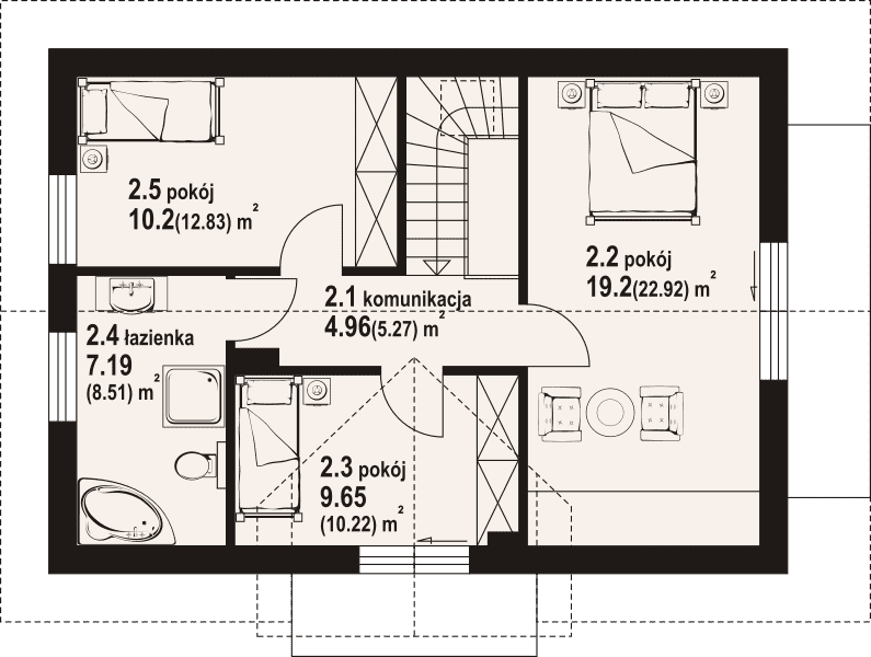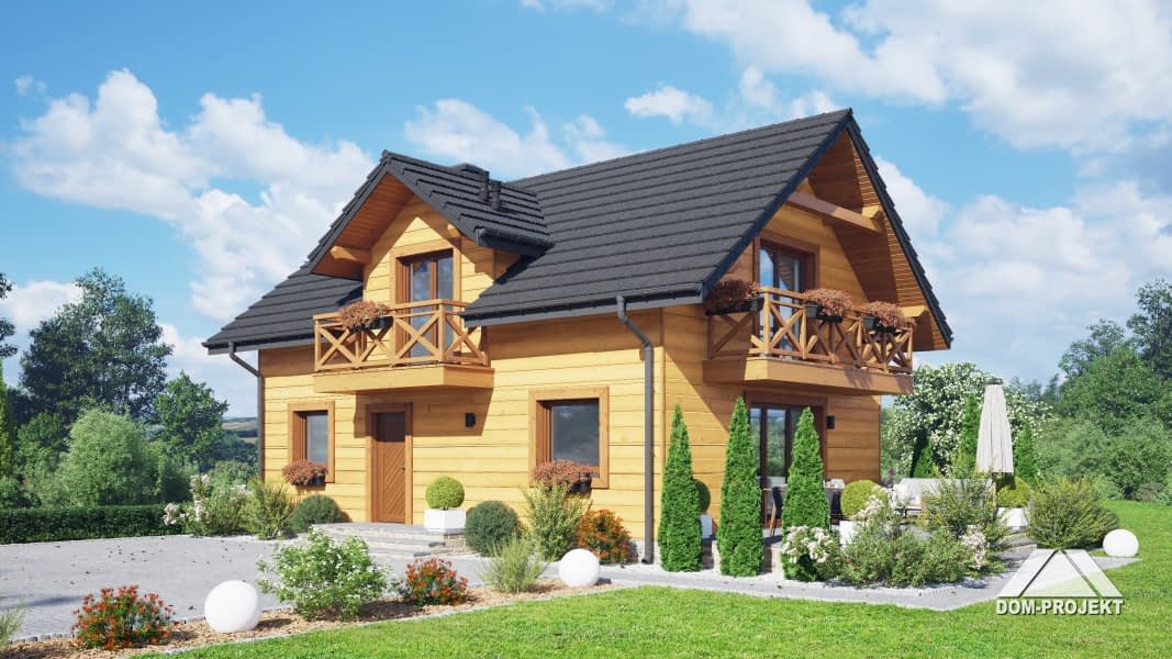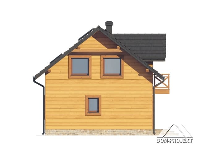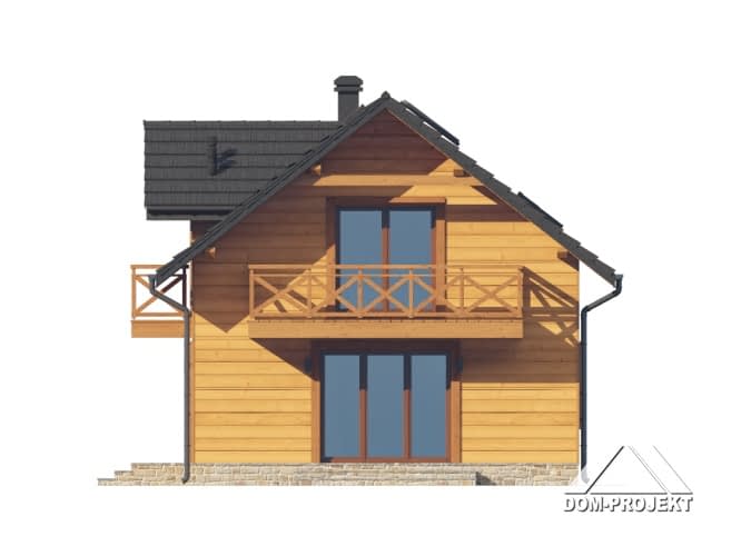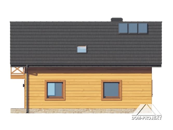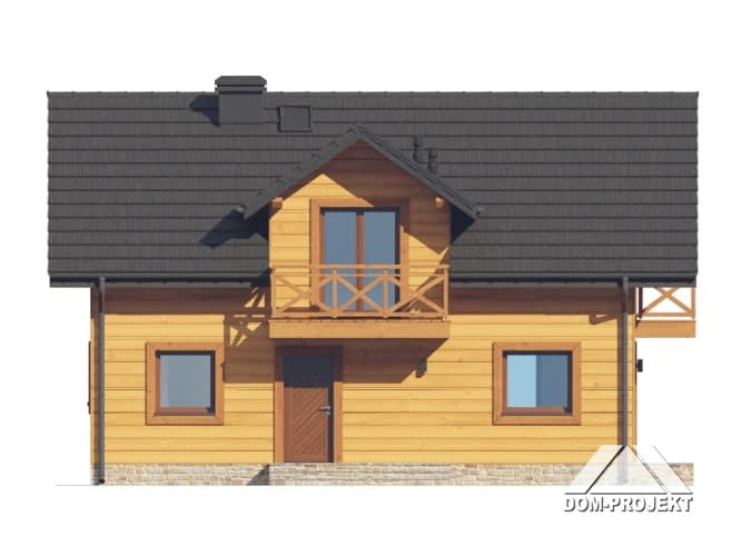 Dom w konstrukcji szkieletu drewnianego. Na parterze salon z aneksem kuchennym, wyjściem na taras i schodami na poddasze. Pokój, łazienka, kotłownia, wiatrołap, komunikacja. Na poddaszu trzy pokoje, łazienka, komunikacja. Zwarta bryła budynku oraz dach dwuspadowy sprzyjają szybkiej i taniej budowie oraz niskim kosztom eksploatacji.Rzuty