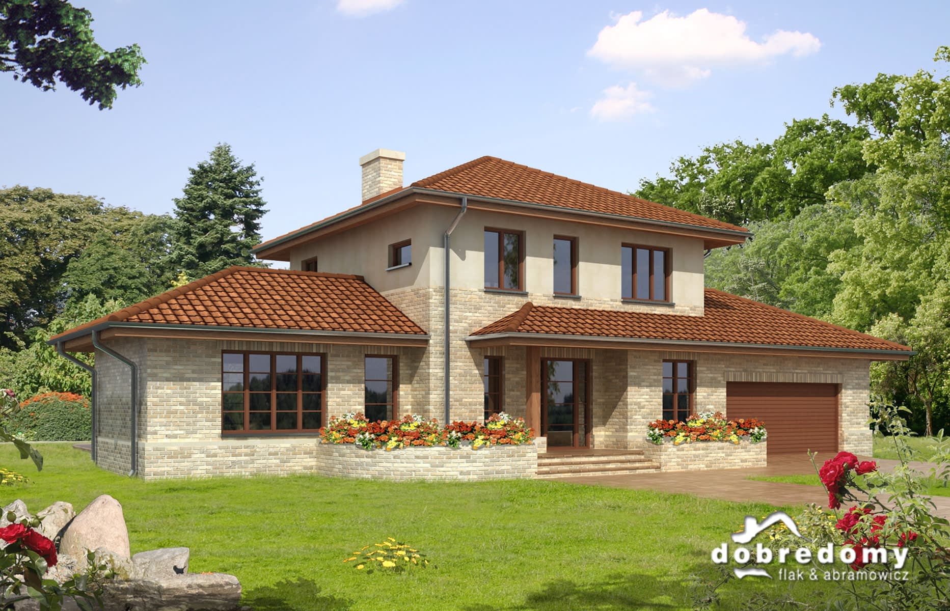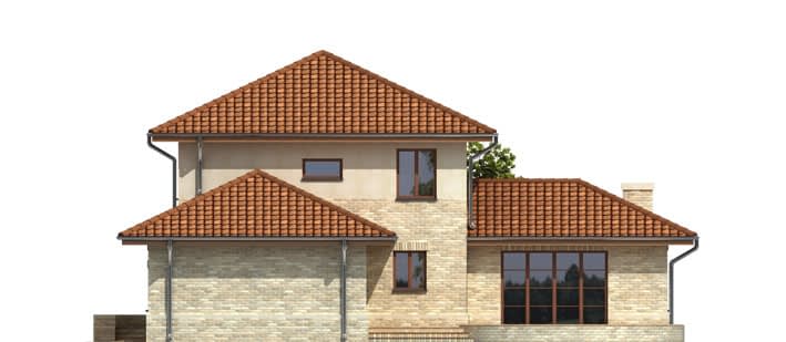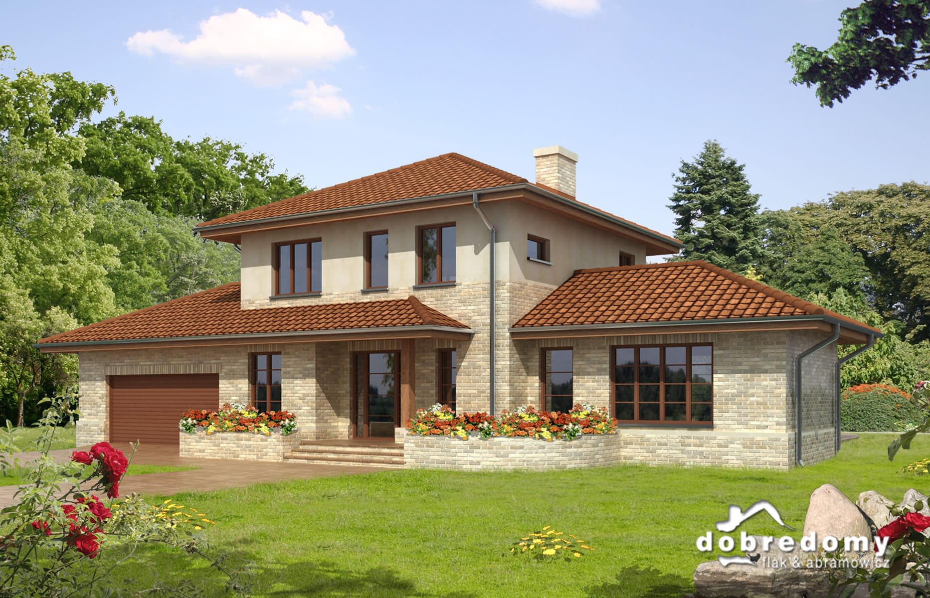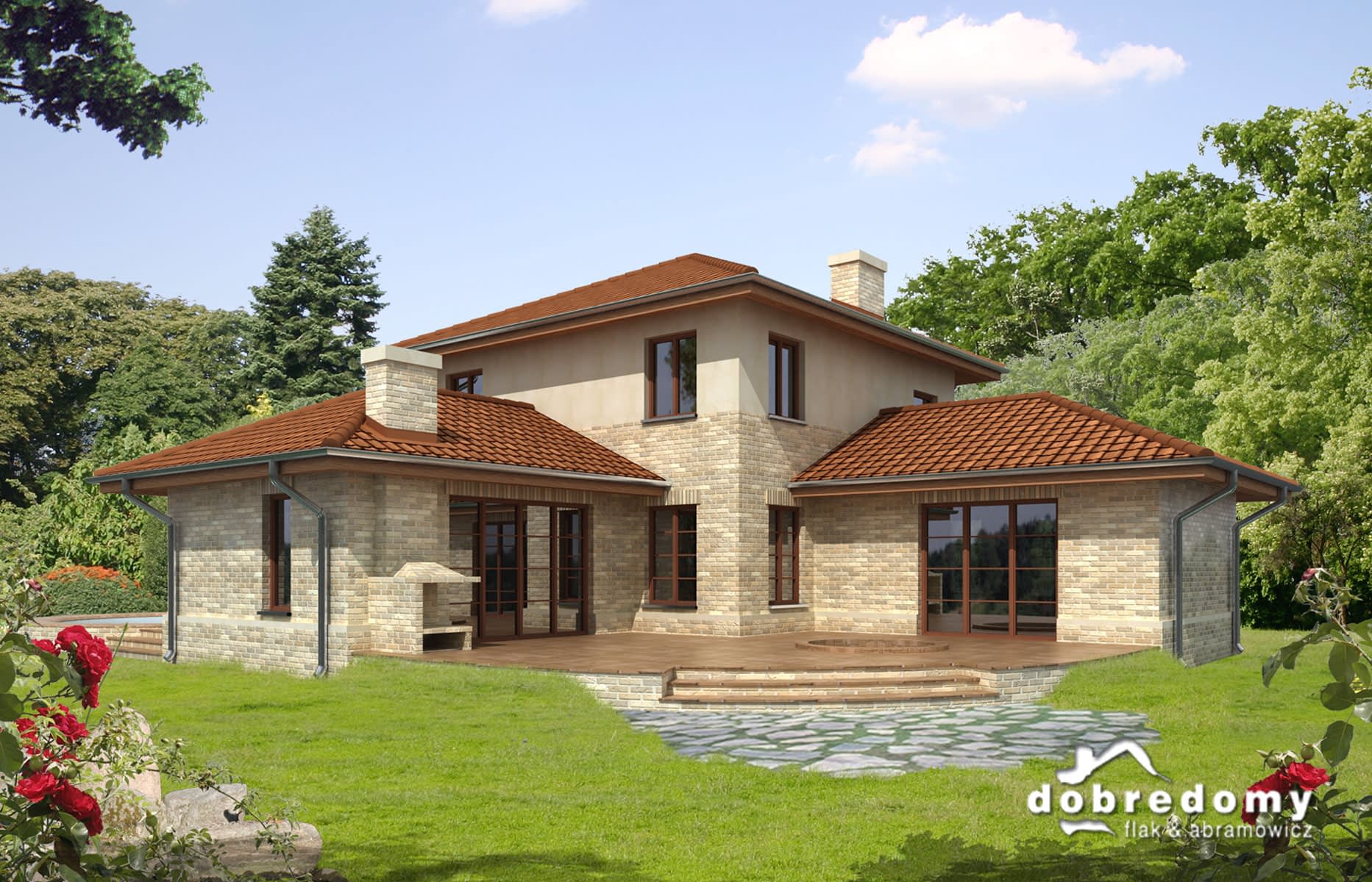 Elewacje pokryte tynkiem strukturalnym w systemie ociepleń Termo Organika oraz bloczkami ceramicznymi. Pokrycie dachu - dachówka ceramiczna lub cementowa CREATON. Wykończenie elementami z drewna.