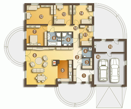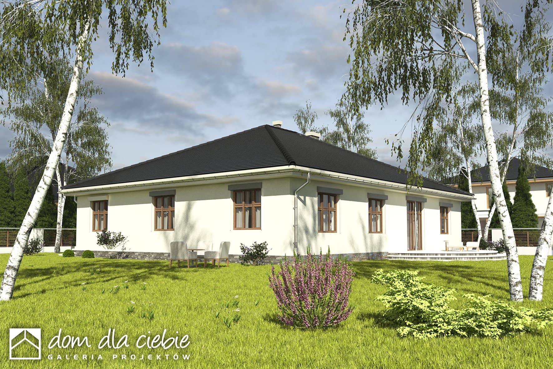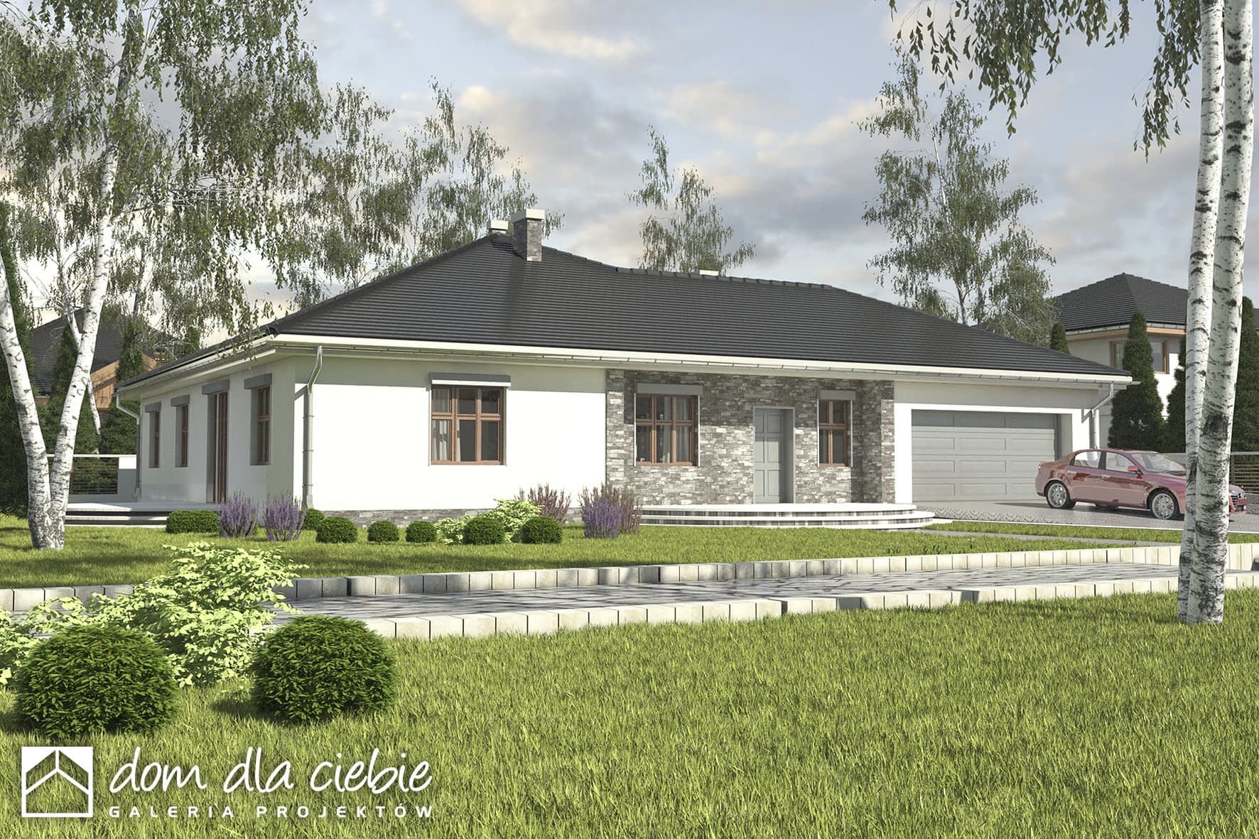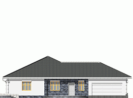 Współczesny dom parterowy dla 5-6 cio osobowej rodziny, o atrakcyjnym wyglądzie i przemyślanych proporcjach. W domu przewidziano rozdział na strefy ogólną i prywatną, zlokalizowane na parterze. W części ogólnej przewidziano salon z jadalnią i kuchnią oraz rozbudowaną strefę wejściową z łazienką a także dużą i wygodną garderobą. Wiatrołap łączy komunikacyjnie dom z garażem. Część prywatna to pięć wygodnych sypialni oraz duża łazienka. Obok łazienki znajduje się pomieszczenie gospodarcze z piecem CO. Nieużytkowe poddasze można wykorzystać na cele składowe. Helenka to dom okazały przewidziany na dużą działkę.