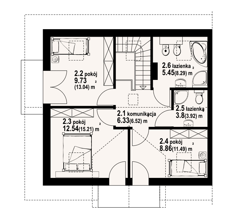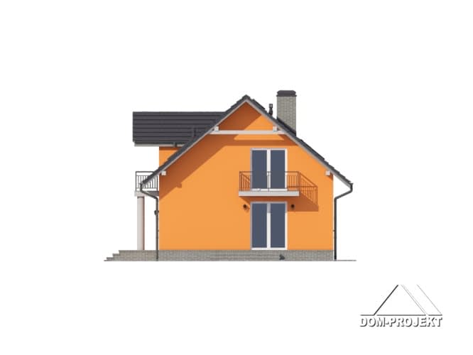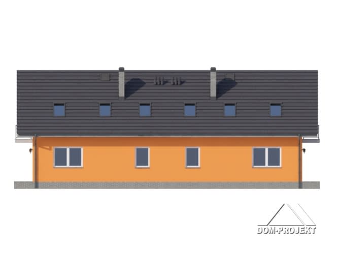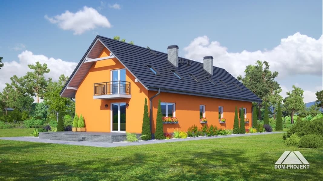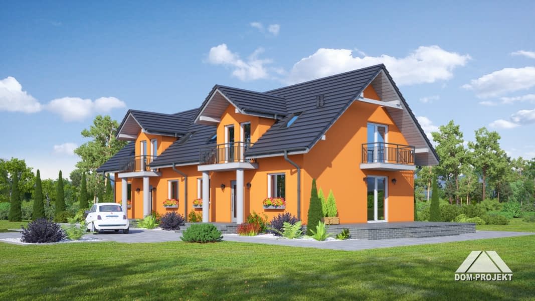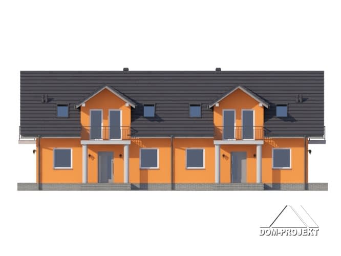 Dom jednorodzinny z dwoma lokalami mieszkalnymi. Każdy lokal: duży salon z aneksem kuchennym, kominkiem, wyjściem na taras. Pokój, łazienka, wc, korytarz, wiatrołap. Na poddaszu trzy pokoje, dwie łazienki, dwa balkony i komunikacja. Prosta bryła budynku i dach dwuspadowy sprzyjają szybkiej i taniej budowie i niskim kosztom eksploatacji.Rzuty