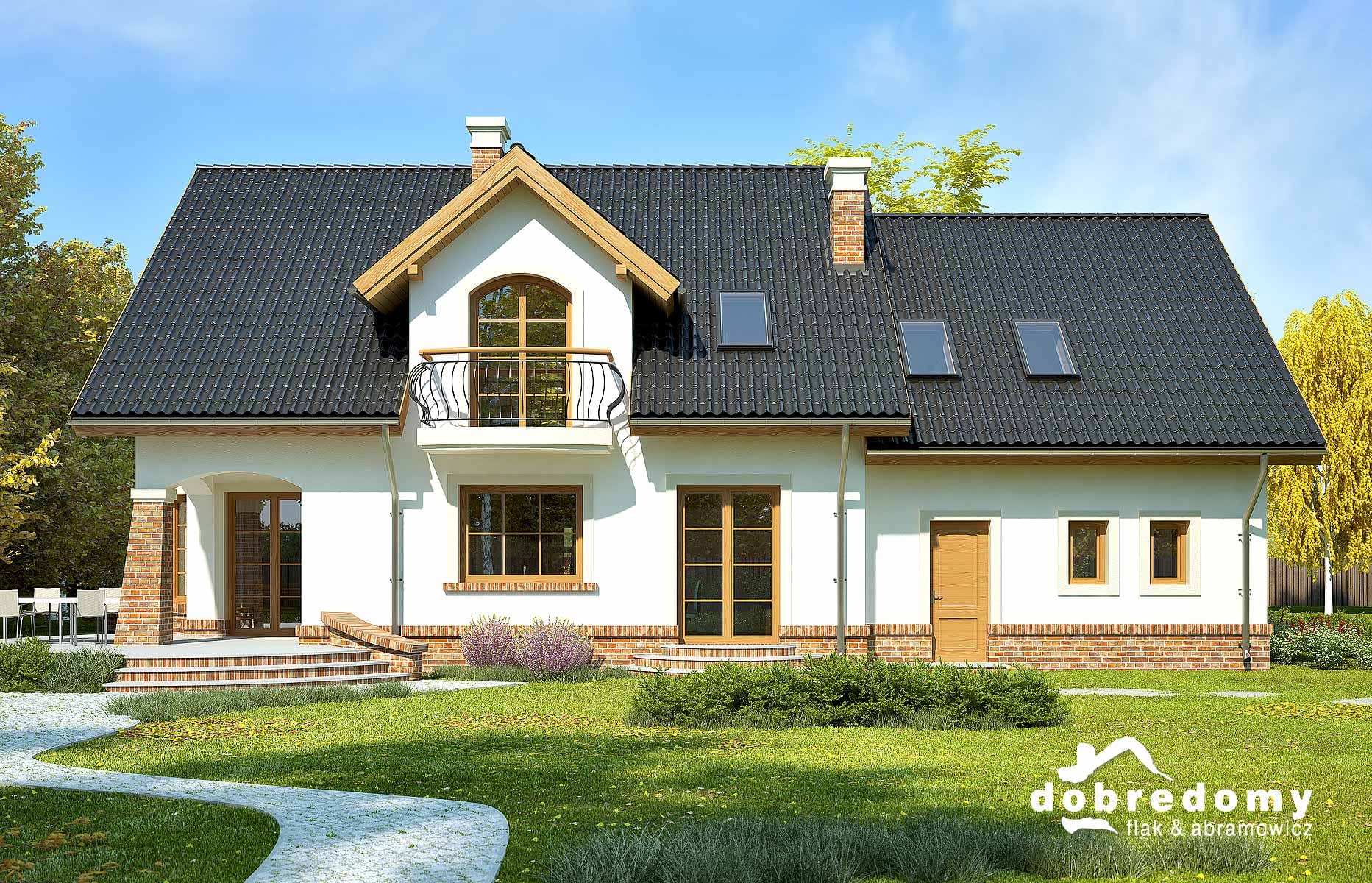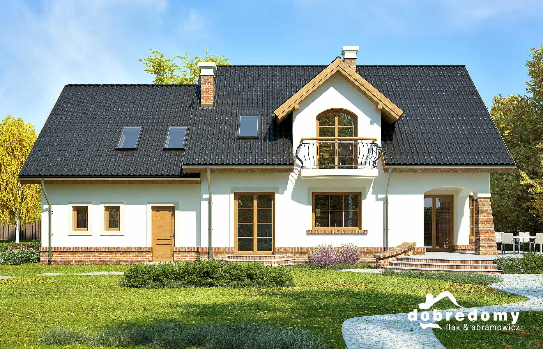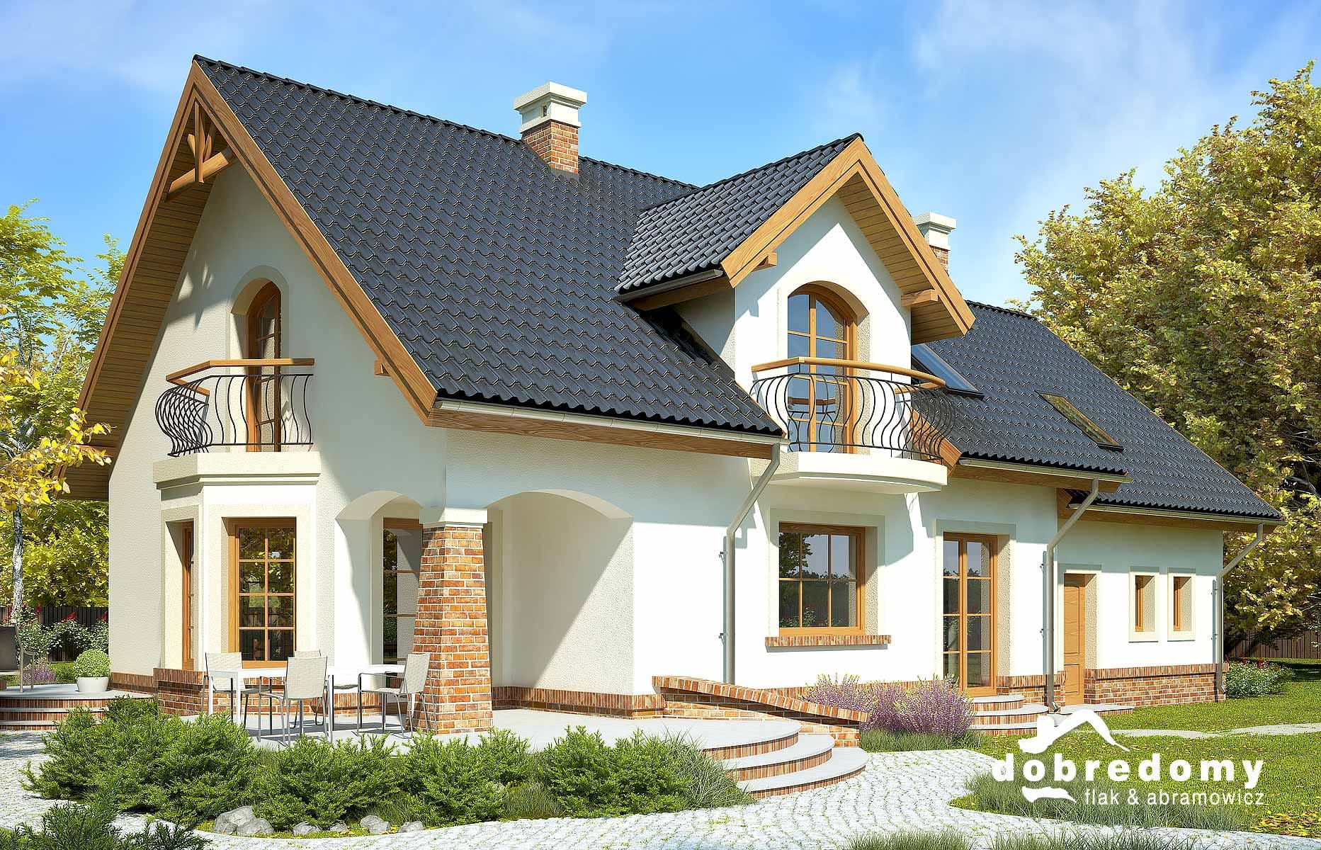 Elewacje pokryte tynkiem strukturalnym w systemie ociepleń Termo Organika i okładziną klinkierową. Pokrycie dachu - dachówka ceramiczna lub cementowa CREATON.