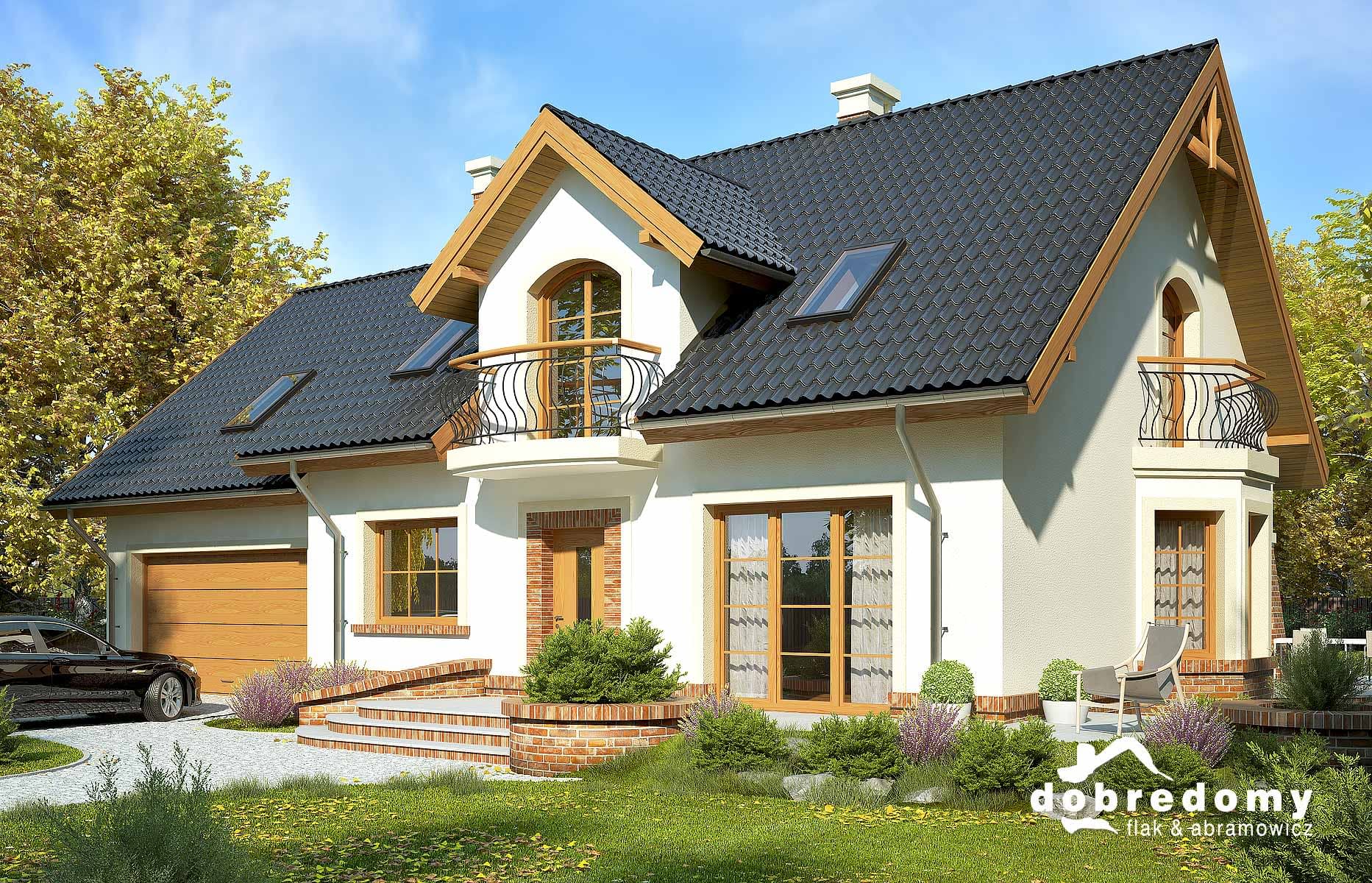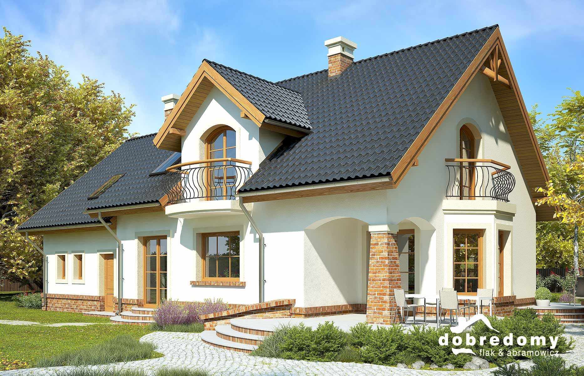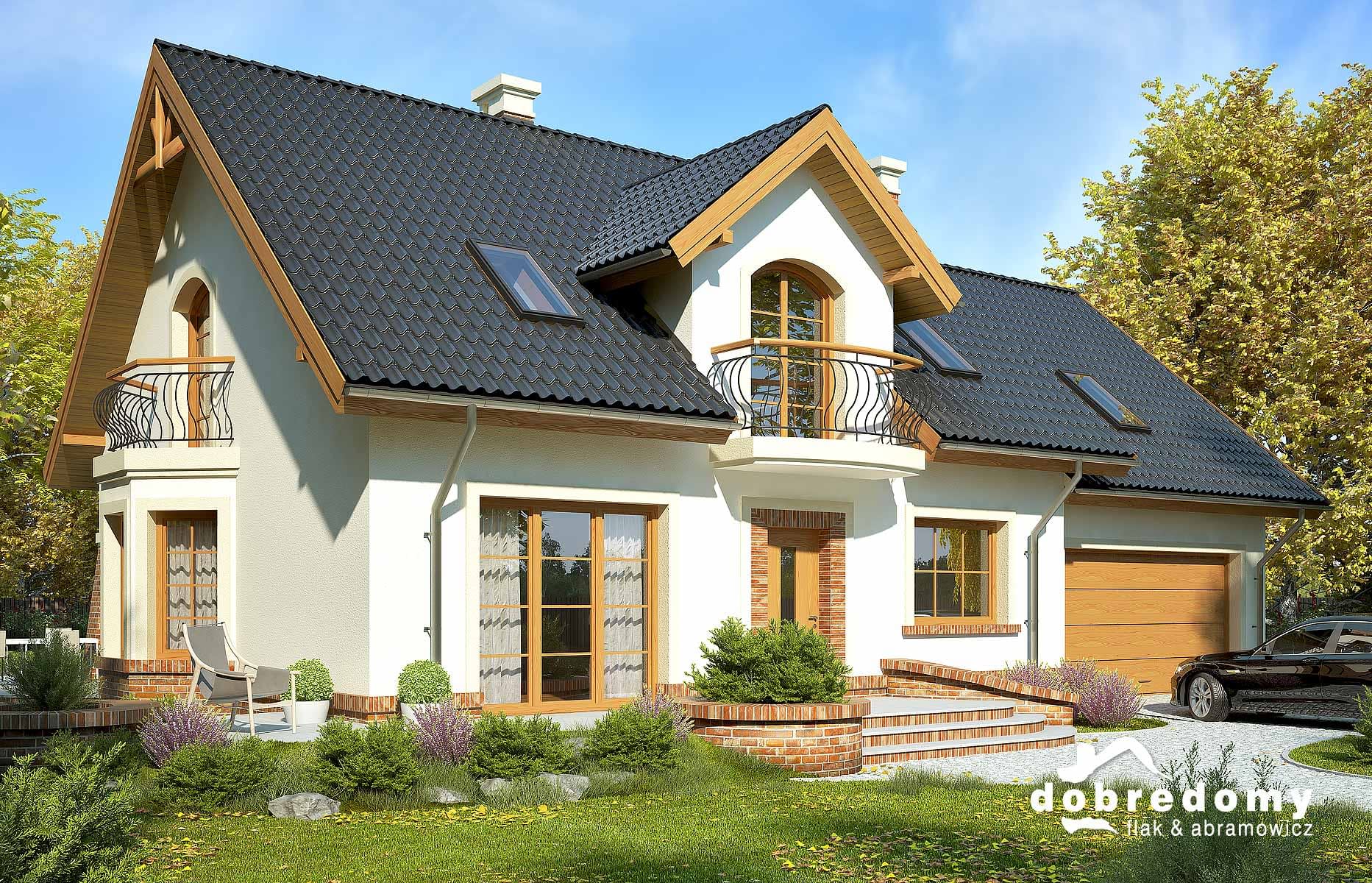 Elewacje pokryte tynkiem strukturalnym w systemie ociepleń Termo Organika i okładziną klinkierową. Pokrycie dachu - dachówka ceramiczna lub cementowa CREATON.
