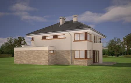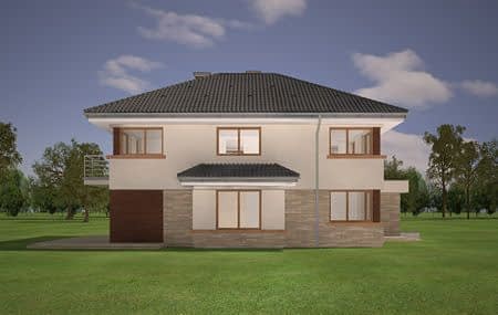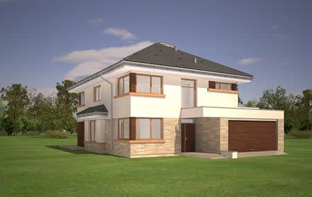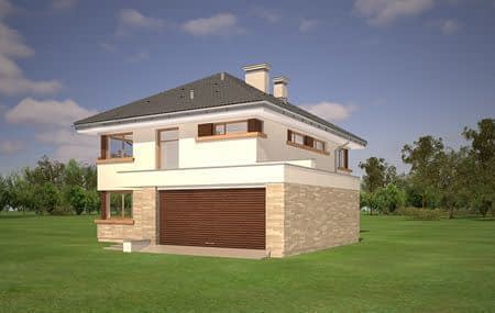 Projekt domu Helios to uroczy piętrowy domek dla cztero-pięcioosobowej rodziny. Jest to propozycja dla Inwestorów lubiących domy w nowoczesnej architekturze, którzy nie rezygnują z funkcjonalności i komfortu swojego domu. Piętrowa bryła budynku została przekryta czterospadowym dachem, a wbudowany częściowo garaż zwieńczono dachem płaskim. Dobrze dobrane detale architektoniczne, ciekawie rozmieszczone okna, drewniane i ceglane okładziny na ścianach - wszystko to tworzy atrakcyjny wygląd zewnętrzny domu. Wnętrze to otwarta część dzienna na parterze, z salonem, holem z ładnie wkomponowanymi schodami, jadalnią i kuchnią, oraz sypialnie na piętrze domu. Na parterze w domu Helios zaprojektowano dodatkowy pokój - gabinet lub sypialnię gościnną, oraz garaż z kotłownią. Na piętrze znajduje się apartament rodziców z własną łazienką i garderobą, sypialnie dziecięce z łazienką, oraz dodatkowy pokój. Pracownia posiada wersję odbicia lustrzanego projektu domu Helios. Zapraszamy do zapoznania się z pełną ofertą pracowni MG Projekt: projekt domu Helios wariant C, projekt domu Helios wariant D, projekt domu Helios wariant E, projekt domu Helios wariant J, projekt domu Helios wariant F, projekt domu Helios wariant I, projekt domu Helios wariant B, projekt domu Helios wariant H.