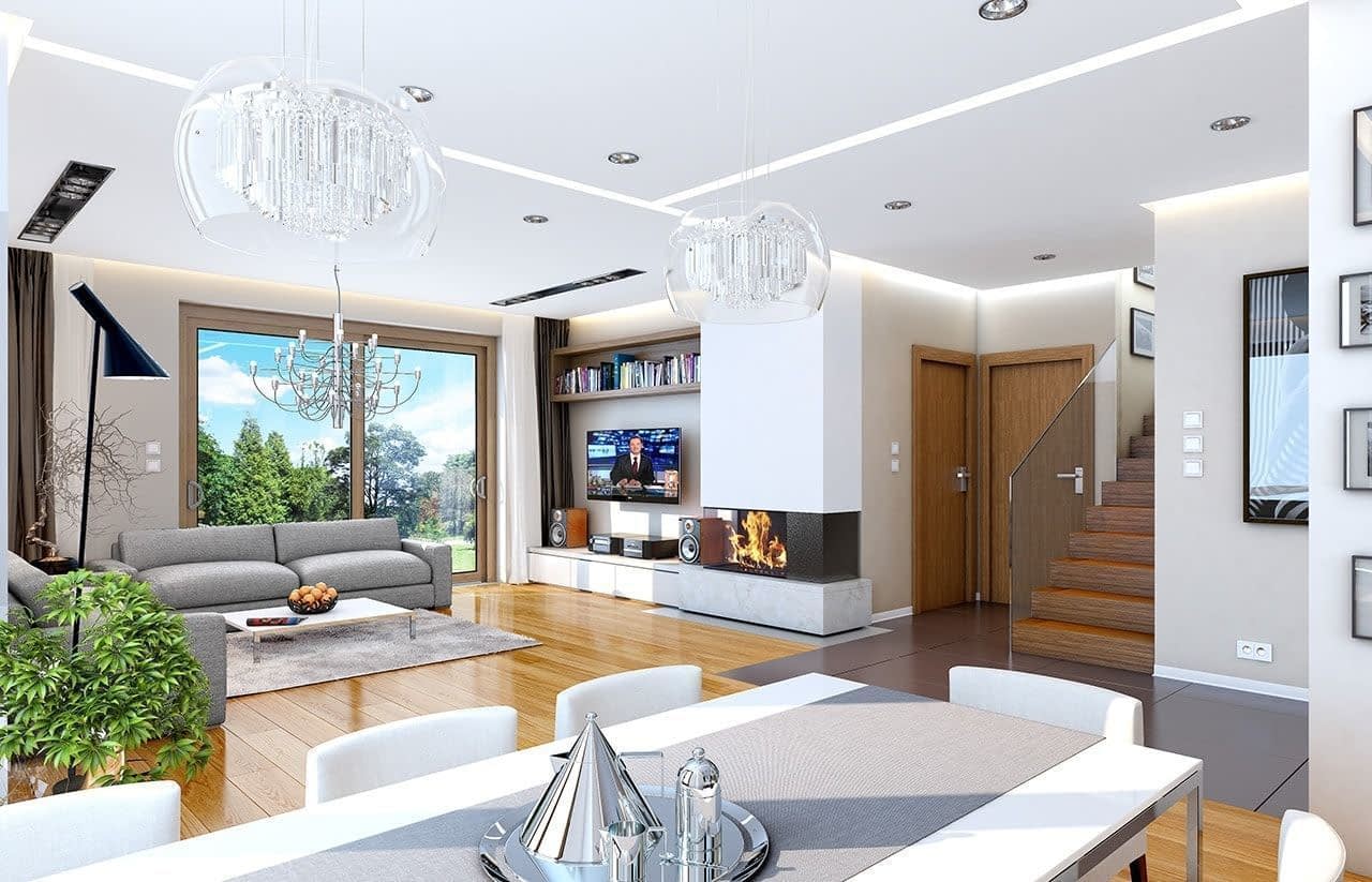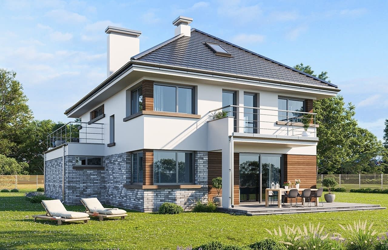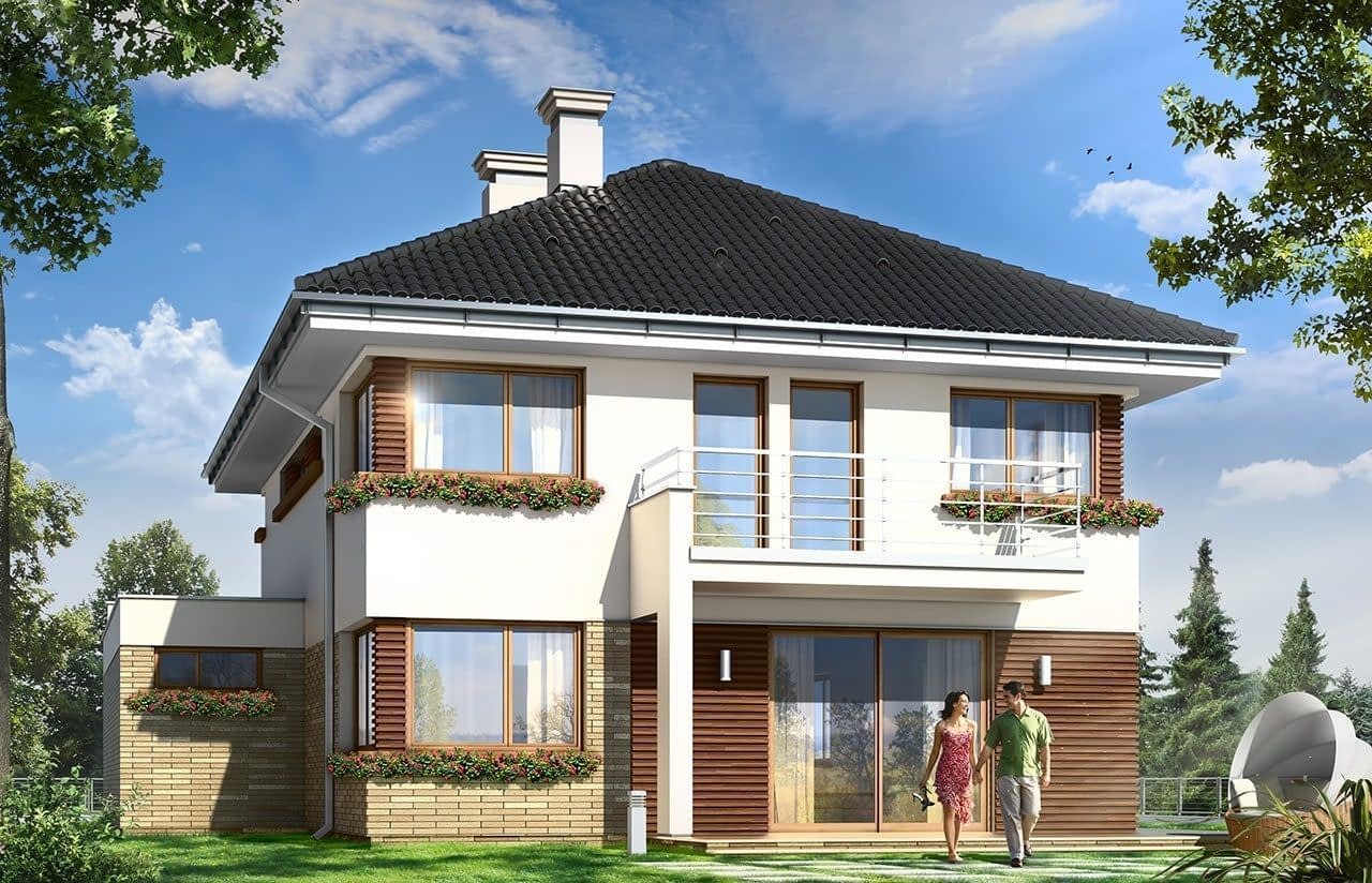 Projekt domu Helios to uroczy piętrowy domek dla cztero-pięcioosobowej rodziny. Jest to propozycja dla Inwestorów lubiących domy w nowoczesnej architekturze, którzy nie rezygnują z funkcjonalności i komfortu swojego domu. Piętrowa bryła budynku została przekryta czterospadowym dachem, a wbudowany częściowo garaż zwieńczono dachem płaskim. Dobrze dobrane detale architektoniczne, ciekawie rozmieszczone okna, drewniane i ceglane okładziny na ścianach - wszystko to tworzy atrakcyjny wygląd zewnętrzny domu. Wnętrze to otwarta część dzienna na parterze, z salonem, holem z ładnie wkomponowanymi schodami, jadalnią i kuchnią, oraz sypialnie na piętrze domu. Na parterze w domu Helios zaprojektowano dodatkowy pokój - gabinet lub sypialnię gościnną, oraz garaż z kotłownią. Na piętrze znajduje się apartament rodziców z własną łazienką i garderobą, sypialnie dziecięce z łazienką, oraz dodatkowy pokój. Pracownia posiada wersję odbicia lustrzanego projektu domu Helios. Zapraszamy do zapoznania się z pełną ofertą pracowni MG Projekt: projekt domu Helios wariant C, projekt domu Helios wariant D, projekt domu Helios wariant E, projekt domu Helios wariant J, projekt domu Helios wariant F, projekt domu Helios wariant I, projekt domu Helios wariant B, projekt domu Helios wariant H.