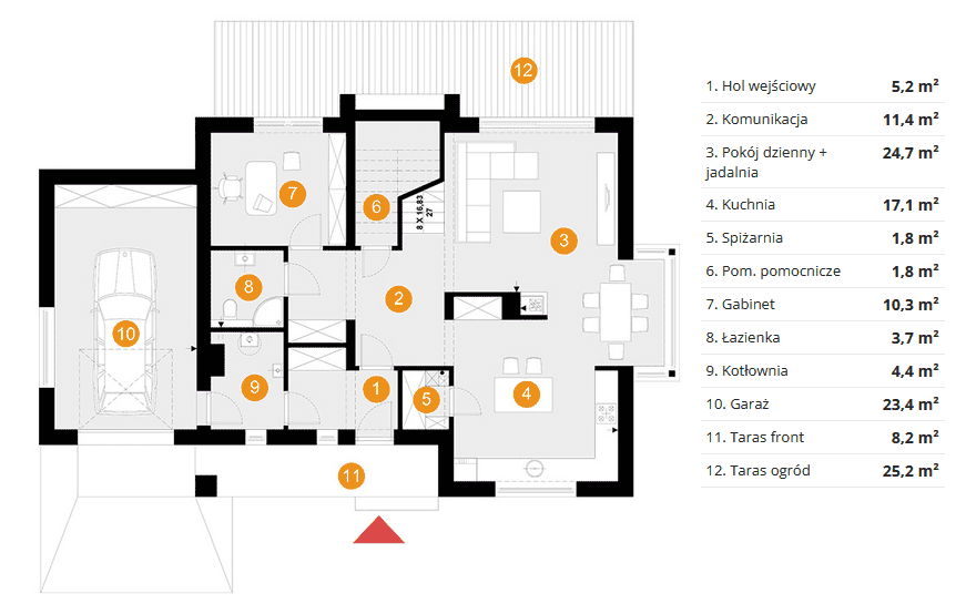 Henryk I to projekt dedykowany 4-osobowej rodzinie. Wnętrze domu jest podzielone na dwie strefy, dzienną na parterze i sypialną na poddaszu. Parter dzięki dużym przeszkleniom pełen jest naturalnego światła i zdaje się być przestronniejszy niż w rzeczywistości. Architektura tej części domu jest przemyślana i nowatorska, co sprzyja ergonomii i pozwala na samodzielną aranżację wnętrza. Sypialnie zlokalizowane na poddaszu pomimo skosów są przestrzenne, a dzięki zastosowanym oknom dachowym odpowiednio doświetlone. Na ciekawą aranżację otoczenia zewnętrznego pozwalają tarasy i balkony usytuowane na różnych poziomach budynku. Projekt dobrze komponuje się zarówno na działce miejskiej jak i w otoczeniu wiejskim.