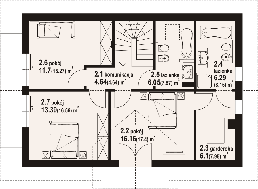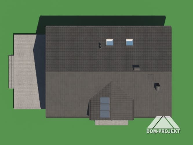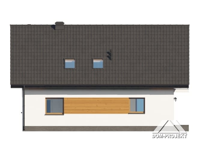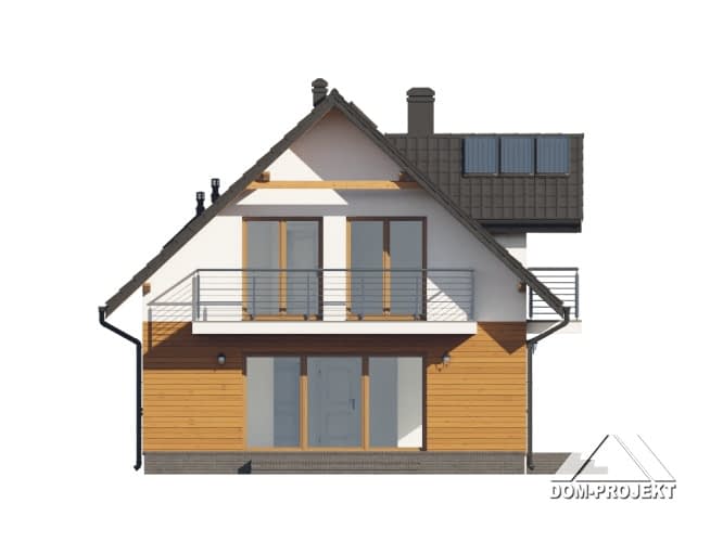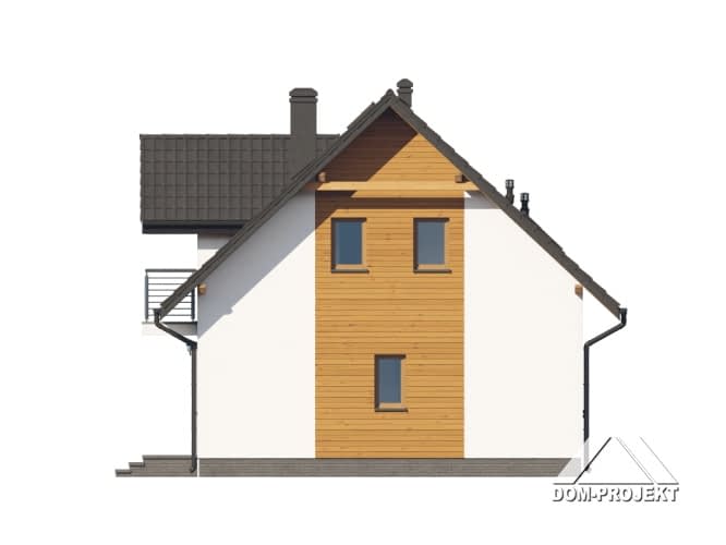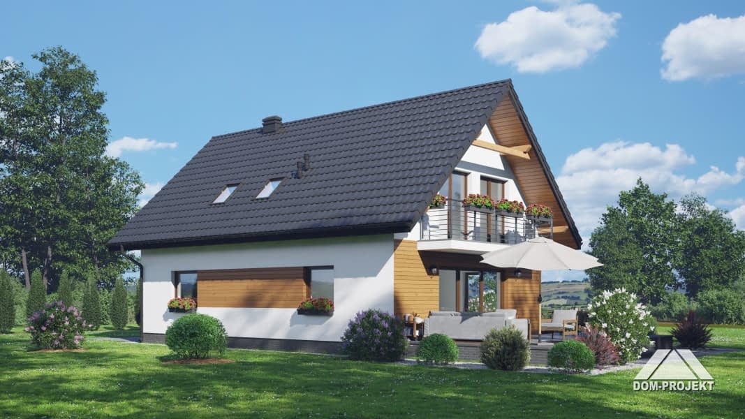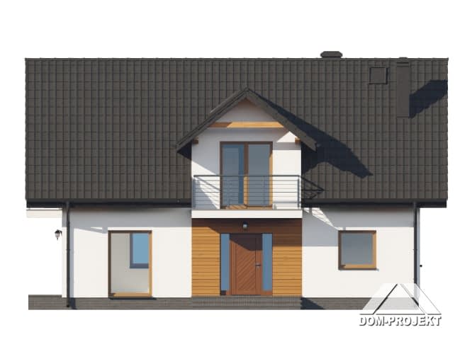 Dom z poddaszem użytkowym. Na parterze salon z aneksem kuchennym oraz wyjściem na taras. Pokój z własną łazienką, wc, wiatrołap, kotłownia. Na poddaszu trzy pokoje, dwie łazienki, garderoba, komunikacja, dwa balkony. Zwarta bryła budynku oraz dach dwuspadowy sprzyjają szybkiej i taniej budowie oraz niskim kosztom eksploatacji.Rzuty