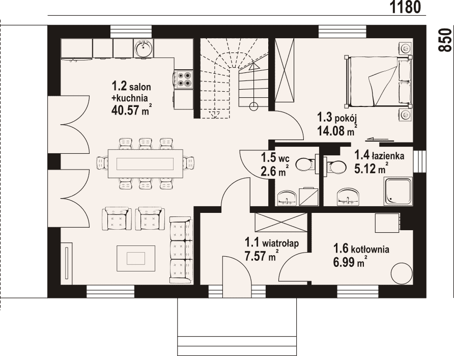 - 1.2 - kuchnia, salon40.57 m²
