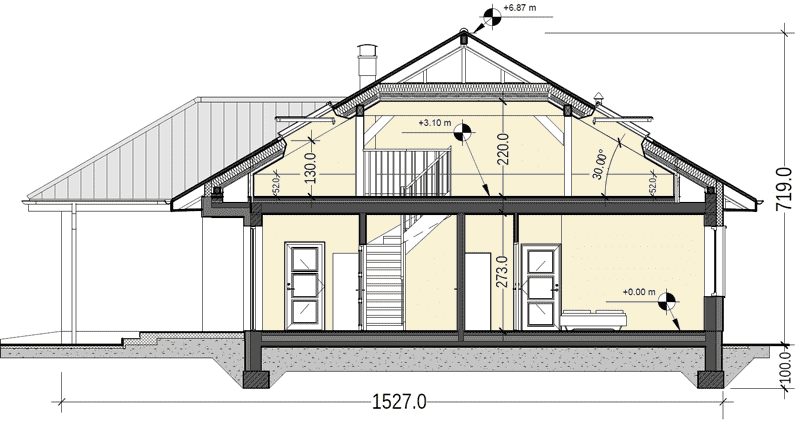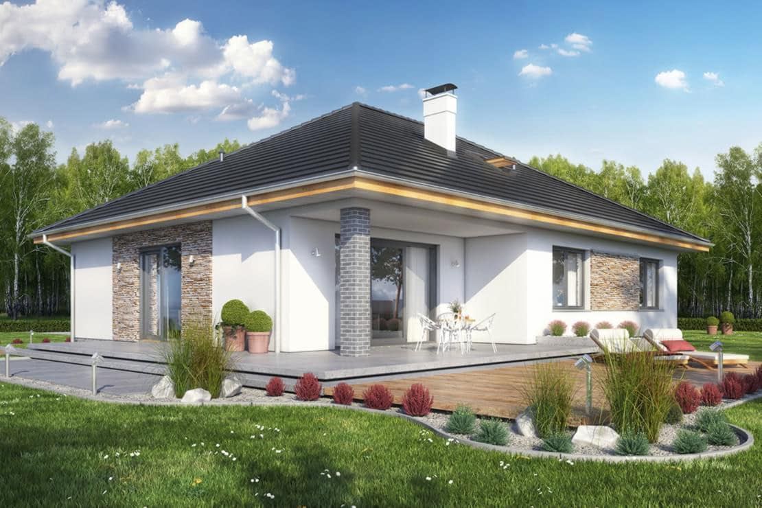 Posadowienie bezpośrednie na zbrojonych ławach i stopach fundamentowych wykonanych z betonu B 20. Ściany fundamentowe: murowane z bloczków betonowych M6. Ściany zewnętrzne: bloczki gazobetonowe gr. 25cm na zaprawie systemowej, ciepłochronnej, ocieplony styropianem fasadowym gr. 15cm. Do ocieplenia budynku zaprojektowano użycie styropianu grafitowego gr. 15 cm, o współczynniku „lambda” nie przekraczającym 0,035 W(mK) i „oporze cieplnym” nie mniejszym niż Rd – 4,0 m2k/W. Zastosowanie materiałów budowlanych (ocieplenie ścian, dachu, podłogi na gruncie, okien i drzwi zewnętrznych) użytych w projekcie odpowiada nowym wymaganiom obowiązującym od stycznia 2021 roku (WT2021). Ściany nośne wewnętrzne: bloczki gazobetonowe gr. 25cm na zaprawie cementowo-wapiennej lub systemowej. Ściany wewnętrzne działowe: bloczki gazobetonowe gr. 12cm. Strop gęstożebrowy z wypełnieniem pustakami betonowymi, zalewany wraz z wieńcami betonem B 20. Konstrukcja dachu: drewniana, drewno klasy C24, więźba dachowa o układzie krokwiowo-płatwiowym, z podparciem płatwi słupami, pochylenie połaci dachowych 30 stopni. Budynek, w wersji podstawowej, jest zaprojektowany z pomieszczeniem kotłowni wyposażonej w kocioł ekologiczny na paliwo stałe „pellet” i spełnia wszystkie wymagania dotyczące WT2021. Na etapie adaptacji projektu jest możliwość zaprojektowania ogrzewania gazowego ze wspomaganiem instalacją solarną lub ogrzewania nowoczesną pompa ciepła typu powietrze – woda. Projekt pod względem konstrukcyjnym spełnia normy zgodne z Eurokodami.