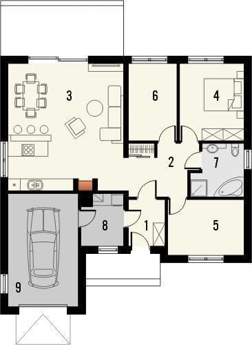 Darmowy zielony pakiet do projektu oznacza, że w tej samej cenie można otrzymać wariant z ogrzewaniem przy zastosowaniu ekologicznej pompy ciepła powietrze-woda i podłogówką we wszystkich pomieszczeniach, zamiast standardowego pieca gazowego zasilającego stalowe grzejniki płytowe.