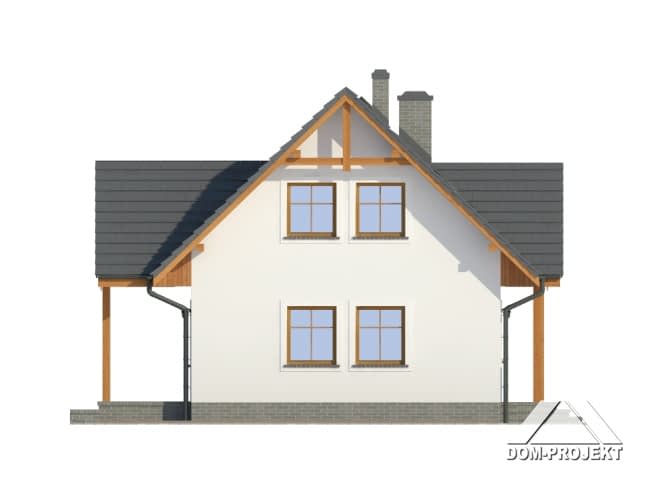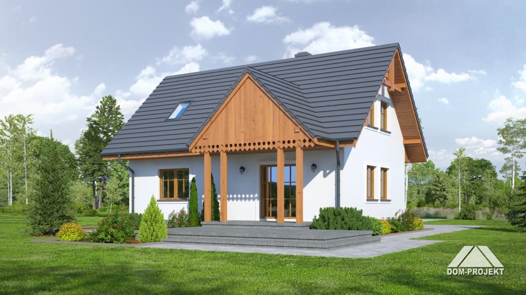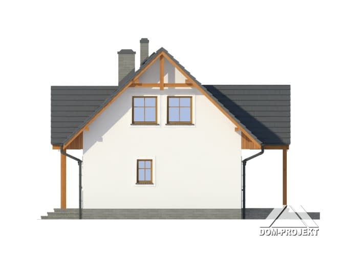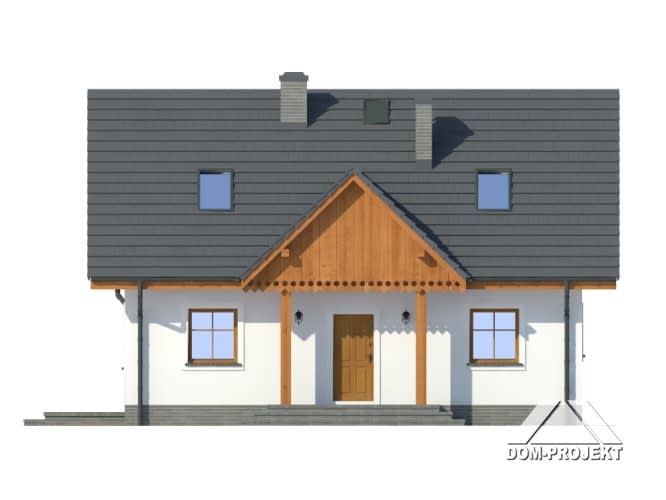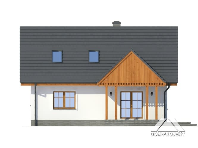 Dom z poddaszem. Duży salon z aneksem kuchennym, kominkiem, wyjściem na zadaszony taras i schodami na poddasze. Pokój, łazienka, kotłownia i wiatrołap. Na poddaszu trzy pokoje, łazienka i komunikacja. Zwarta bryła budynku i dach dwuspadowy sprzyjają taniej budowie i niskim kosztom eksploatacji.Rzuty