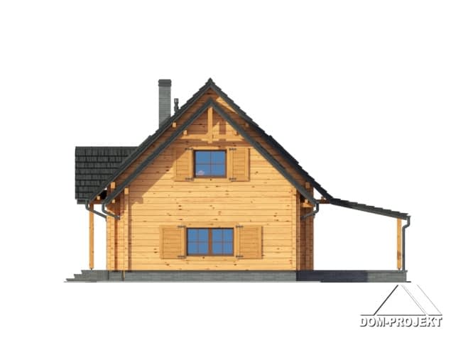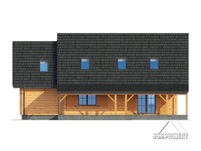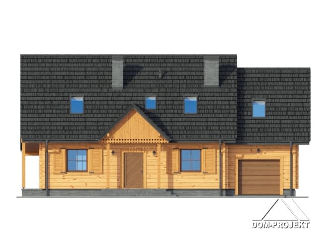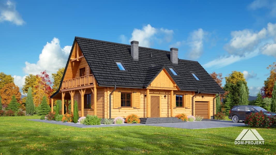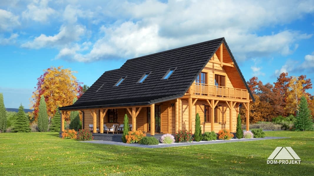 Dom drewniany z bali. Duży salon z aneksem kuchennym, kominkiem, wyjściem na zadaszony taras i schodami na poddasze. Pokój, łazienka, wc, wiatrołap, kotłownia, garaż. Na poddaszu trzy pokoje, dwie łazienki, balkon, komunikacja i strych. Prosta bryła budynku i dach dwuspadowy sprzyjają szybkiej i taniej budowie i niskim kosztom eksploatacji.Rzuty