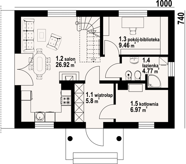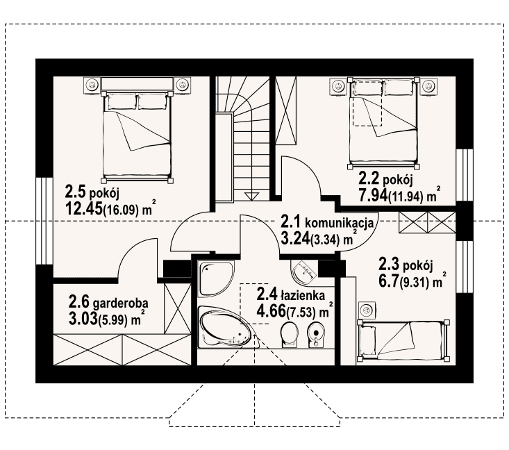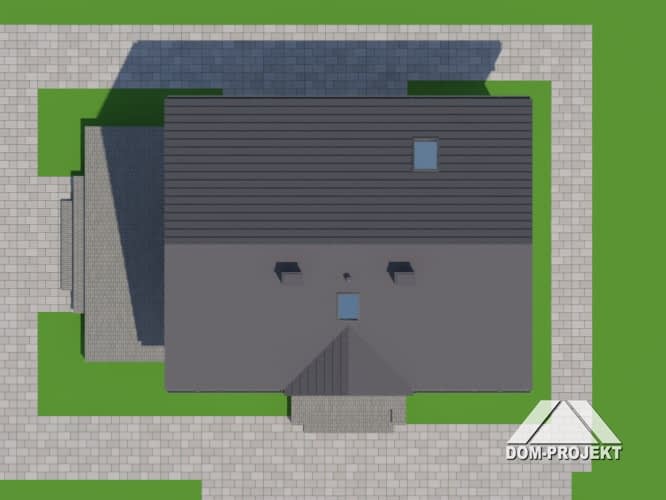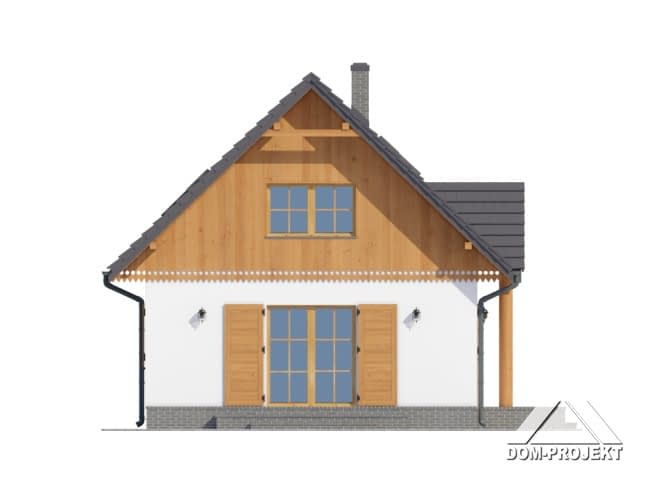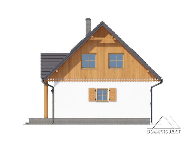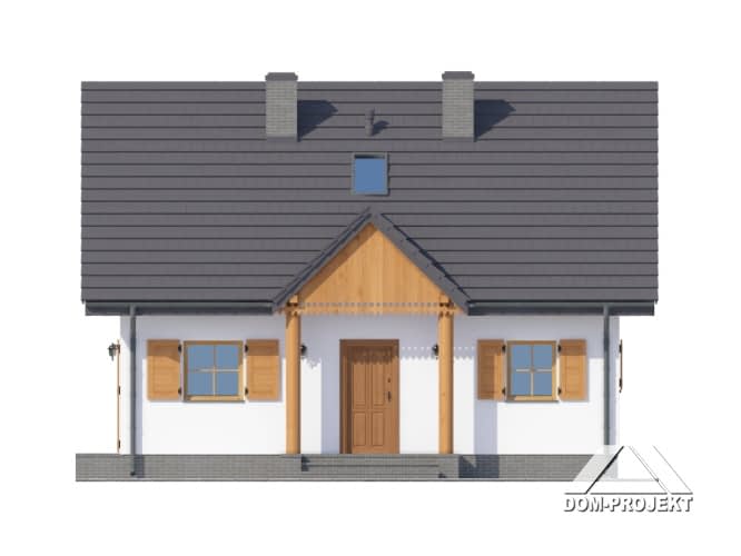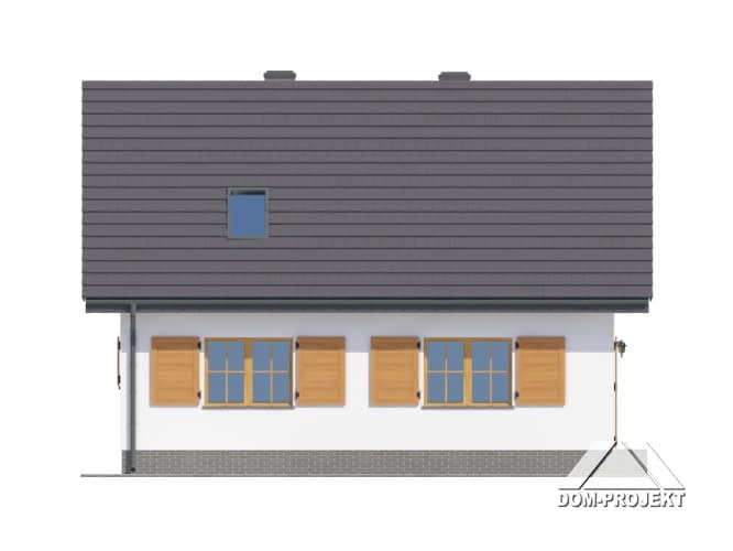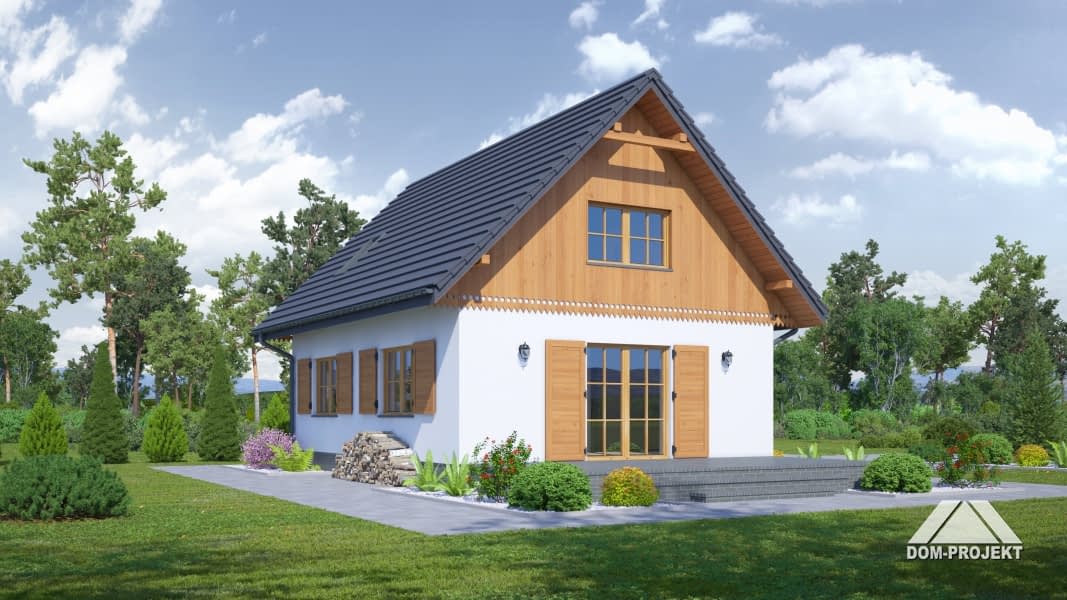 Dom z poddaszem użytkowym. Salon z aneksem kuchennym, kominkiem, wyjściem na taras i schodami na poddasze. Pokój, łazienka, kotłownia i wiatrołap z miejscem na szafy. Na poddaszu trzy pokoje, łazienka, garderoba i komunikacja. Zwarta bryła budynku i dach dwuspadowy sprzyjają szybkiej i taniej budowie i niskim kosztom eksploatacji.Rzuty