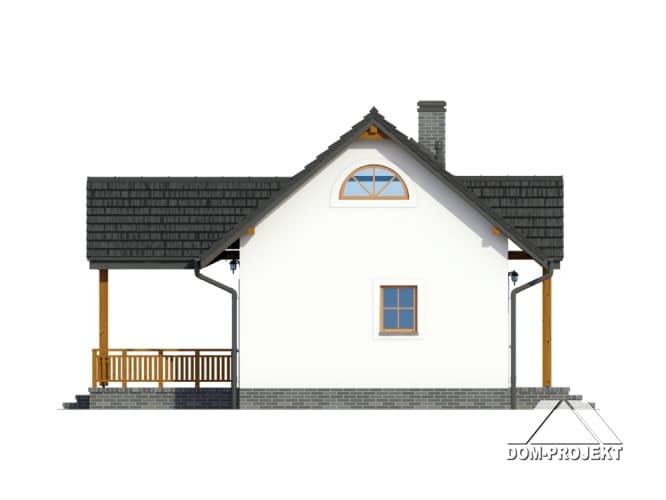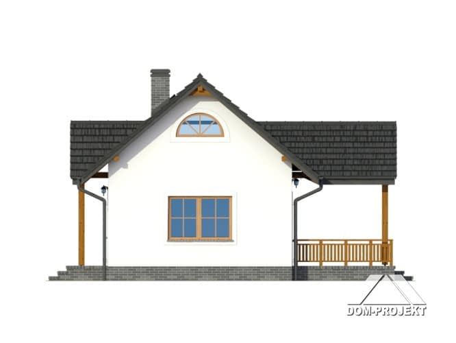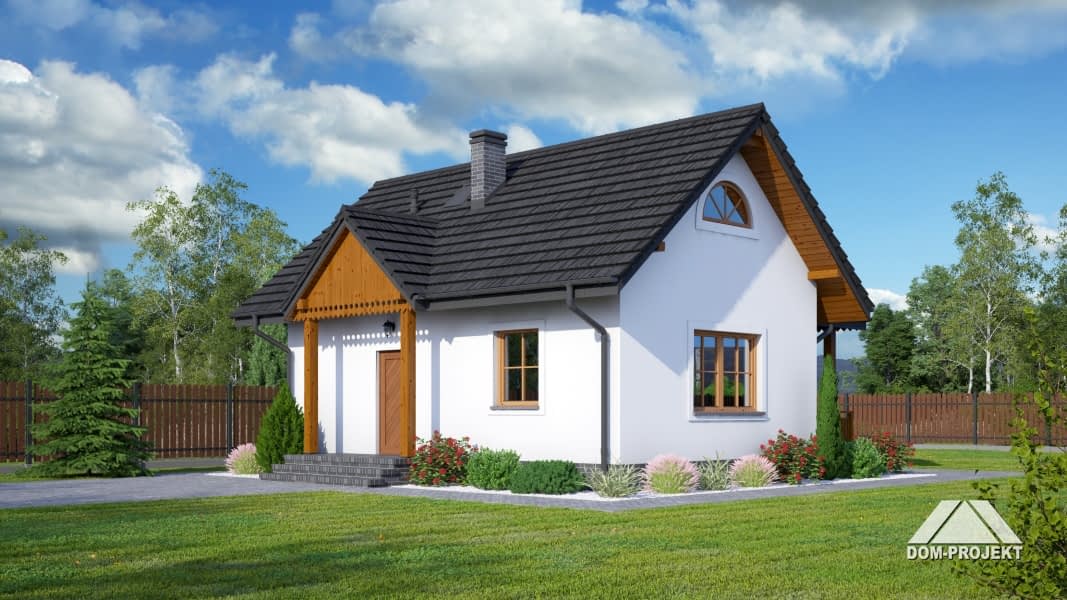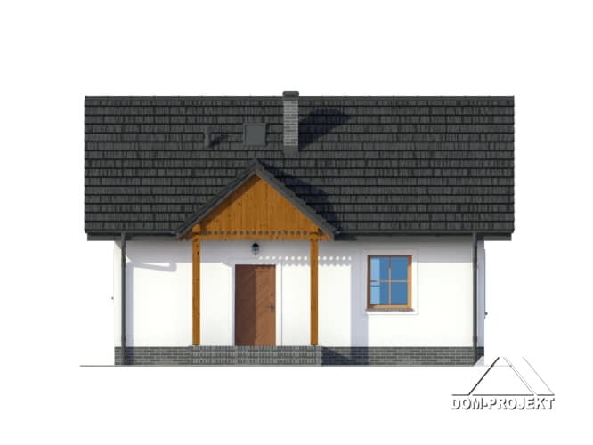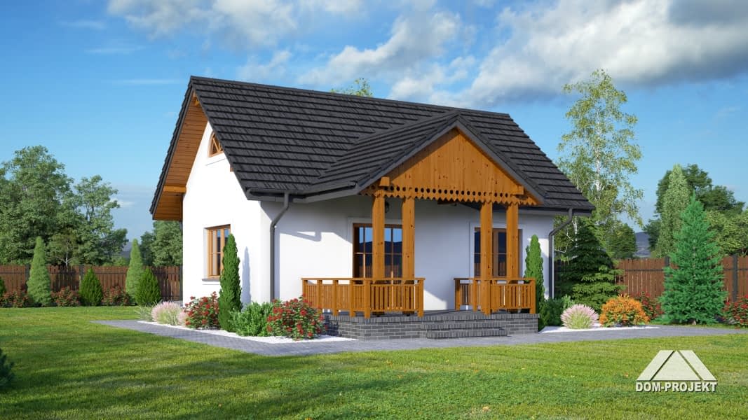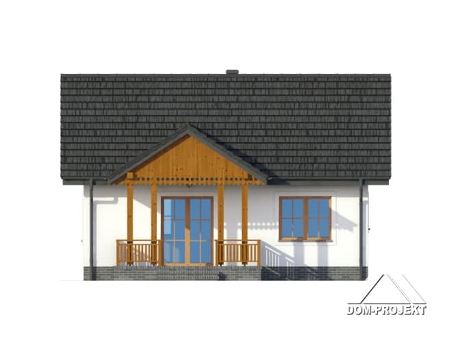 Dom w konstrukcji szkieletu drewnianego. Duży salon z aneksem kuchennym, kominkiem i wyjściem na duży i zadaszony taras. Pokój, łazienka, wiatrołap.Zwarta bryła budynku i dach dwuspadowy sprzyjają taniej i szybkiej realizacji i niskim kosztom eksploatacji.Rzuty