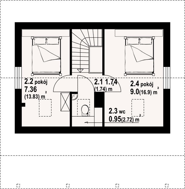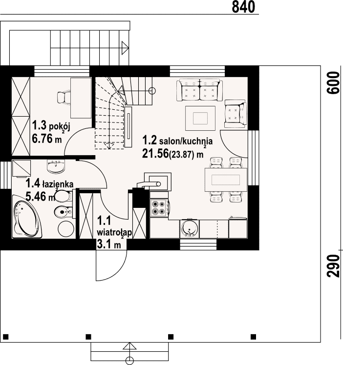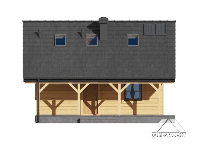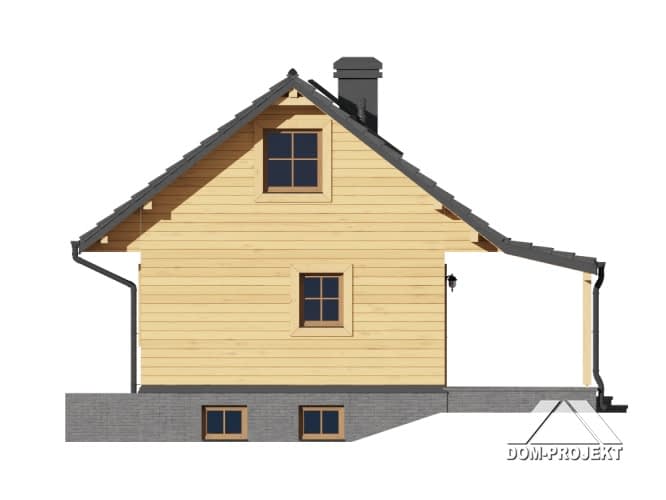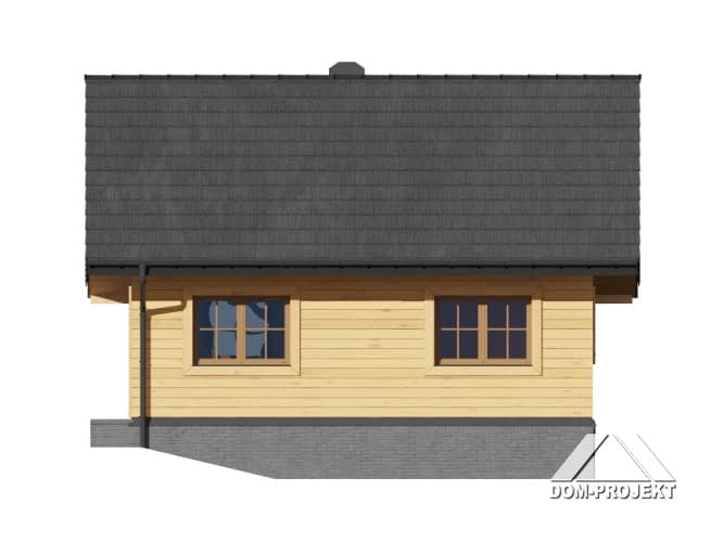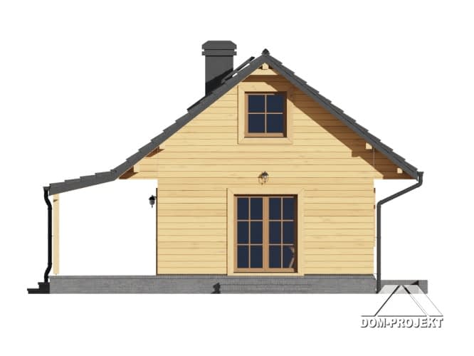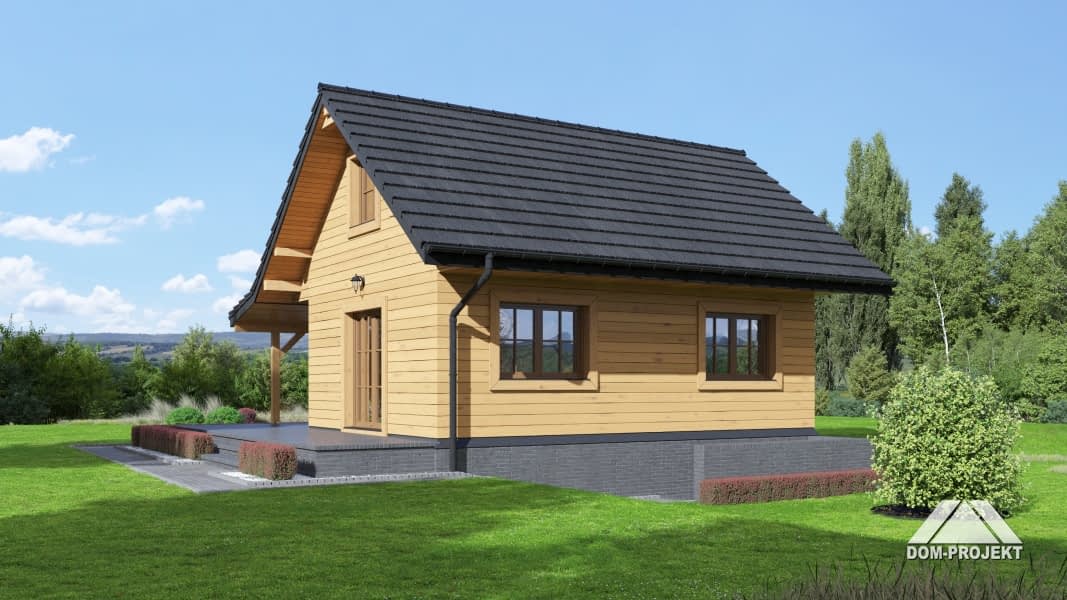 Nieduży dom w konstrukcji szkieletu drewnianego. Częściowo podpiwniczony. Na parterze salon z aneksem kuchennym, kominkiem oraz wyjściem na taras. Pokój, łazienka oraz wiatrołap. Na poddaszu dwa pokoje, wc i komunikacja. Zwarta bryła budynku i dach dwuspadowy sprzyjają szybkiej i taniej budowie oraz niskim kosztom eksploatacji.Rzuty