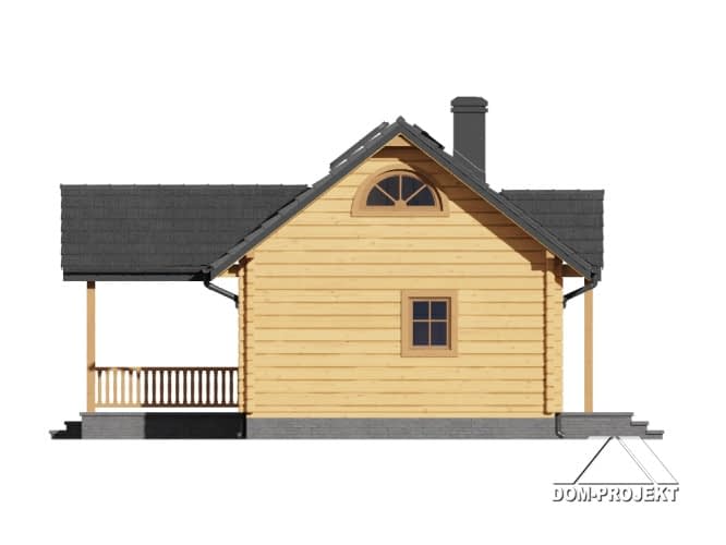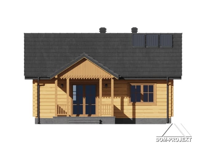 Mały dom parterowy –konstrukcja drewniana z bali. Dom mieszkalny lub letniskowy. Dwa pokoje, aneks kuchenny, łazienka, wiatrołap, duży zadaszony taras. W salonie kominek i schody składane na poddasze (możliwość wykorzystania poddasza na cele gospodarcze lub dodatkowe spanie w lecie).Dom łatwy i tani w budowie i tani w eksploatacji.Rzuty