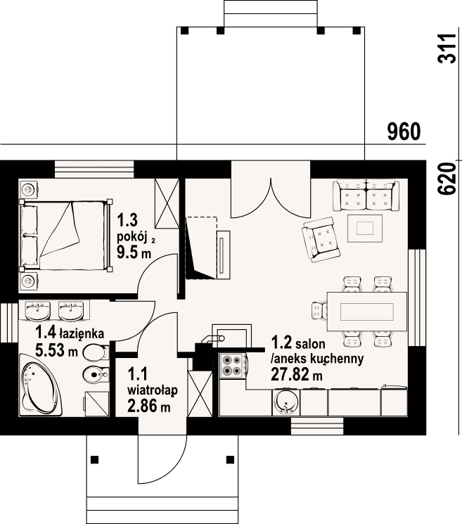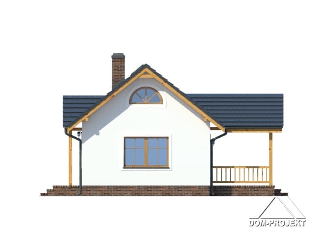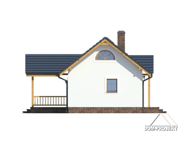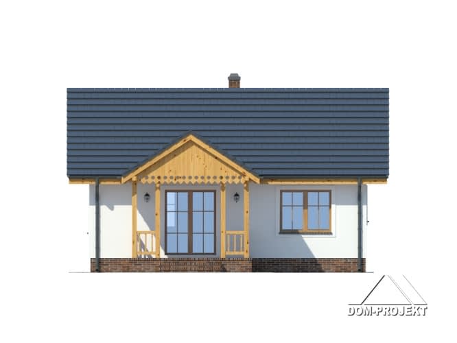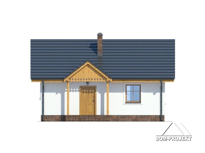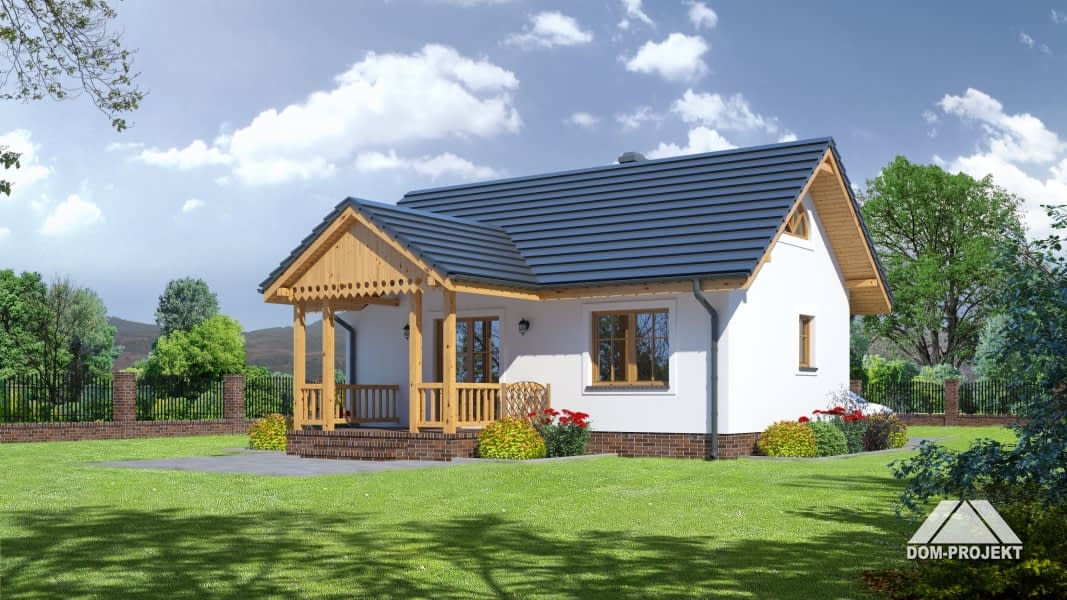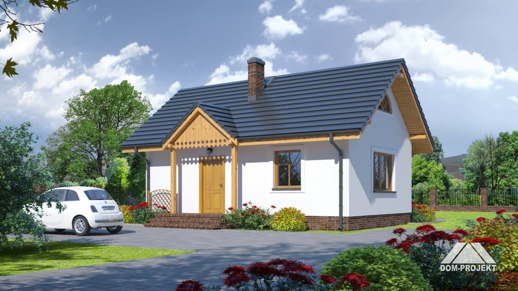 Dom mały, tani w realizacji i ekonomiczny w późniejszymi użytkowaniu. Może być on także domem letniskowym. Na program składają się: salon z aneksem kuchennym, pokój-sypialnia i łazienka. Zadaszony, duży taras i kominek w salonie. Na nieużytkowym poddaszu strych dostępny schodami składanymi.Rzuty