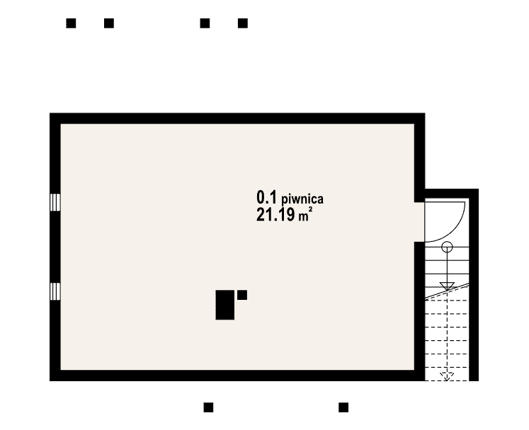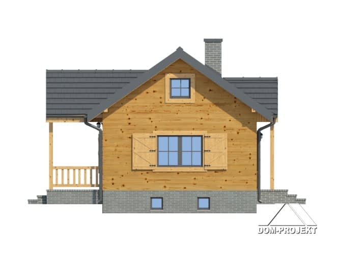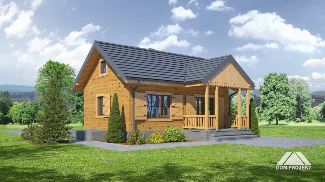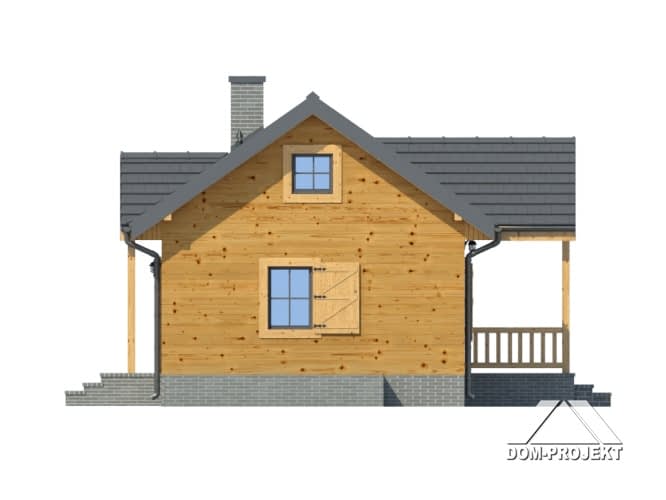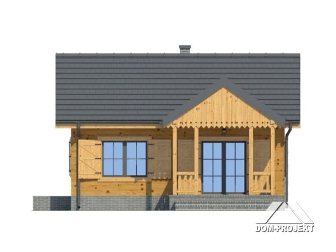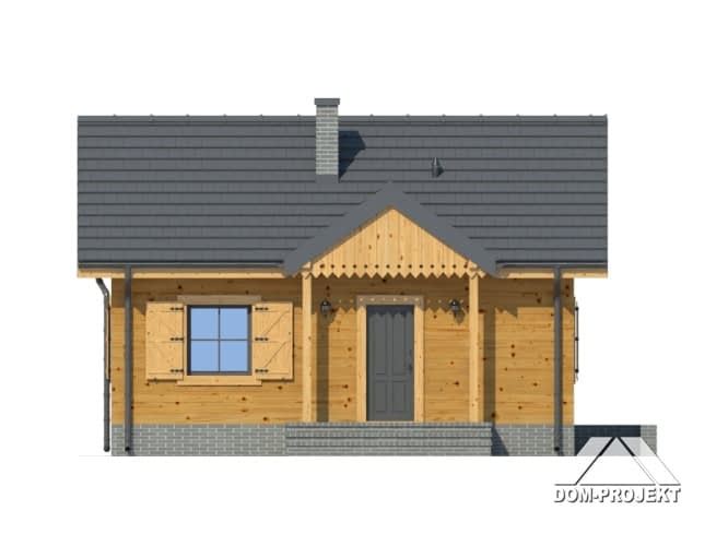 Mały dom w konstrukcji szkieletu drewnianego. Wiatrołap z miejscem na szafę. Salon z aneksem kuchennym, kominkiem i wyjściem na taras. Taras zadaszony. Pokój, łazienka.Podpiwniczenie dostępne schodami na zewnątrz domu. Zwarta bryła budynku i dach dwuspadowy sprzyjają taniej i szybkiej budowie i niskim kosztom eksploatacji.Rzuty