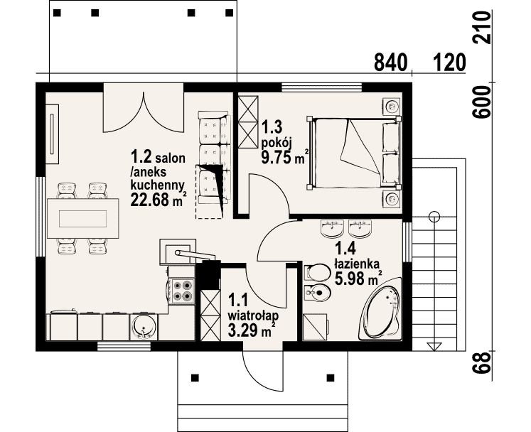 - 1.2 - salon z aneksem kuchennym22.68 m²