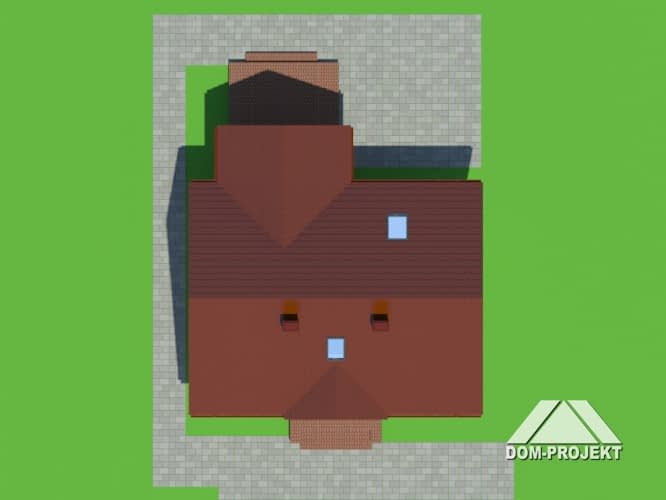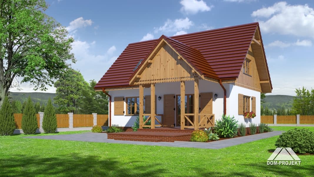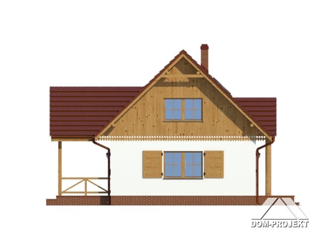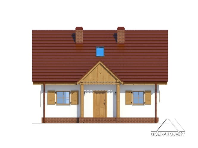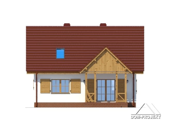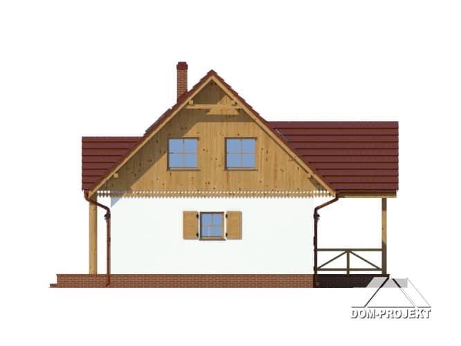 Dom z poddaszem użytkowym. Na parterze salon z kuchnią, kominkiem, wyjściem na zadaszony taras i schodami na poddasze. Pokój-biblioteka, łazienka, kotłownia, wiatrołap. Na poddaszu dwa pokoje, dwie garderoby, łazienka, komunikacja. Zwarta bryła budynku oraz dach dwuspadowy sprzyjają szybkiej i taniej budowie oraz niskim kosztom eksploatacji.Rzuty