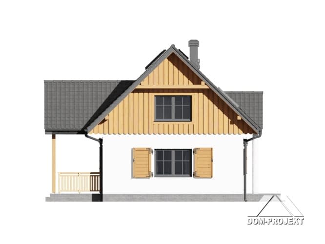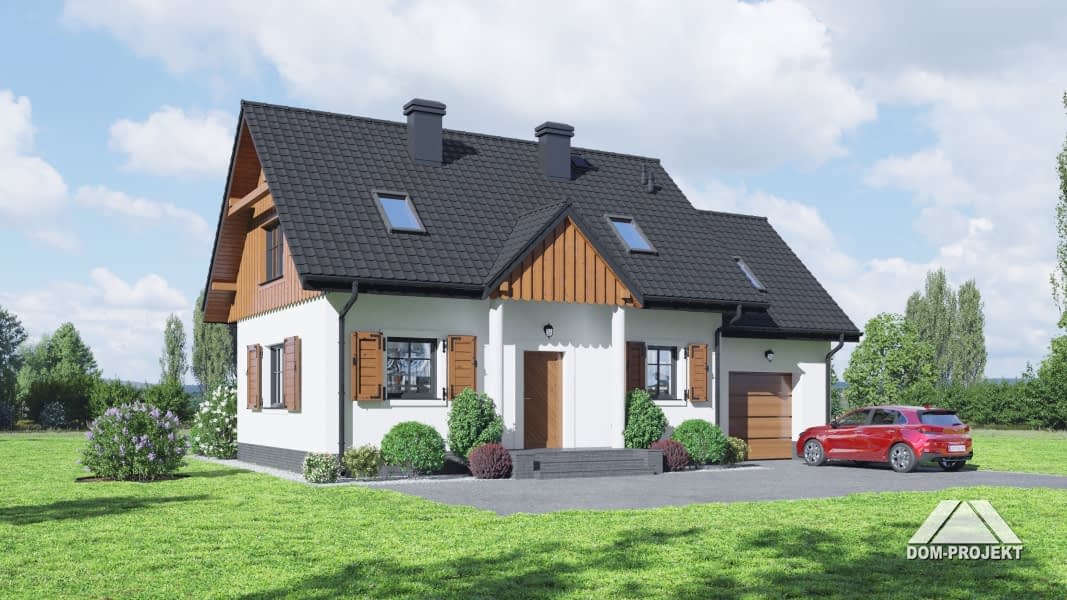 Nieduży dom, w którym na parterze na wspólnej przestrzeni znajduje się salon i aneks kuchenny. Z salonu wyjście na zadaszony taras. Pokój-biblioteka, łazienka i kotłownia uzupełniają program parteru. Na poddaszu zaprojektowano strefę nocną z trzema sypialniami, dwiema garderobami i łazienką. Program budynku uzupełnia jednostanowiskowy garaż.Rzuty