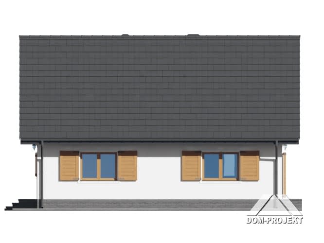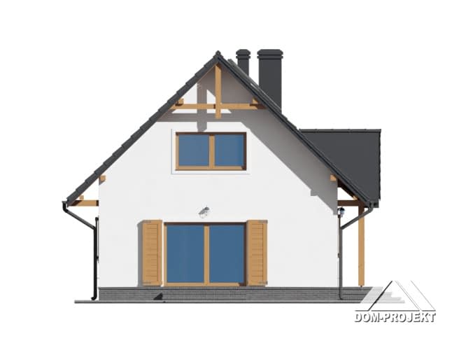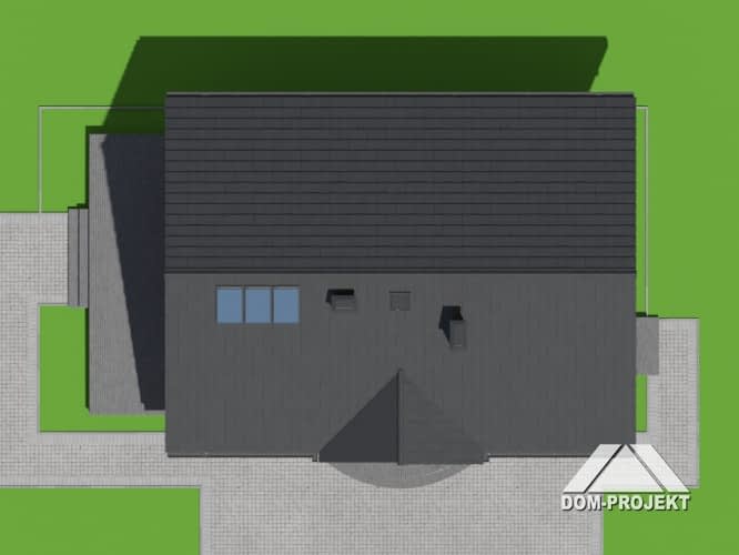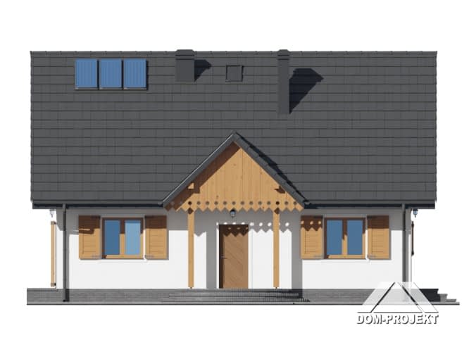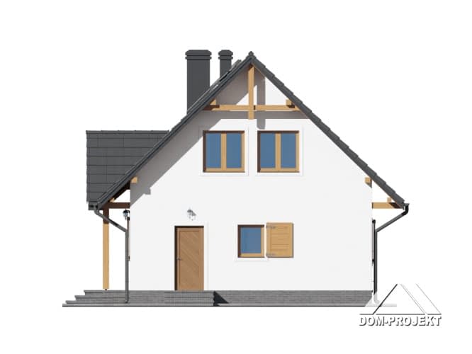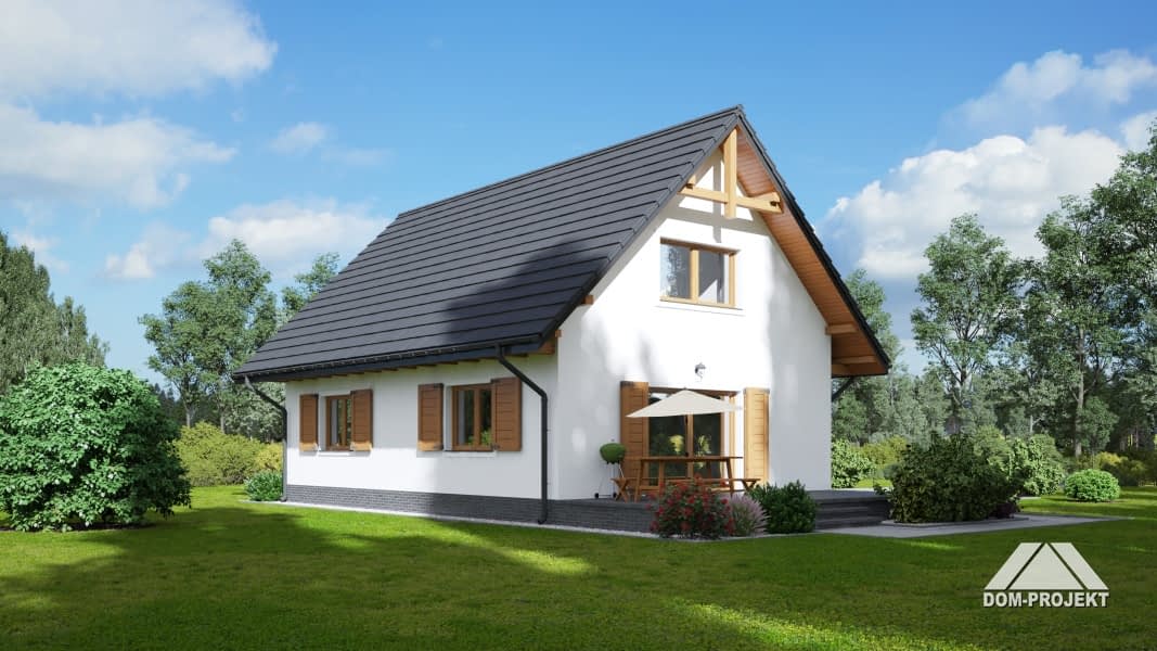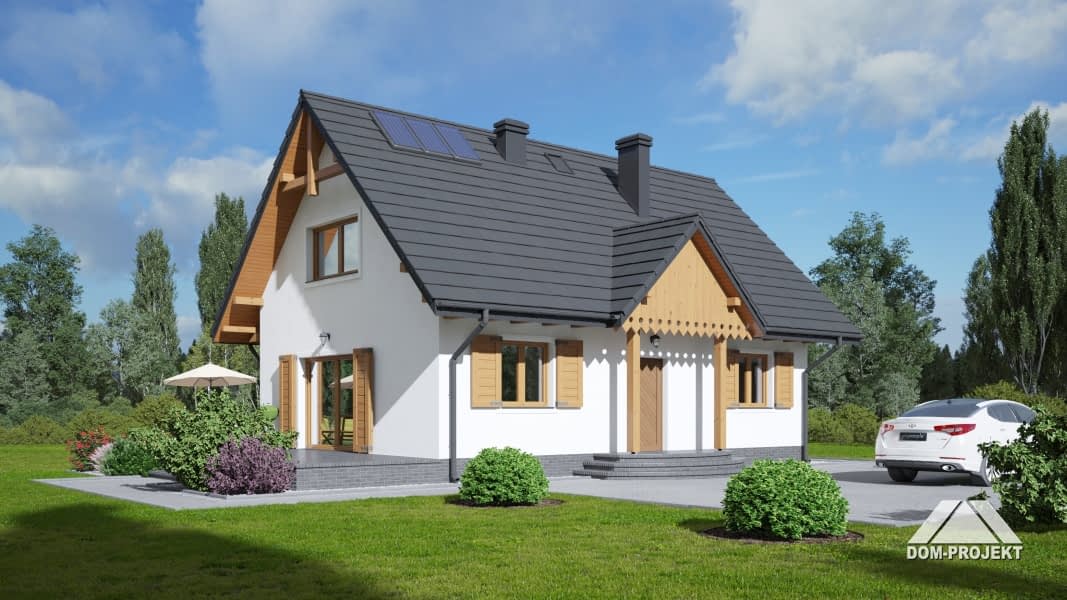 Dom w konstrukcji szkieletowej. Duży salon z aneksem kuchennym, kominkiem, wyjściem na taras i schodami na poddasze. Pokój, łazienka, kotłownia, wiatrołap i komunikacja. Na poddaszu trzy pokoje, łazienka, garderoba i komunikacja. Instalacja solarna. Zwarta bryła budynku i dach dwuspadowy sprzyjają szybkiej i taniej budowie i niskim kosztom eksploatacji.Rzuty