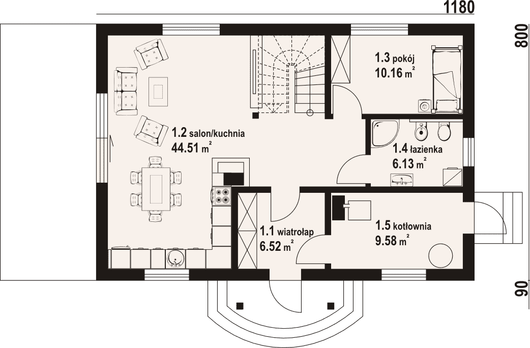 - 1.2 - kuchnia, salon44.51 m²