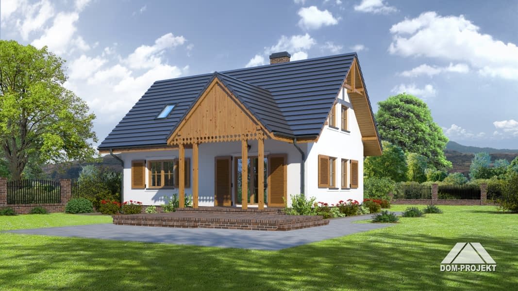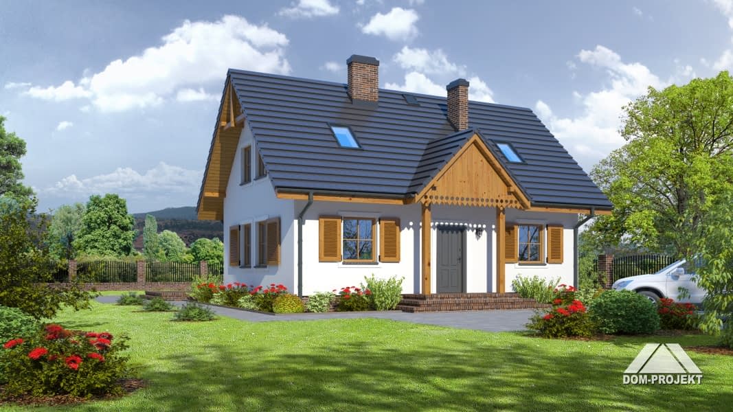 Dom z mieszkalnym poddaszem. Na parterze salon z aneksem kuchennym, dodatkowy pokój, łazienka i kotłownia. W salonie kominek i wyjście na zadaszony taras. Na poddaszu trzy sypialnie i łazienka.Rzuty