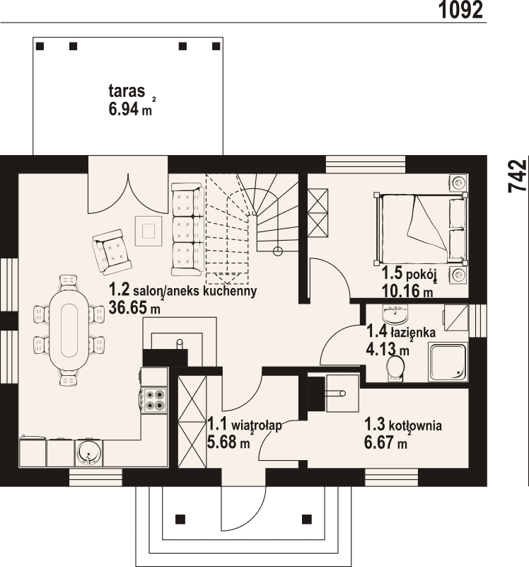 - 1.2 - salon/aneks kuchenny36.65 m²