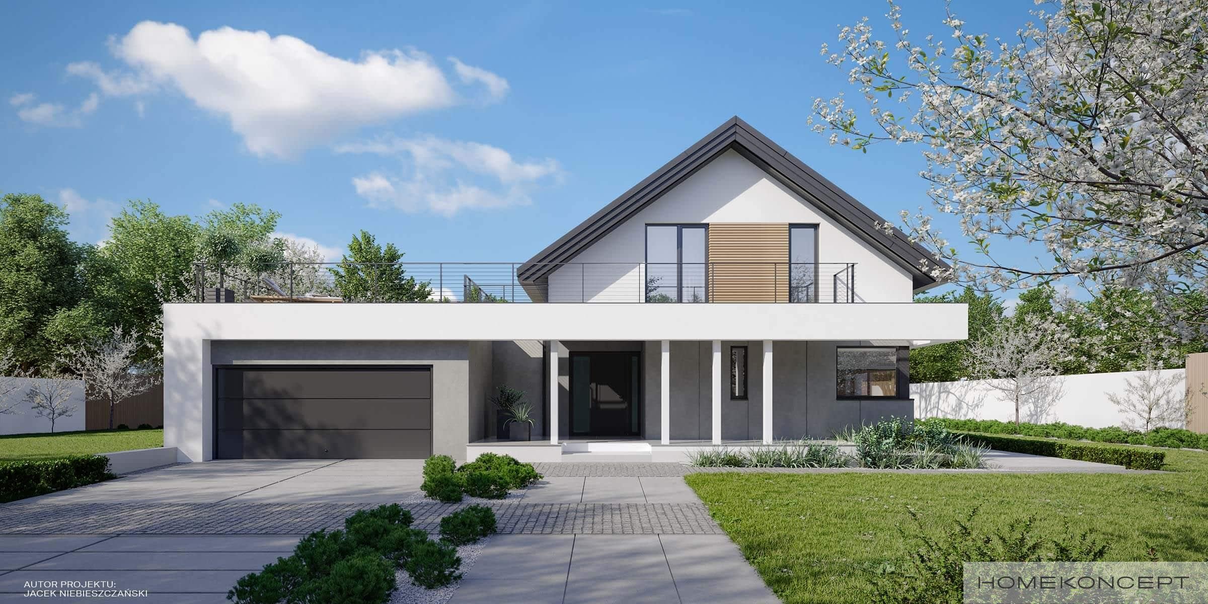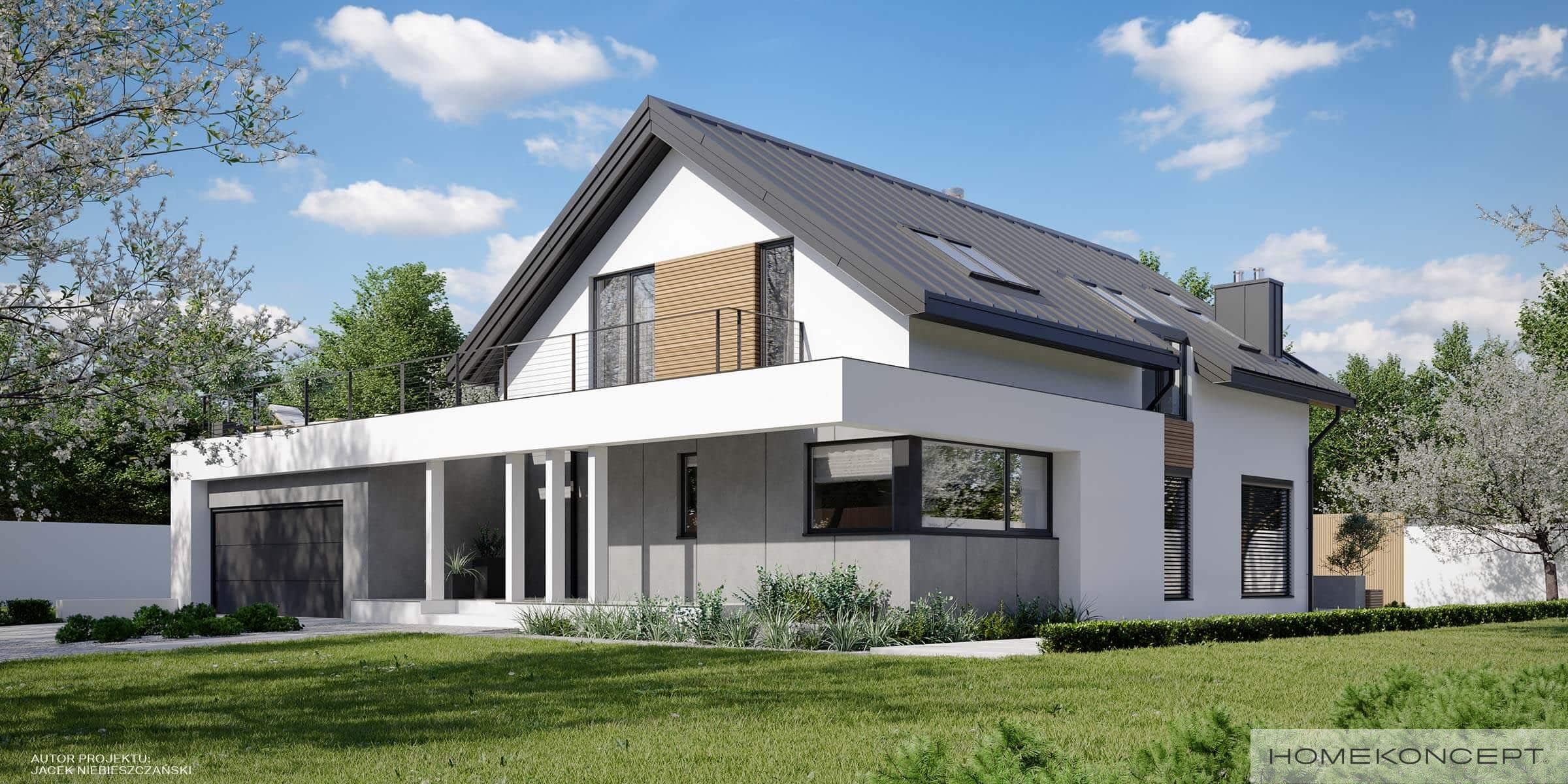 Elewacja: płyty elewacyjne HPL połączone z tynkiem i deskami elewacyjnymi - modrzew syberyjski