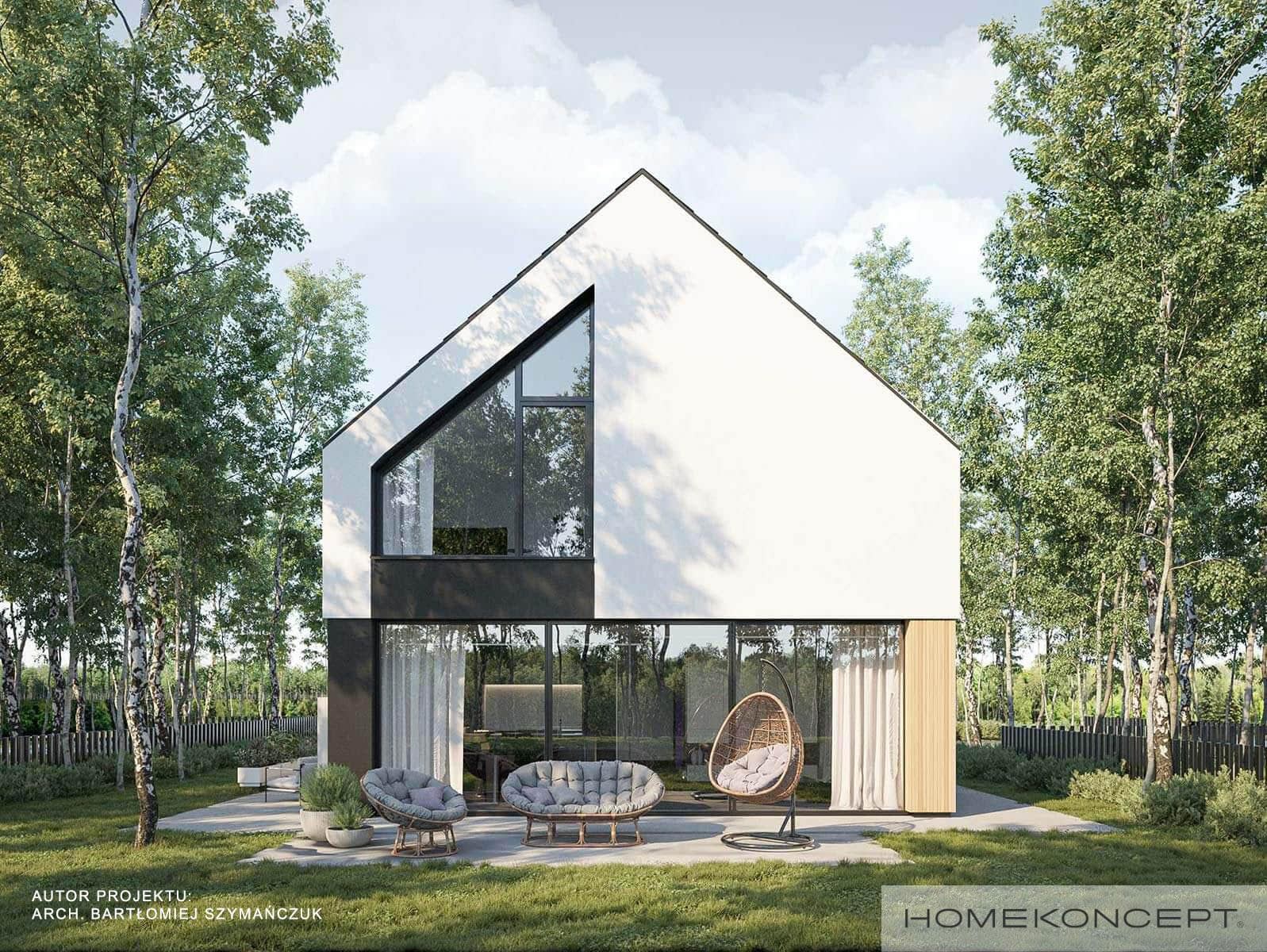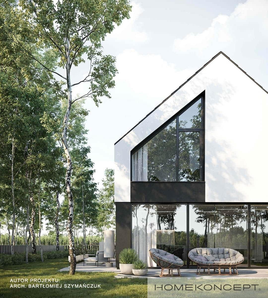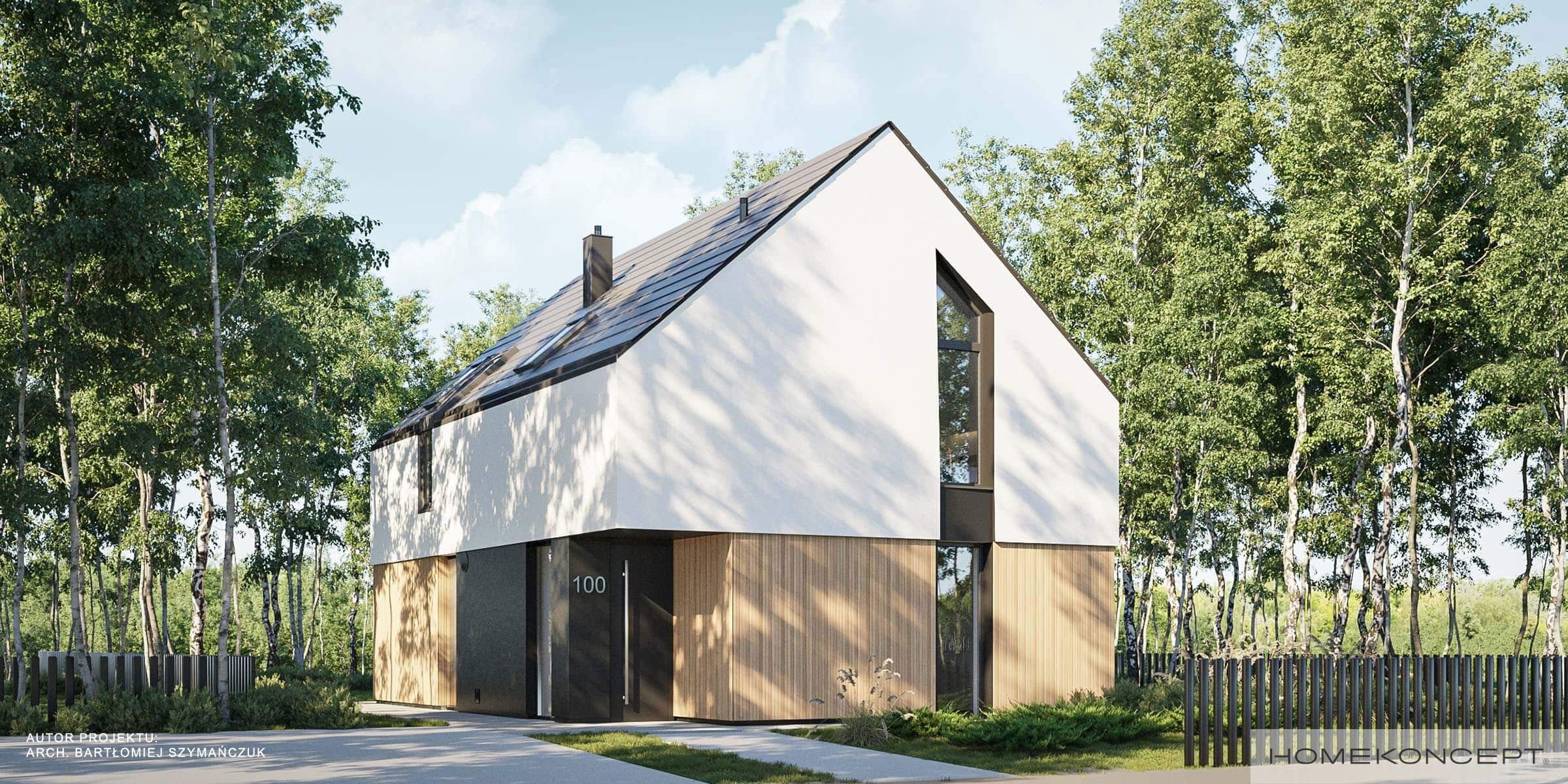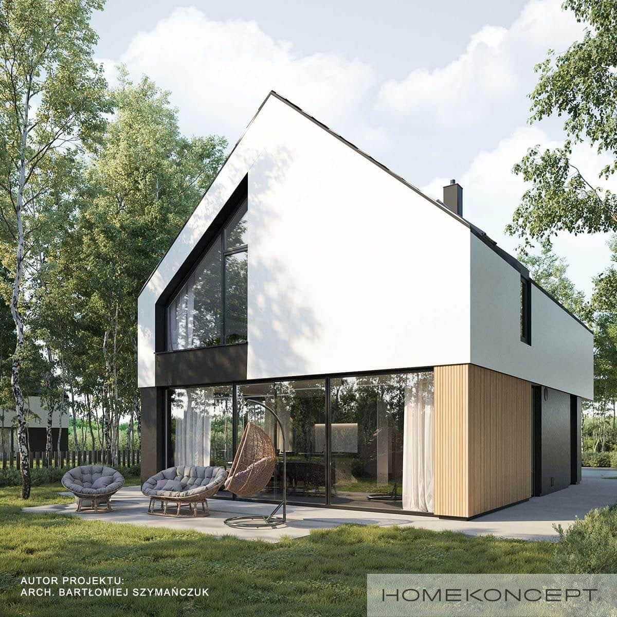Elewacja: tynk silikonowy w kolorze białym i grafitowym połączony z deską elewacyjną