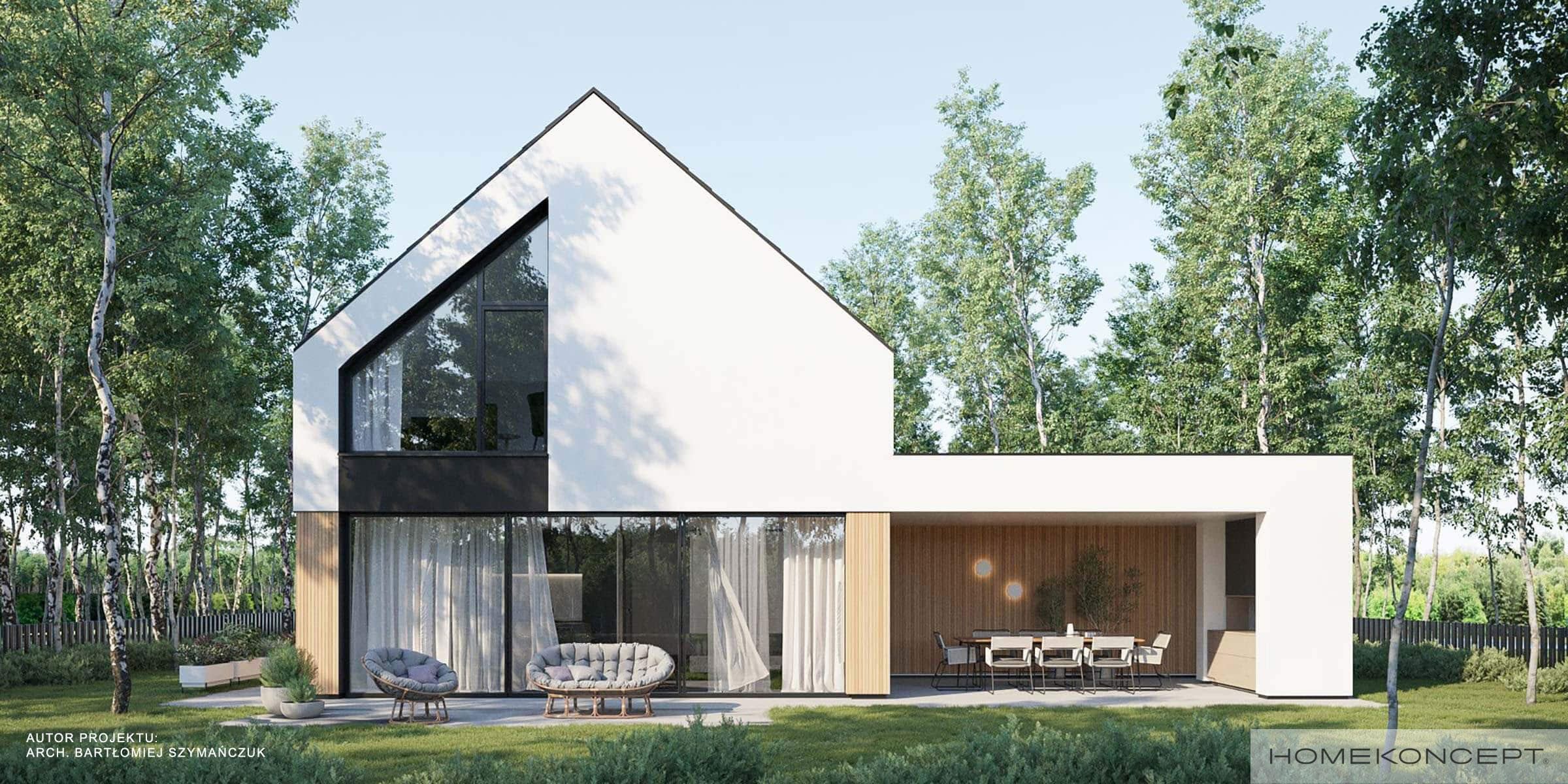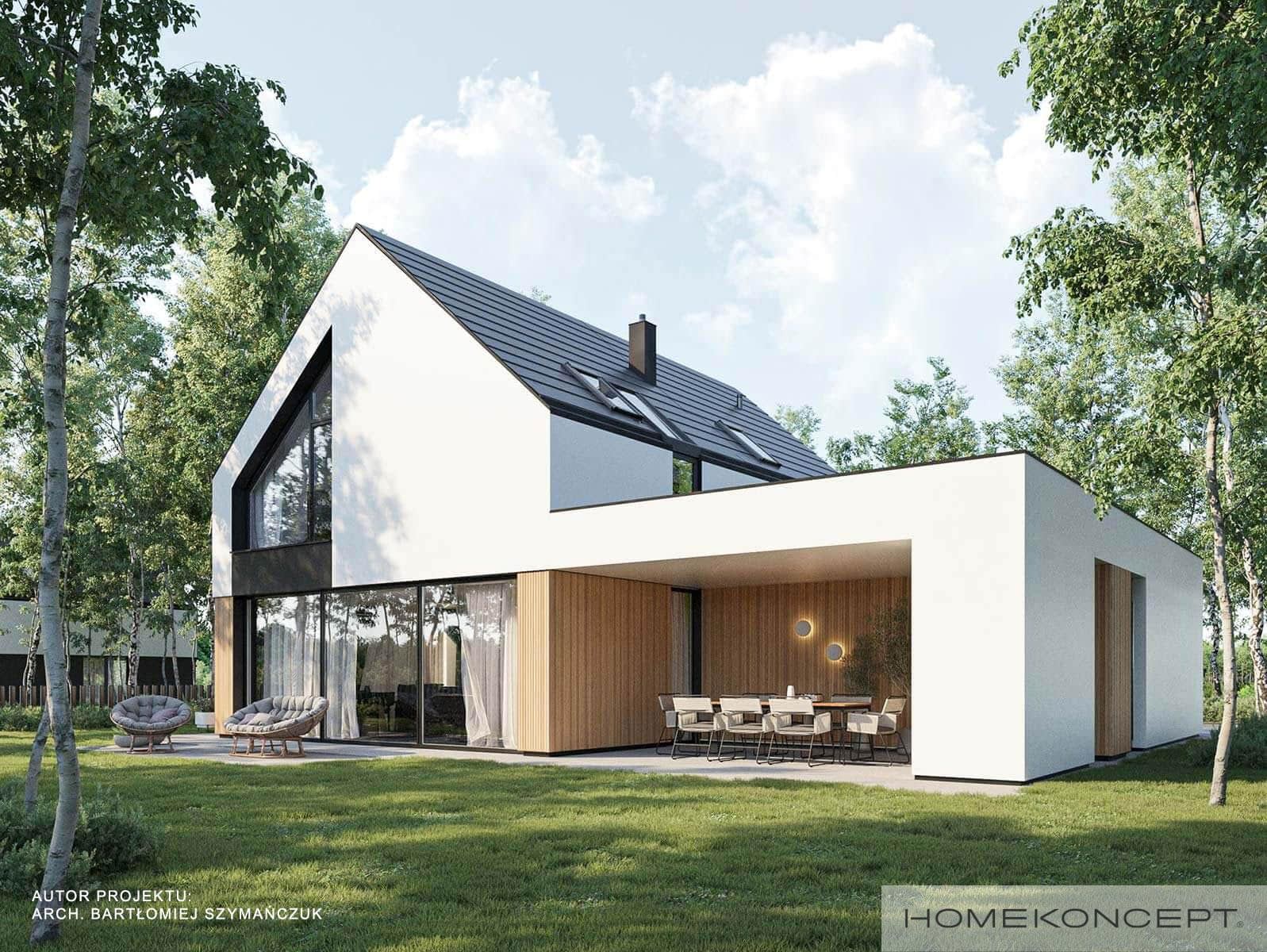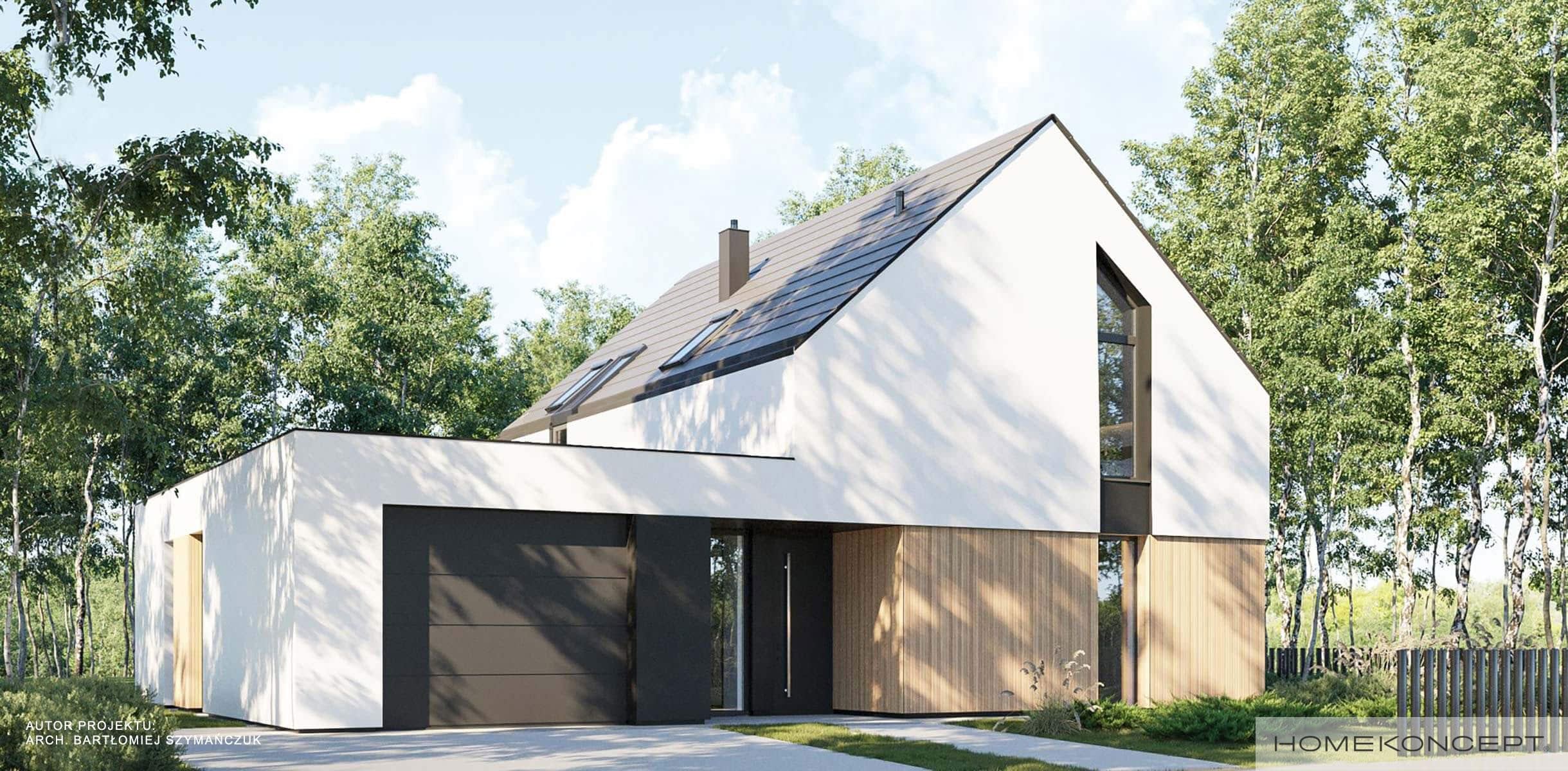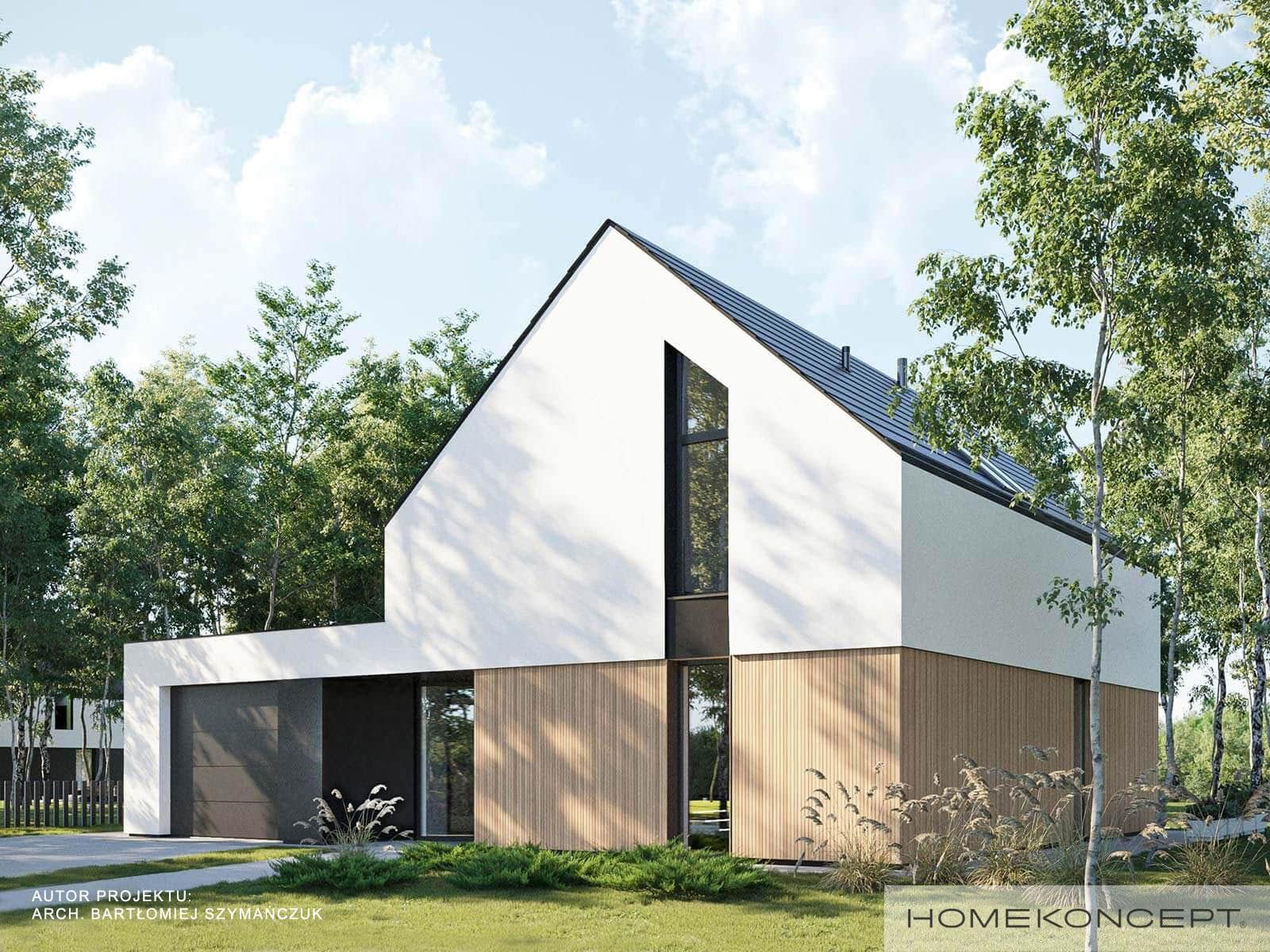 Elewacja: tynk silikonowy w kolorze białym i grafitowym połączony z drewnem elewacyjnym
