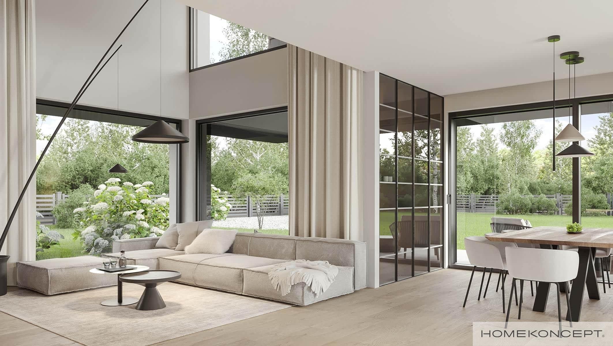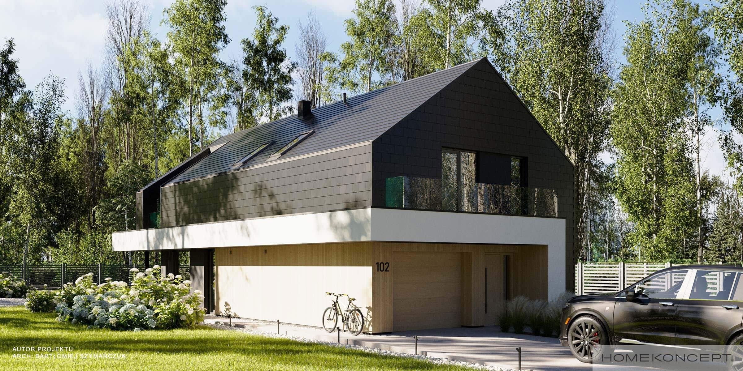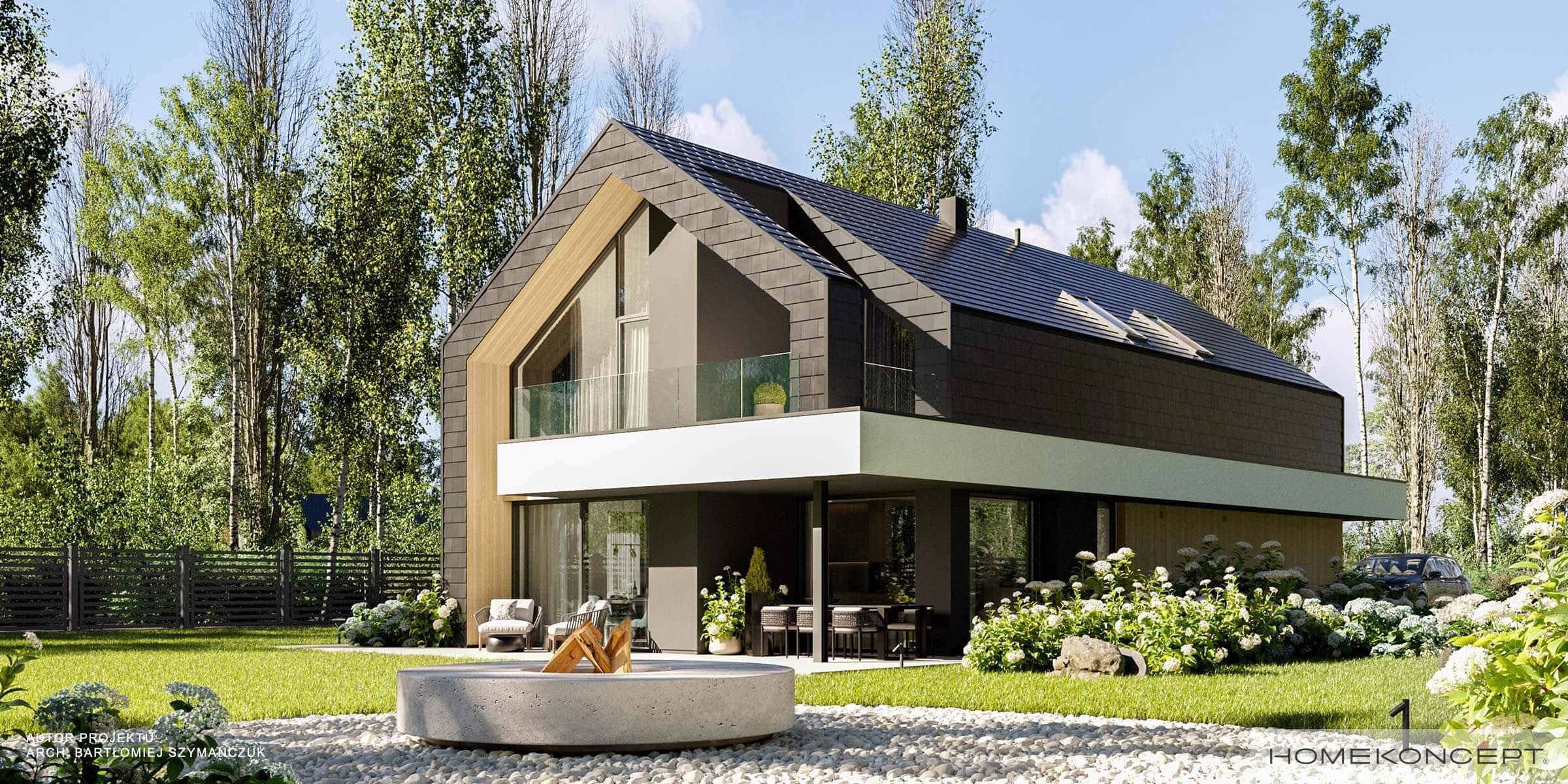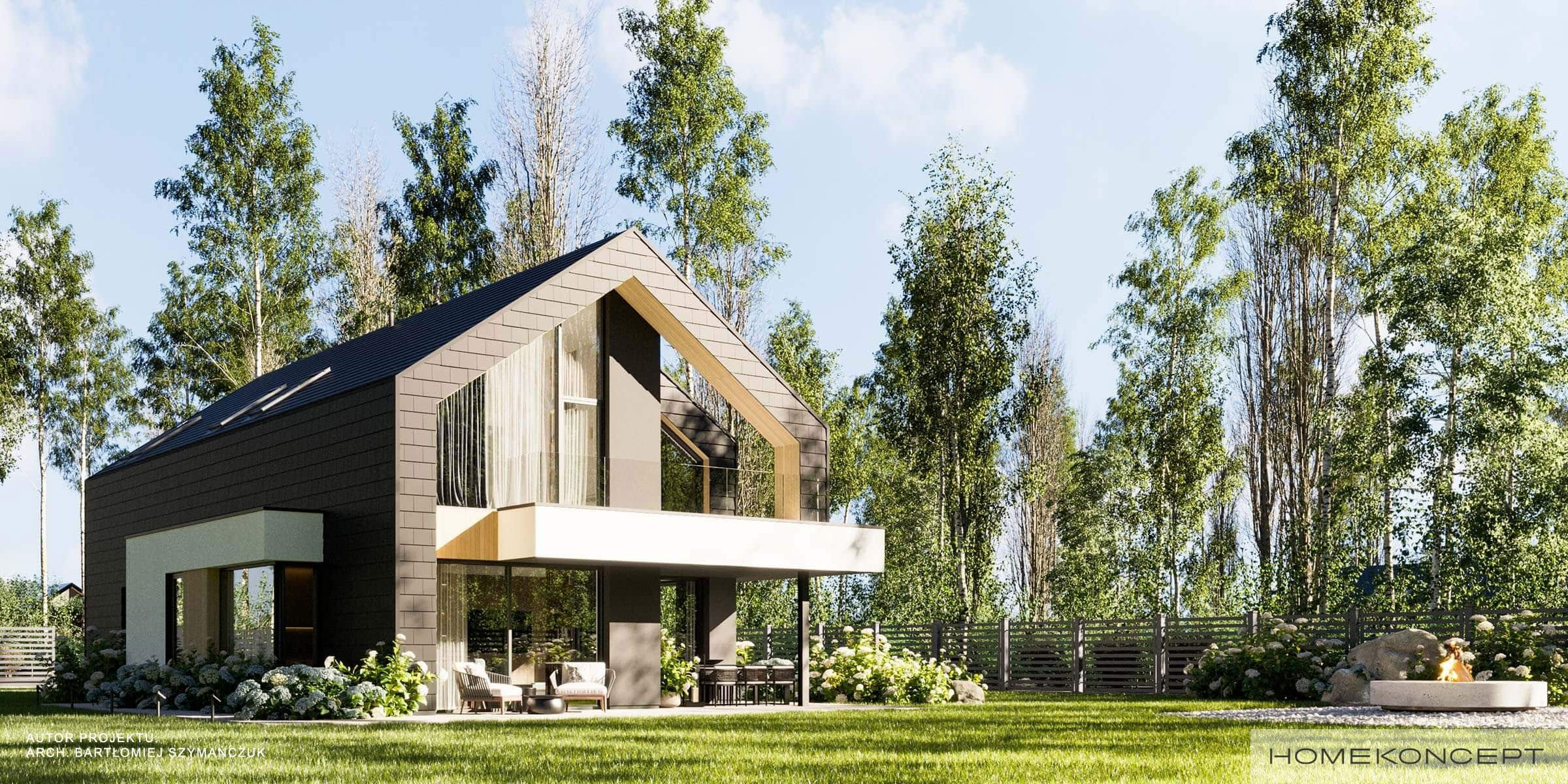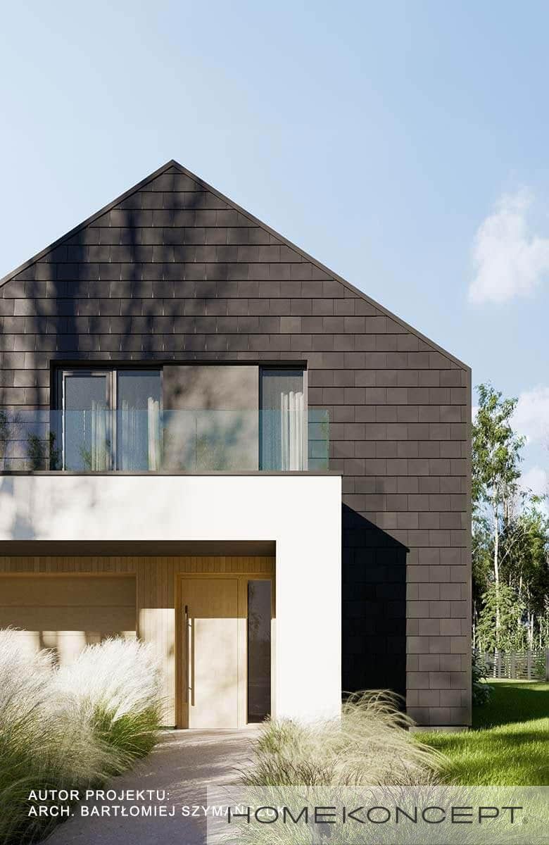 Elewacja: tynk silikonowy w kolorze białym i grafitowym połączony z drewnem elewacyjnym i płytkami włókno-cementowymi