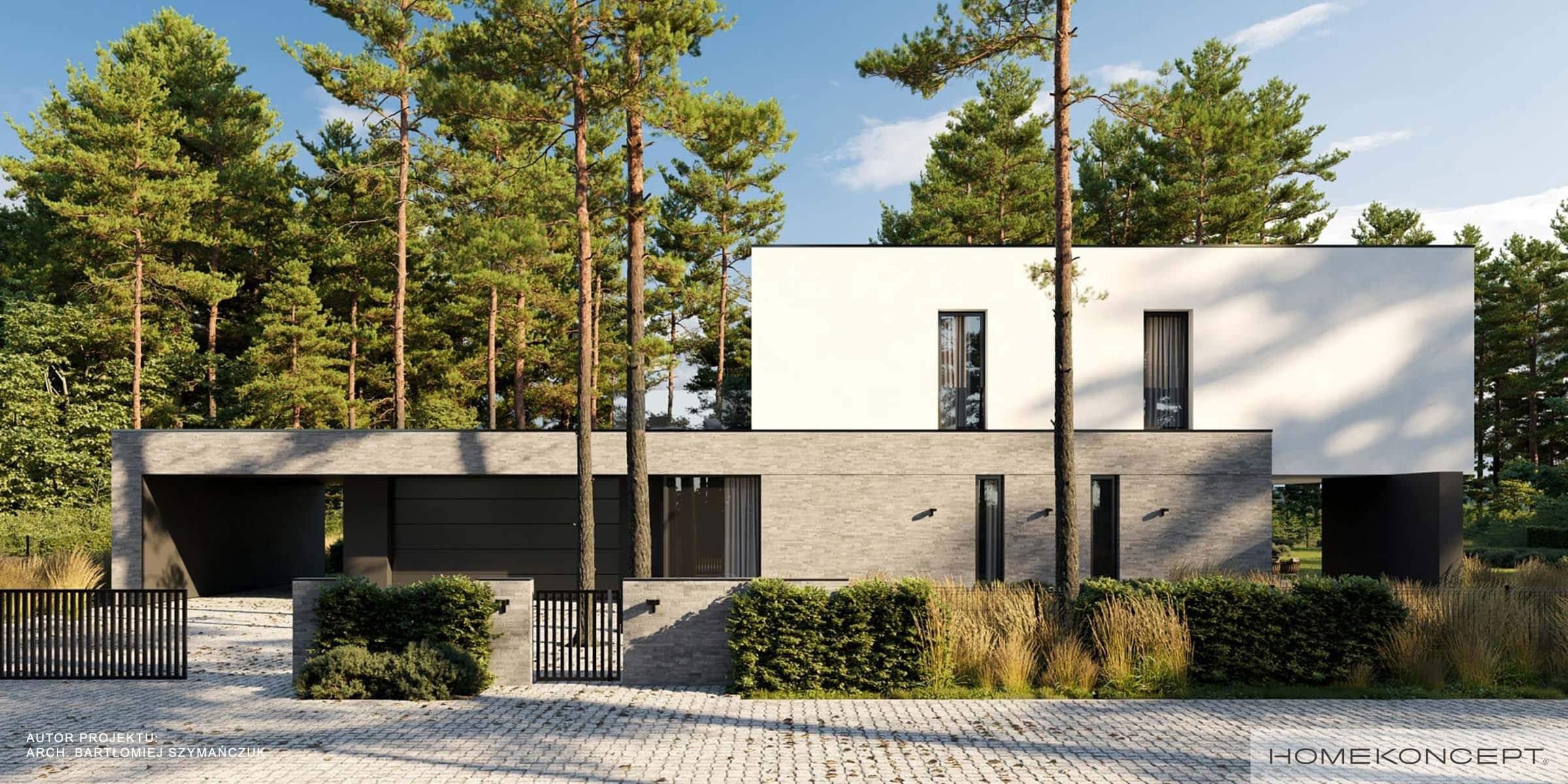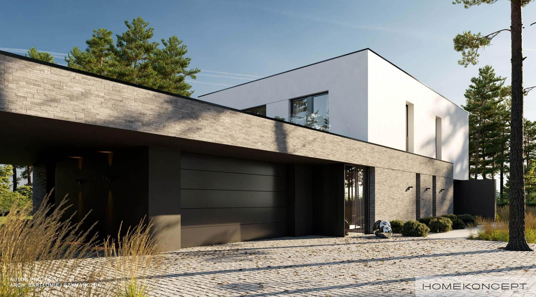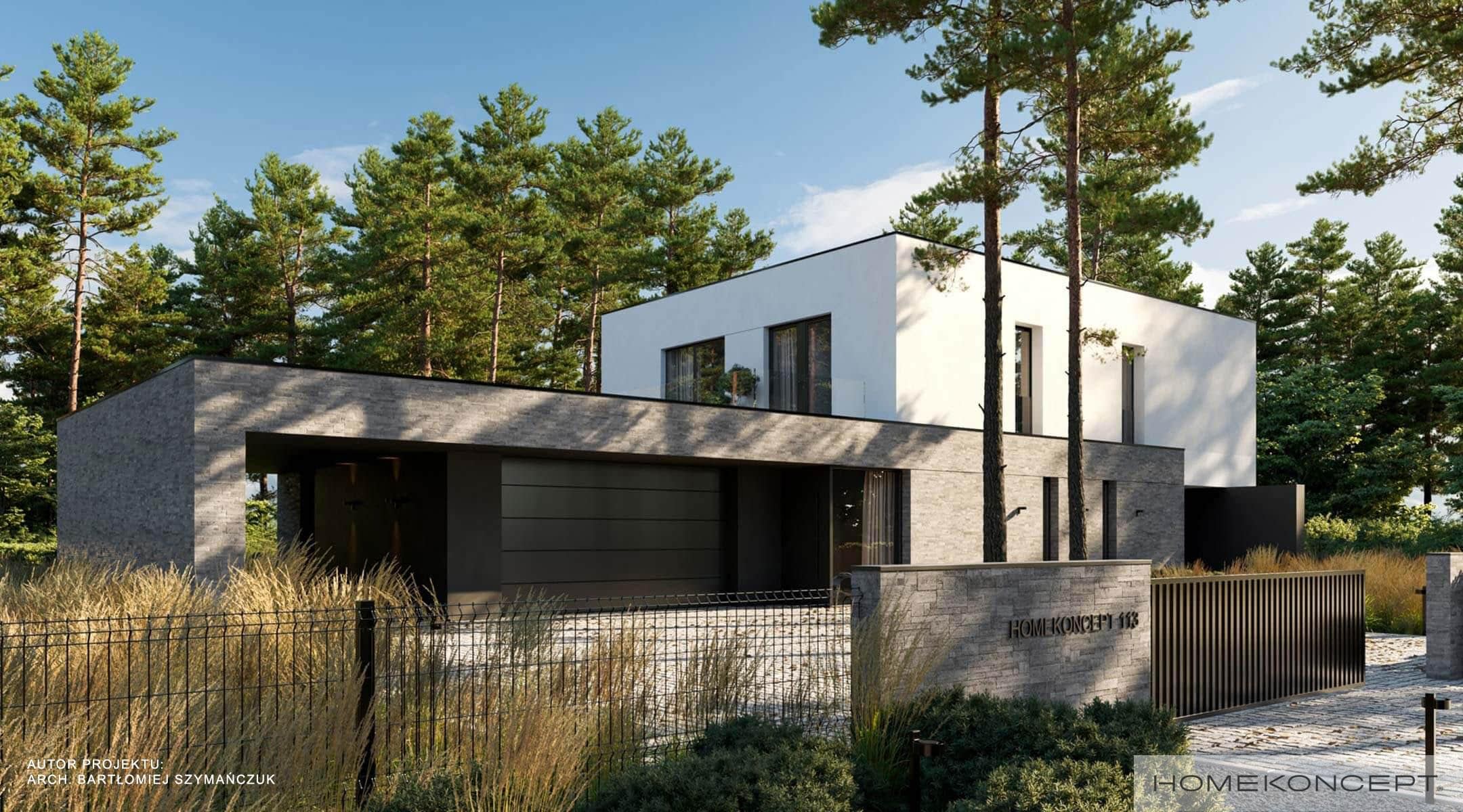Elewacja: tynk silikonowy połączony z kamieniem elewacyjnym oraz deską elewacyjną (podsufitka balkonu, fragment ściany piętra)