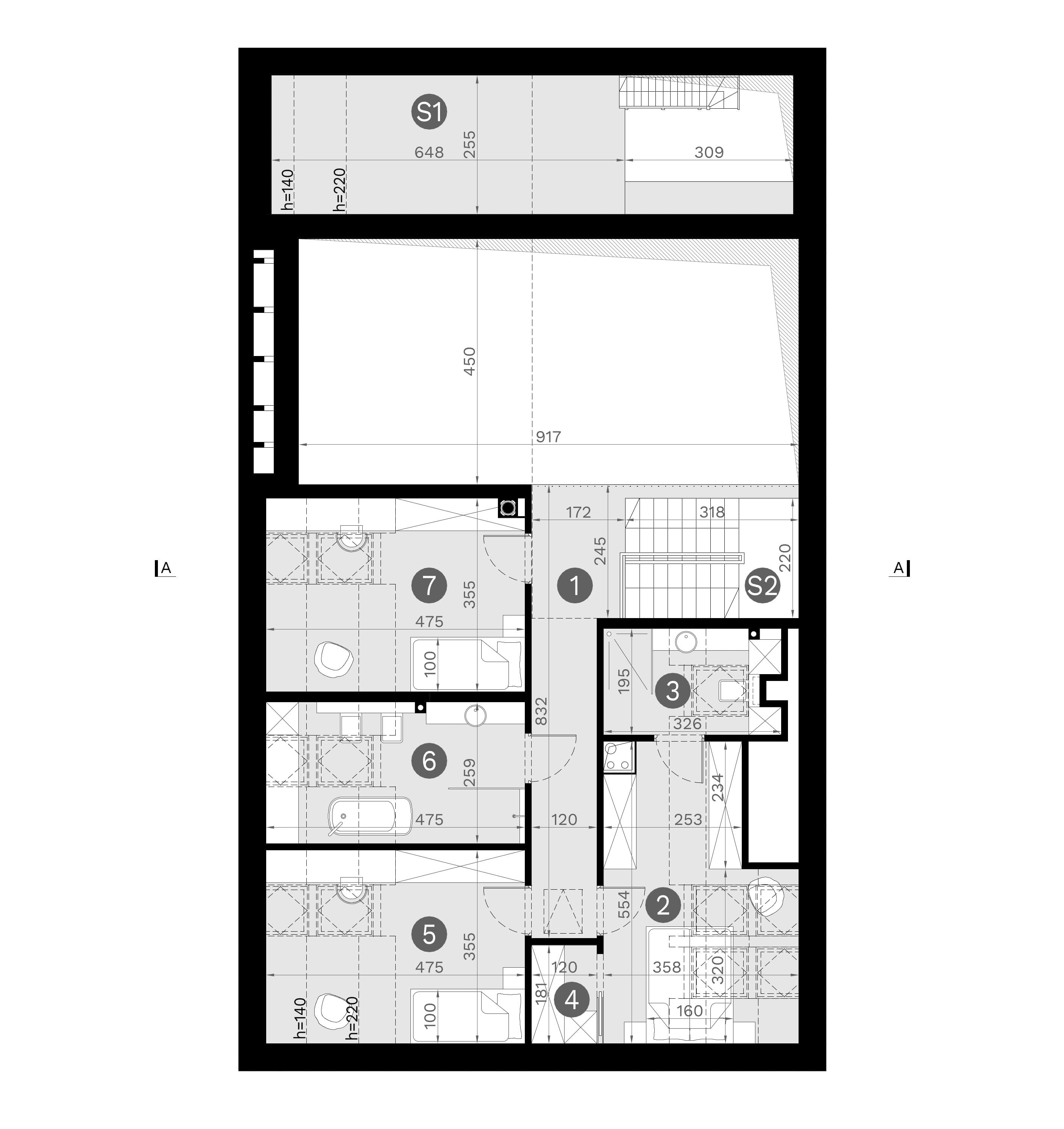 - wszystkie niezbędne przekroje przez całość oraz charakterystyczne fragmenty budynku,