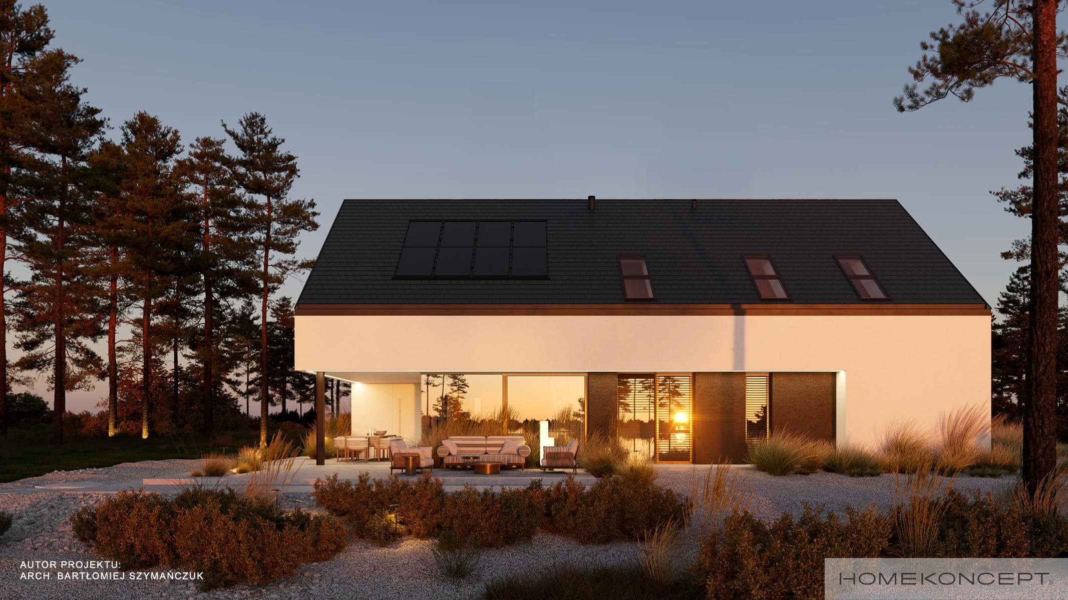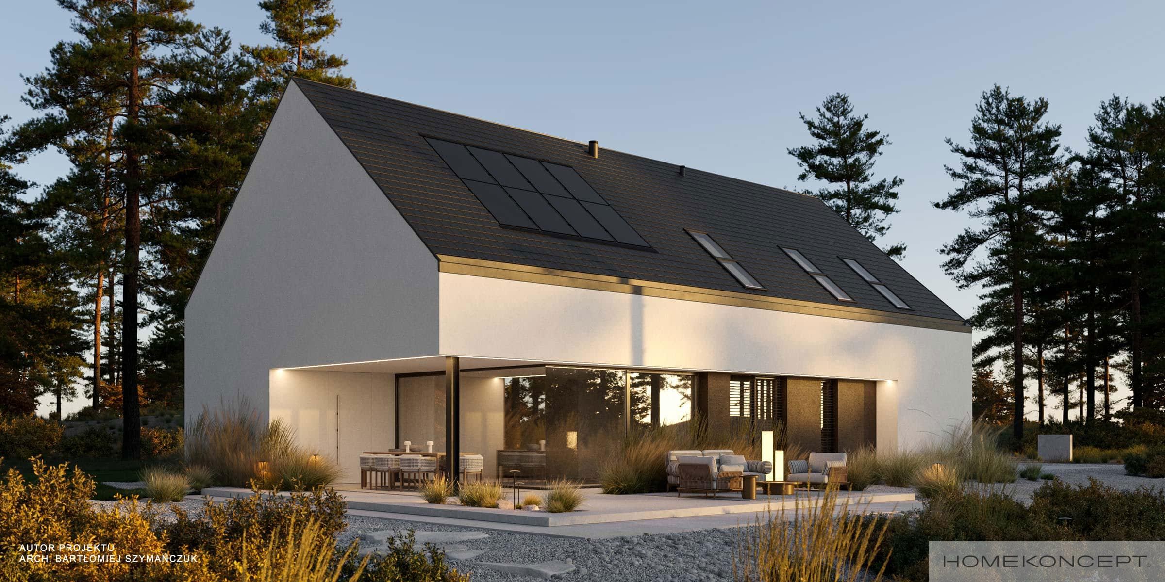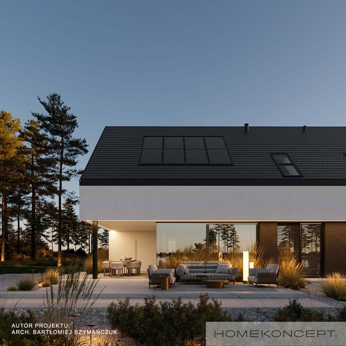 Dach: dwuspadowy kryty dachówką ceramiczną lub cementową swissporTON wraz z systemem fotowoltaicznym SunLACE, okna dachowe FAKRO