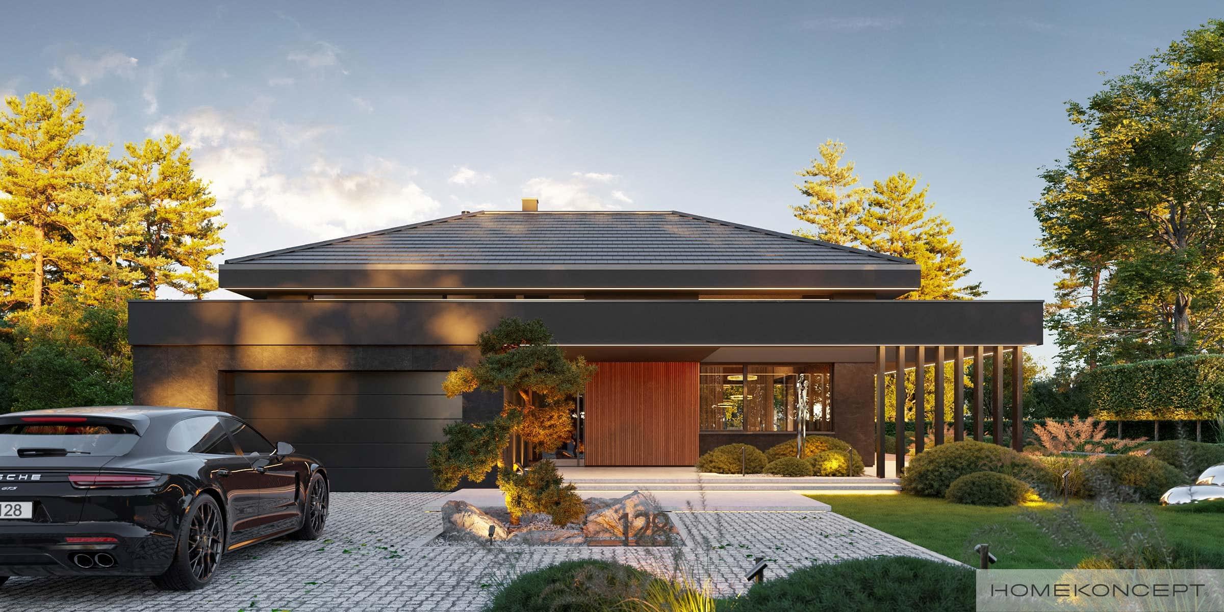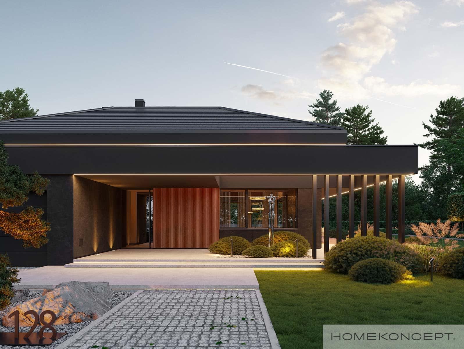 Dach: czterospadowy kryty dachówką ceramiczną lub cementową swissporTON, stropodach pełny kryty membraną EPDM, okna dachowe FAKRO