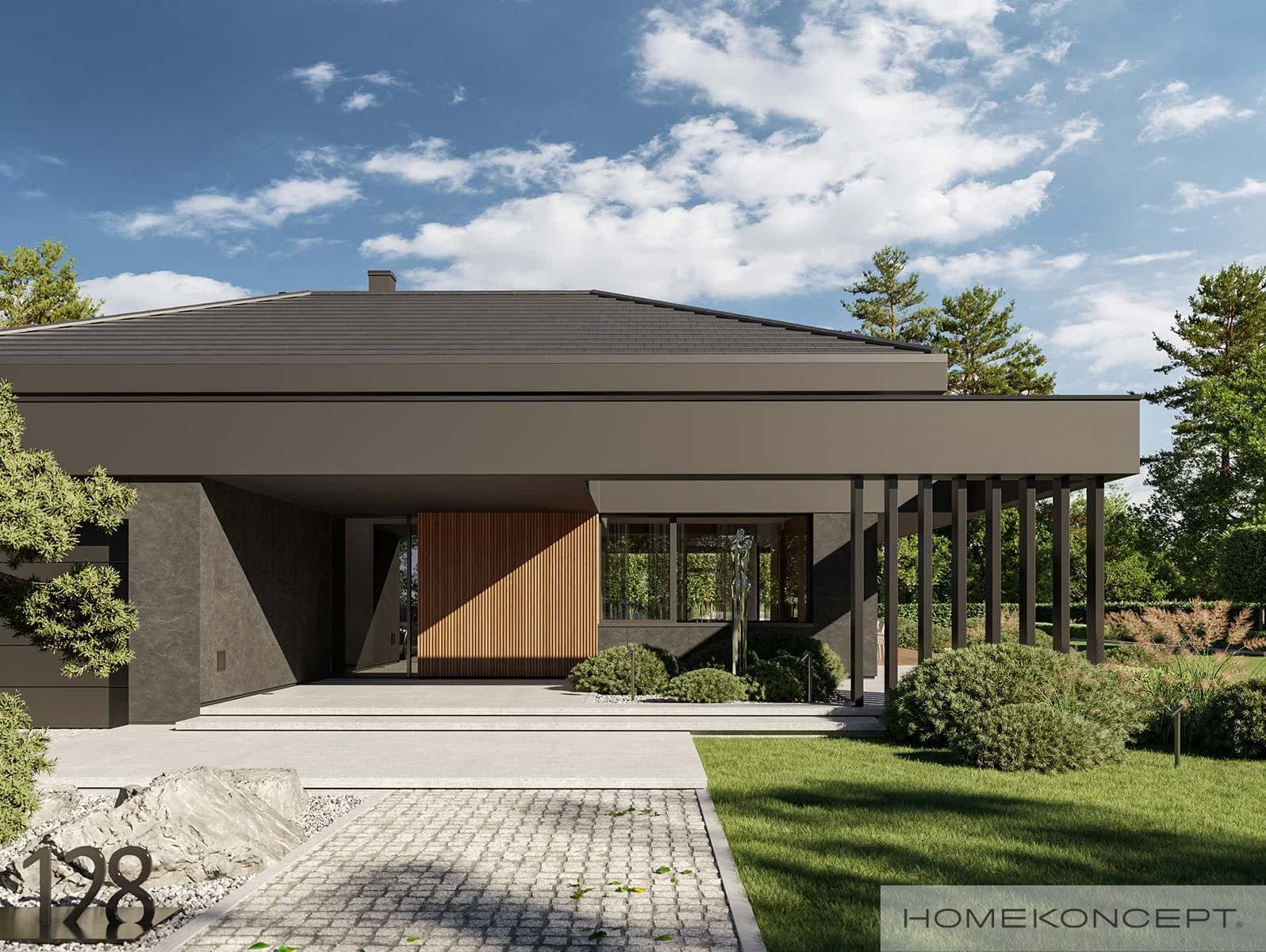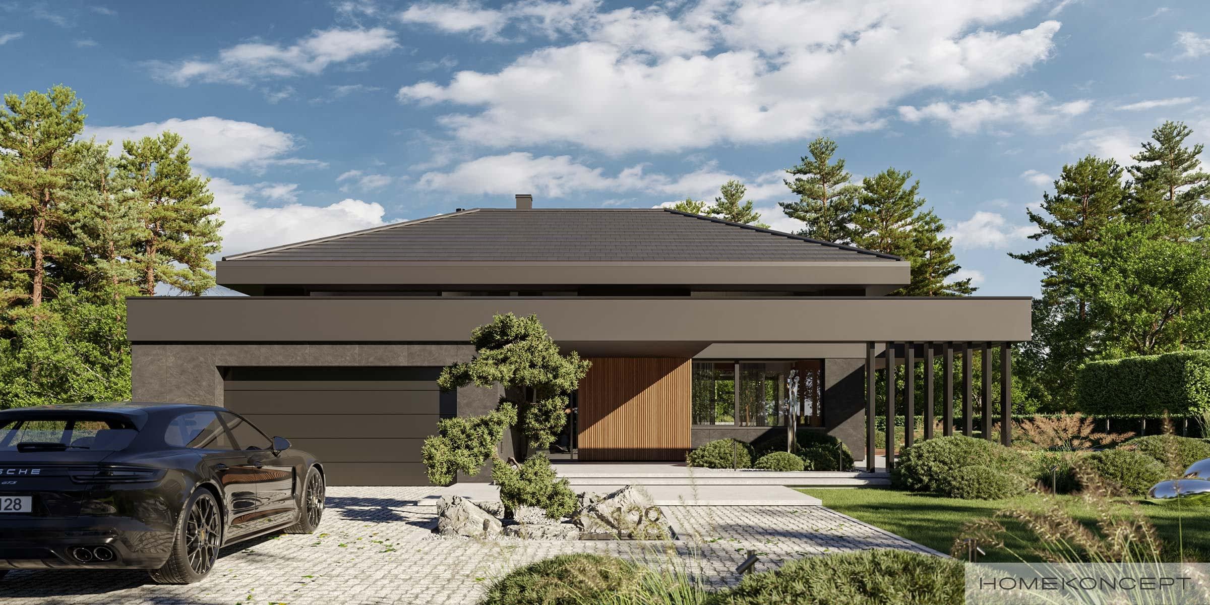 Elewacja: tynk silikonowy połączony z deskami elewacyjnymi lamelowymi oraz spiekiem kwarcowym