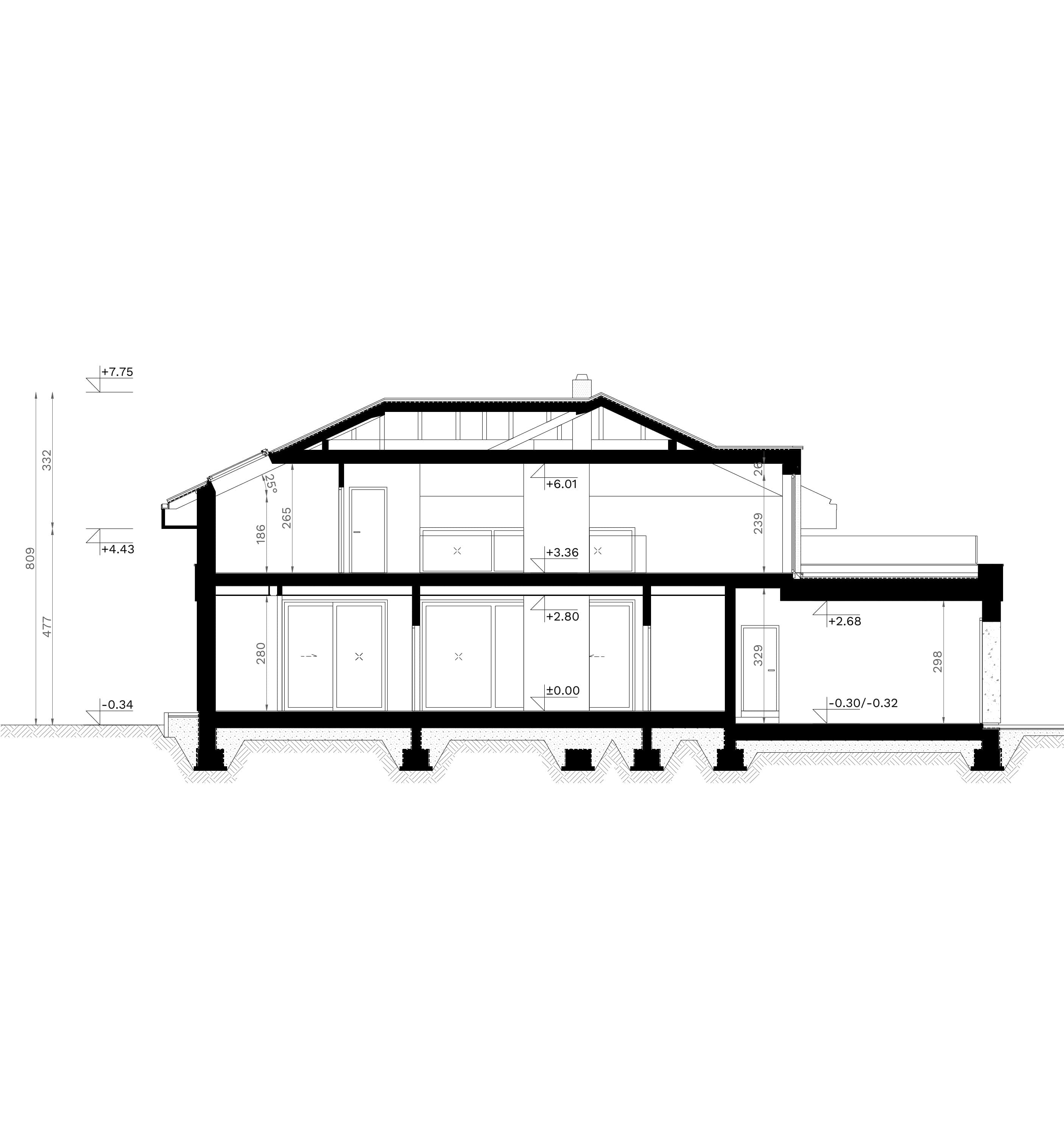 - wszystkie niezbędne przekroje przez całość oraz charakterystyczne fragmenty budynku,