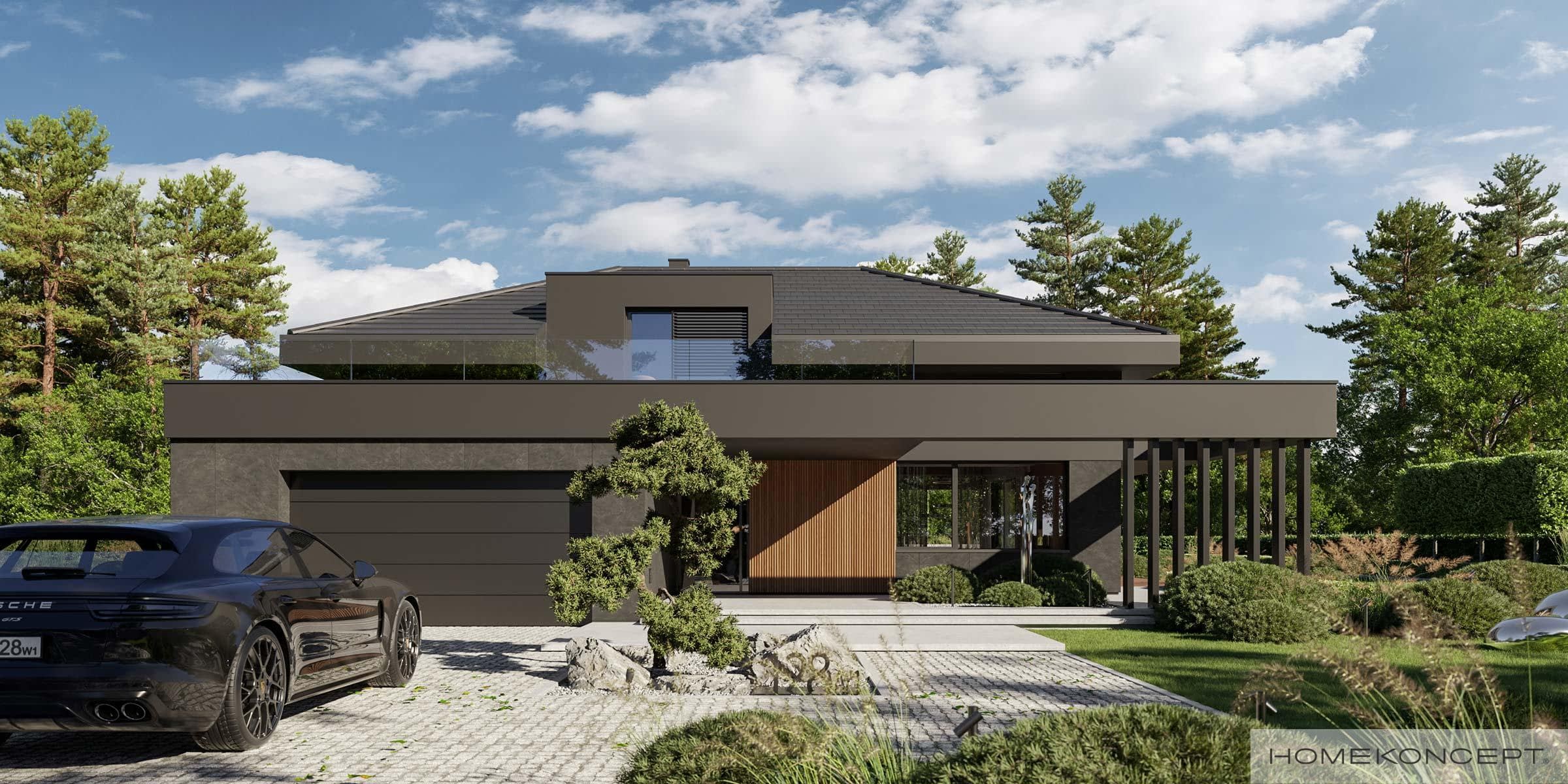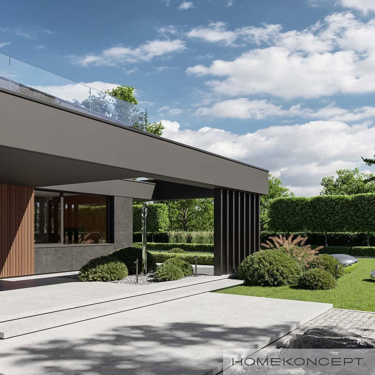 Elewacja: tynk silikonowy połączony z deskami elewacyjnymi lamelowymi oraz spiekiem kwarcowym