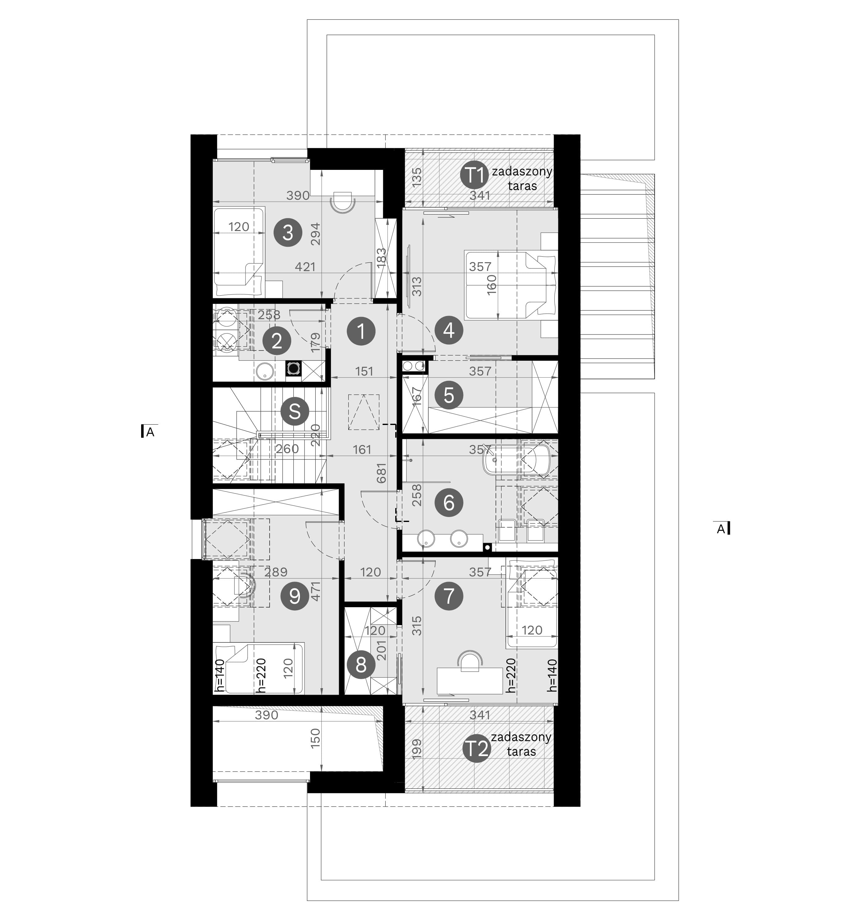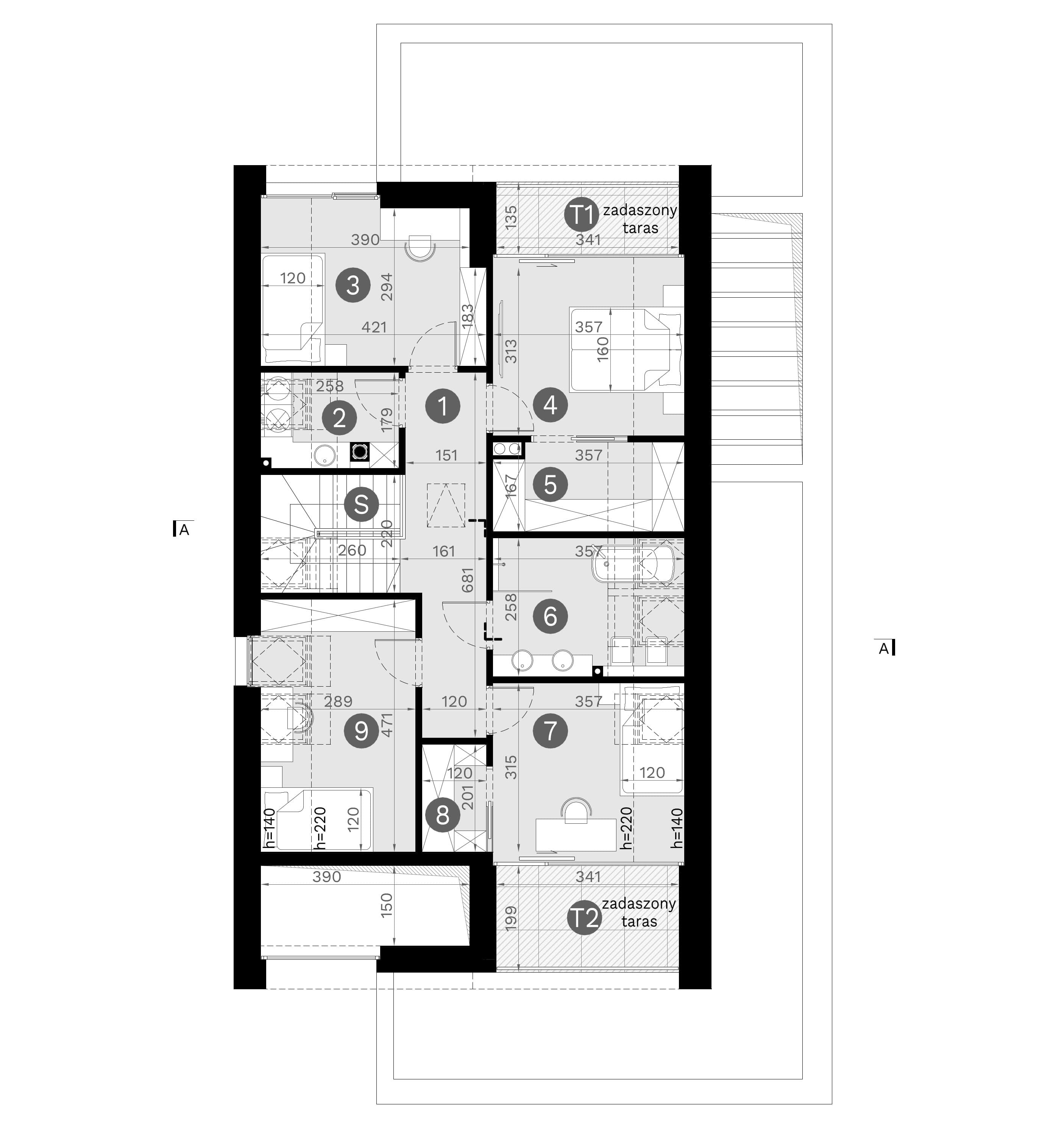 - rzuty poziome poszczególnych kondygnacji (parter, poddasze lub piętro),