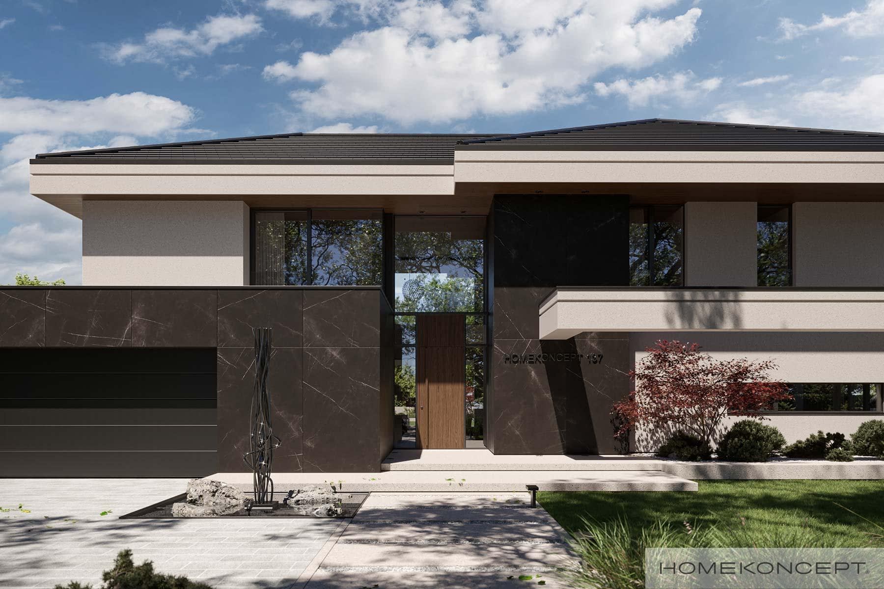 Elewacja: tynk silikonowy połączony z deskami elewacyjnymi oraz spiekiem kwarcowym