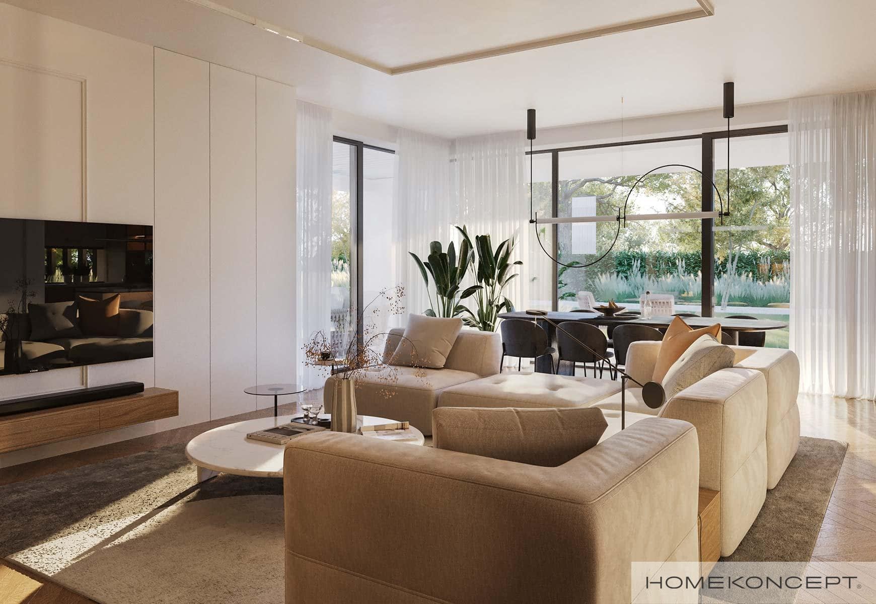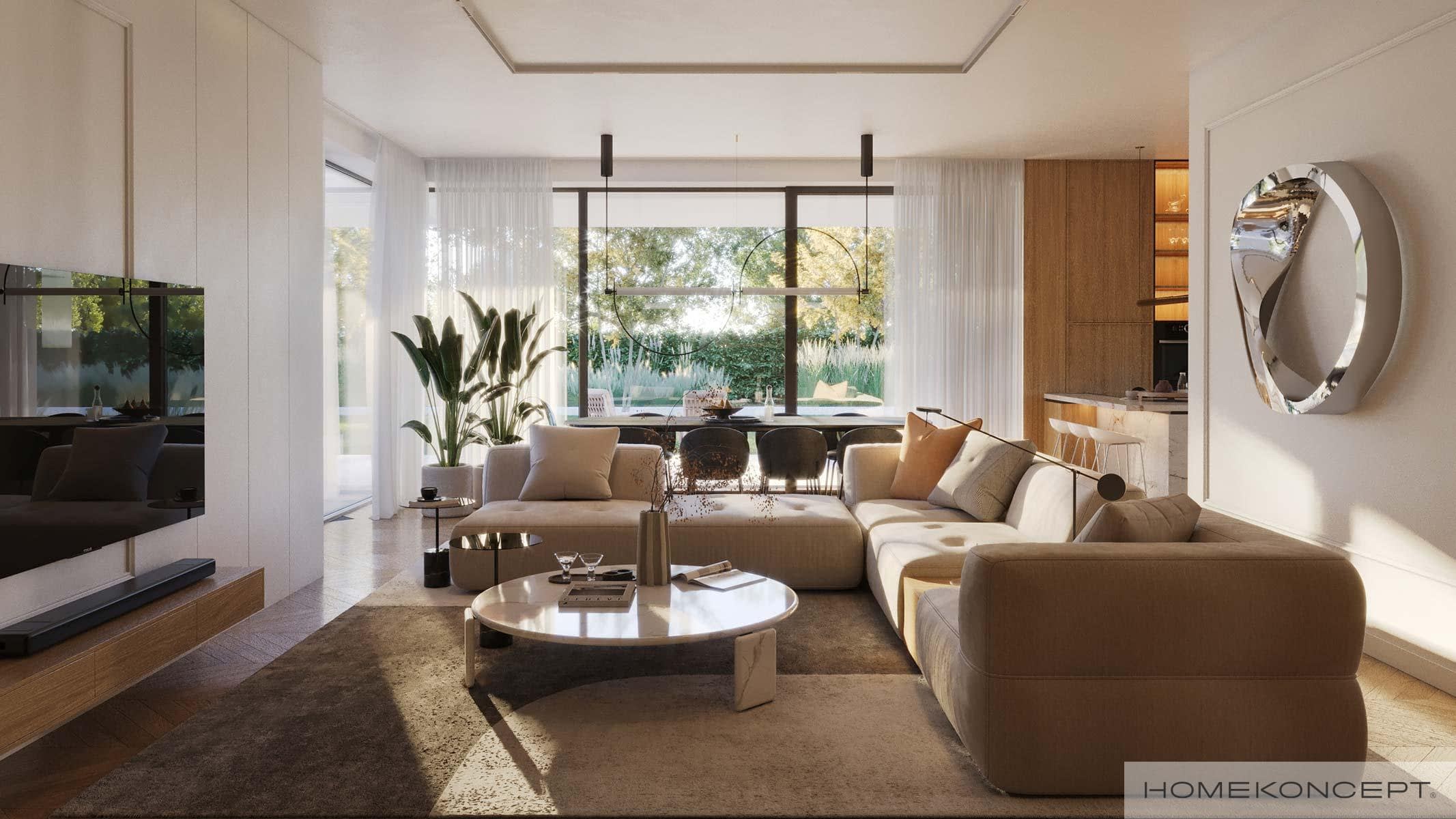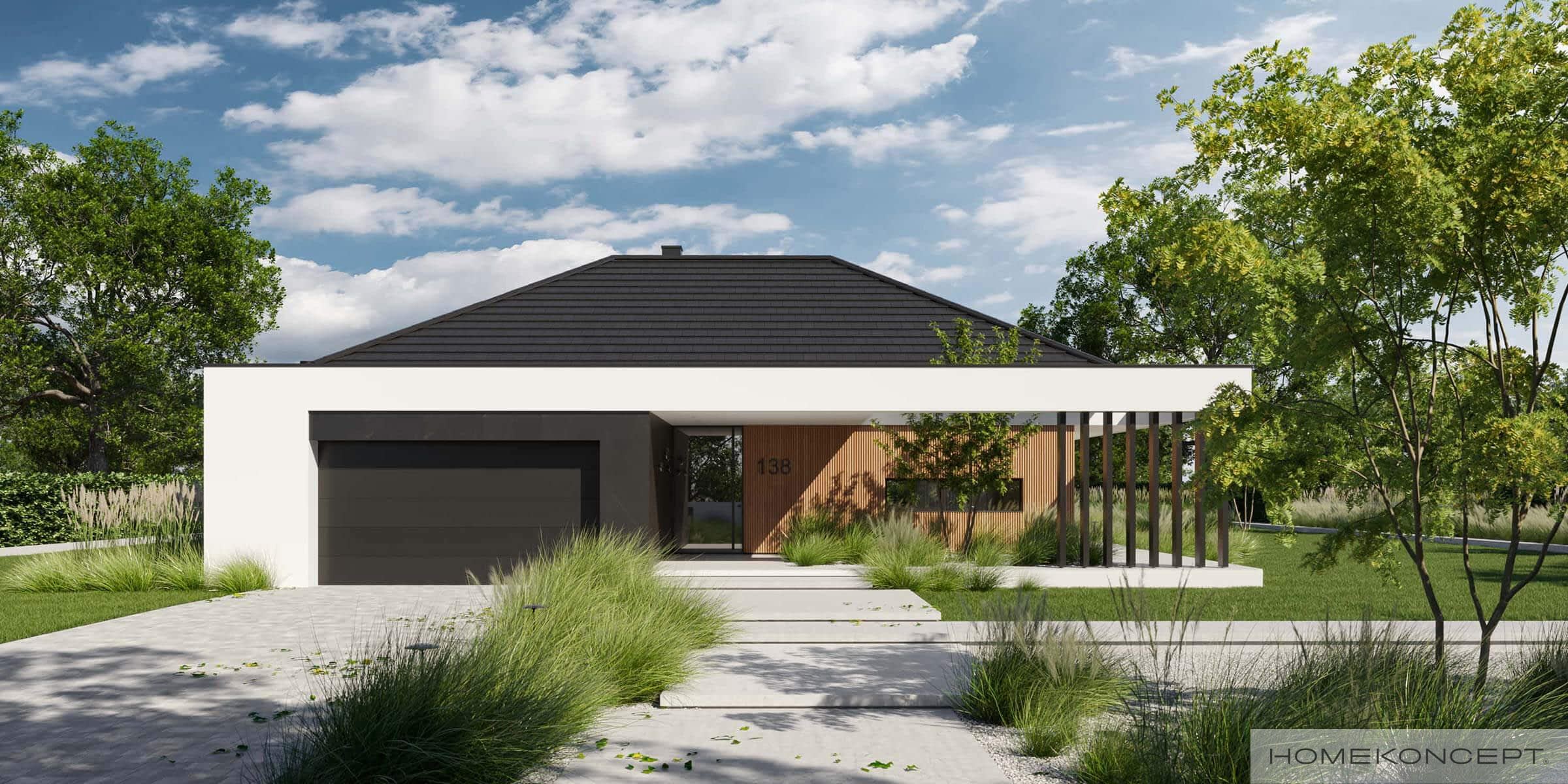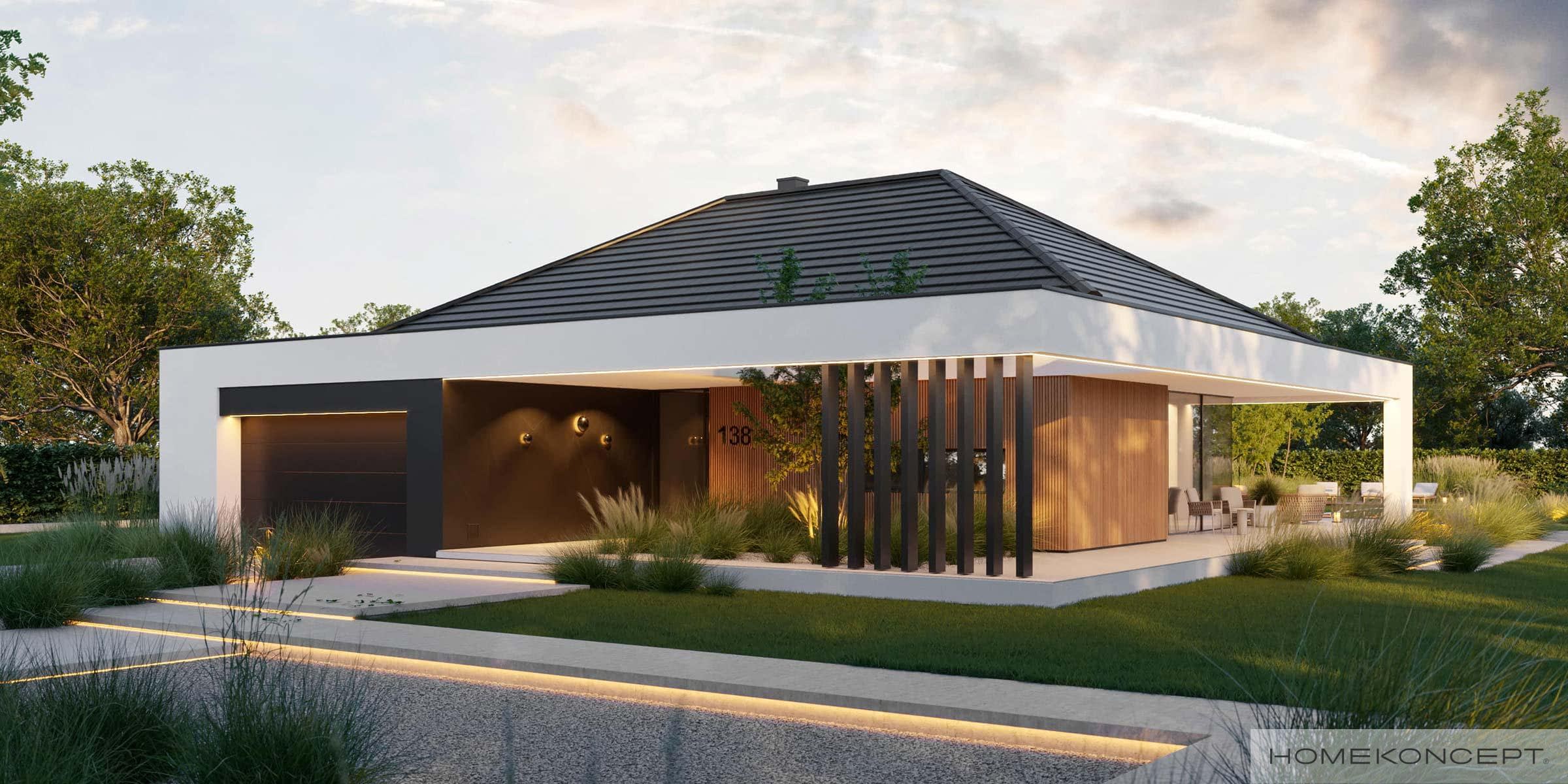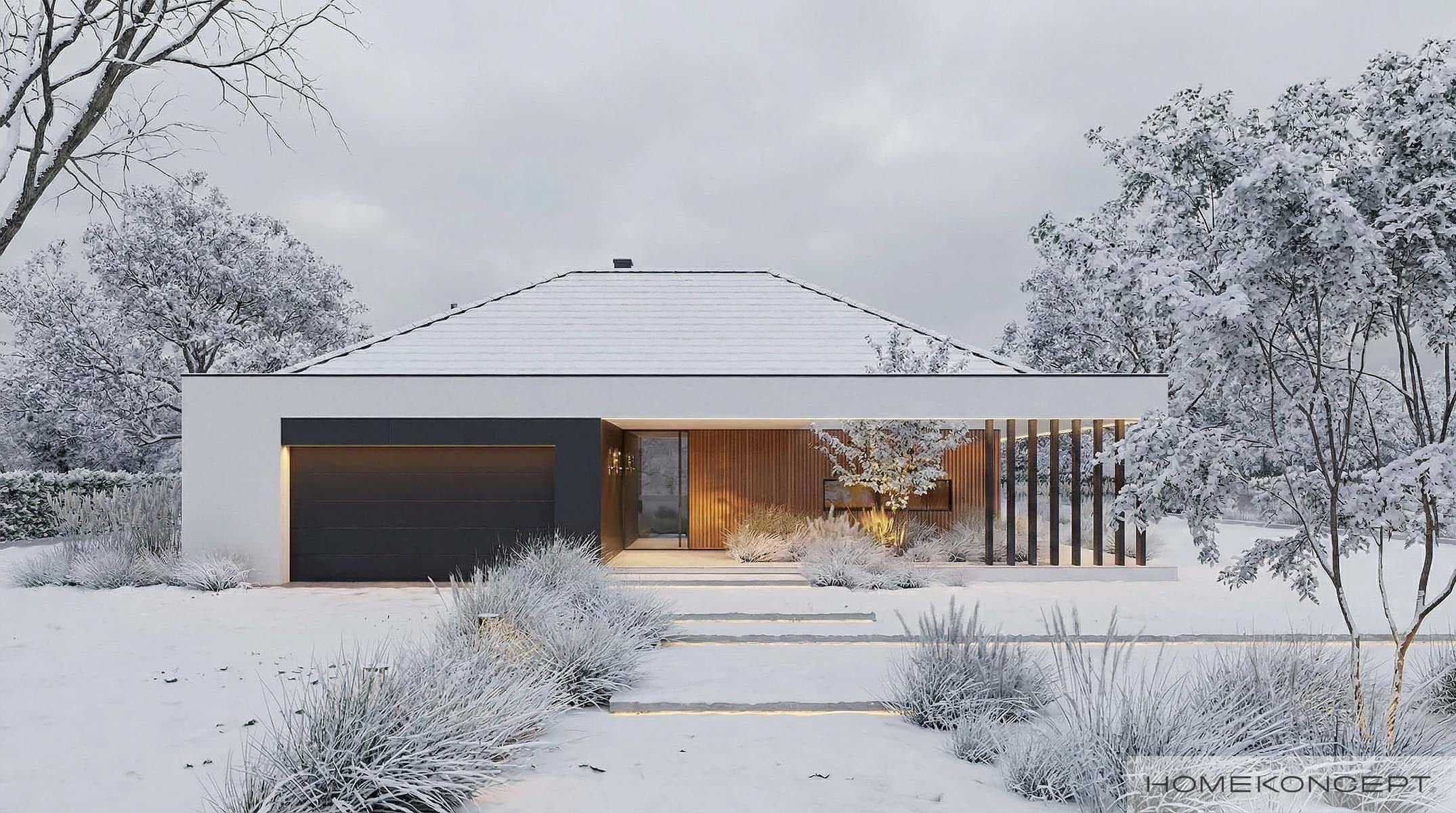 Elewacja: tynk silikonowy połączony z deskami elewacyjnymi lamelowymi oraz spiekiem kwarcowym
