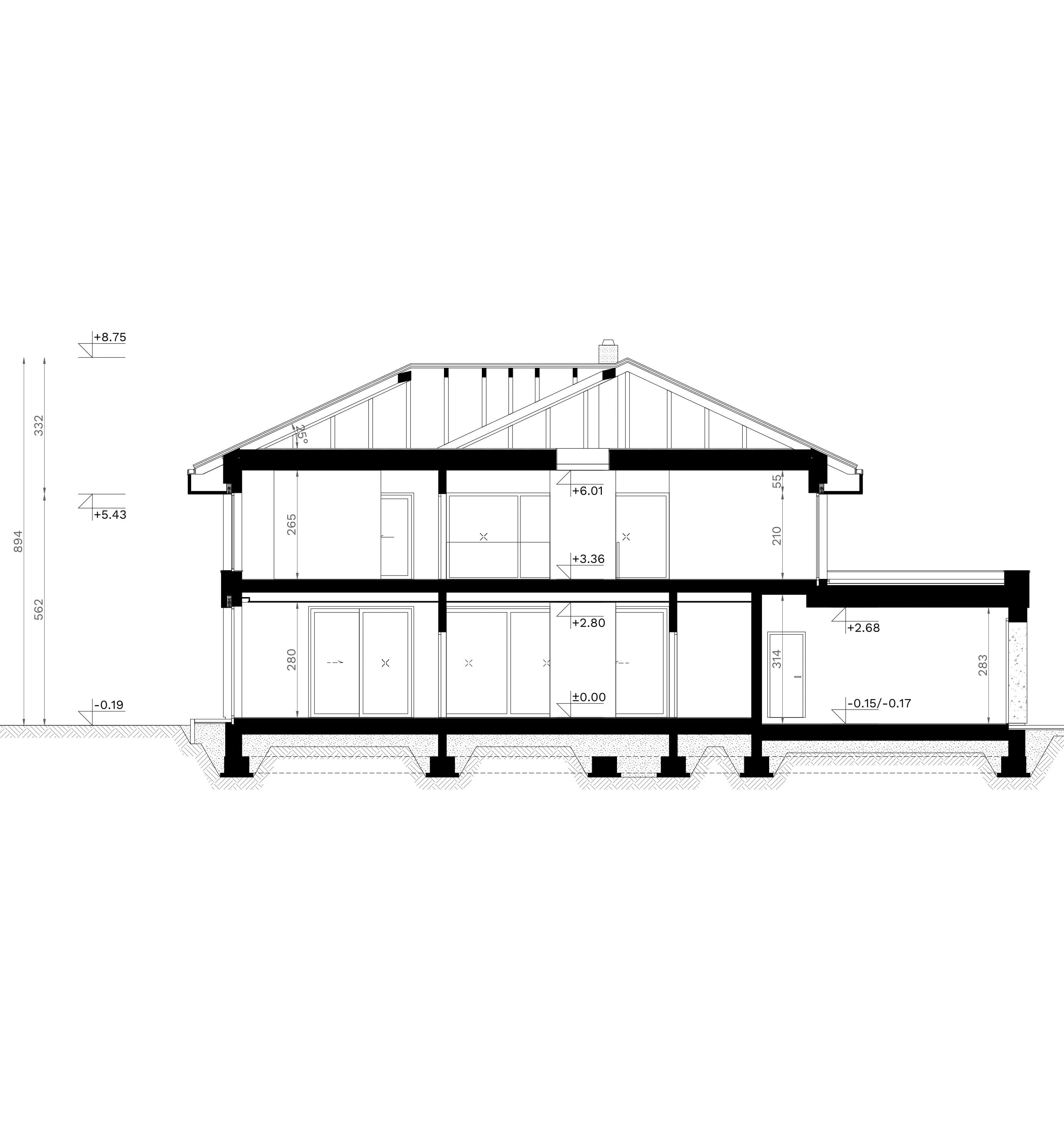 - wszystkie niezbędne przekroje przez całość oraz charakterystyczne fragmenty budynku,