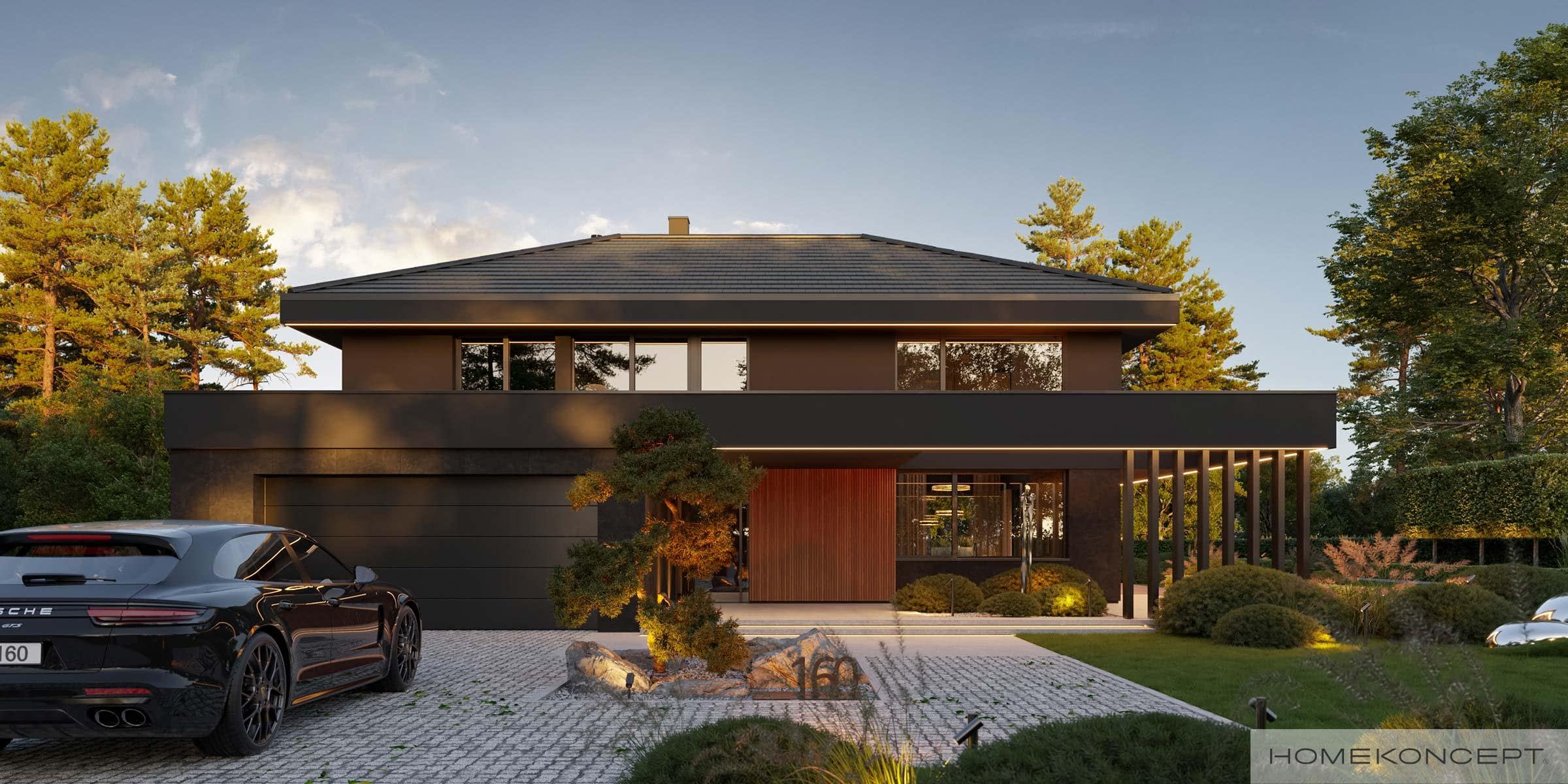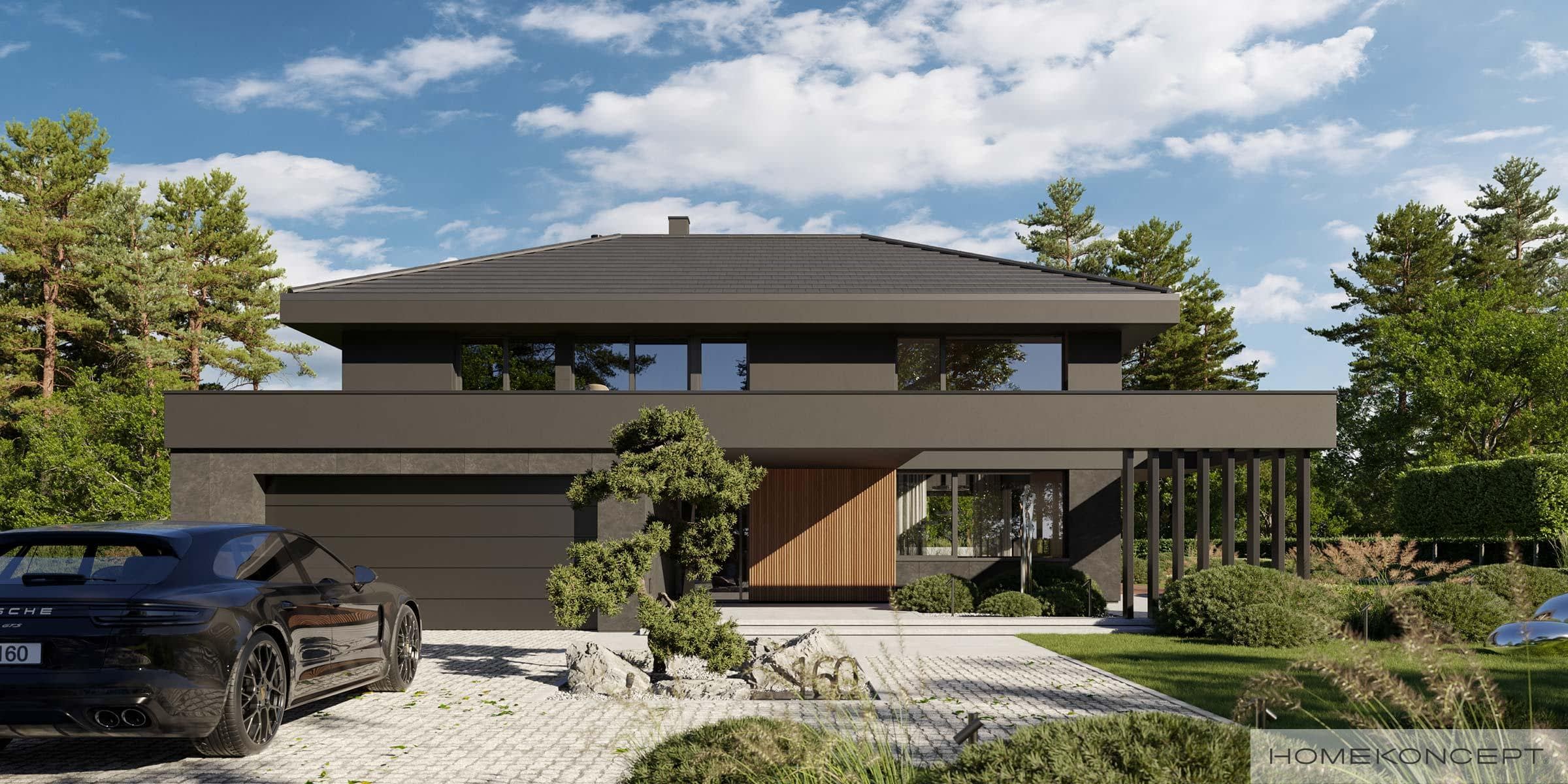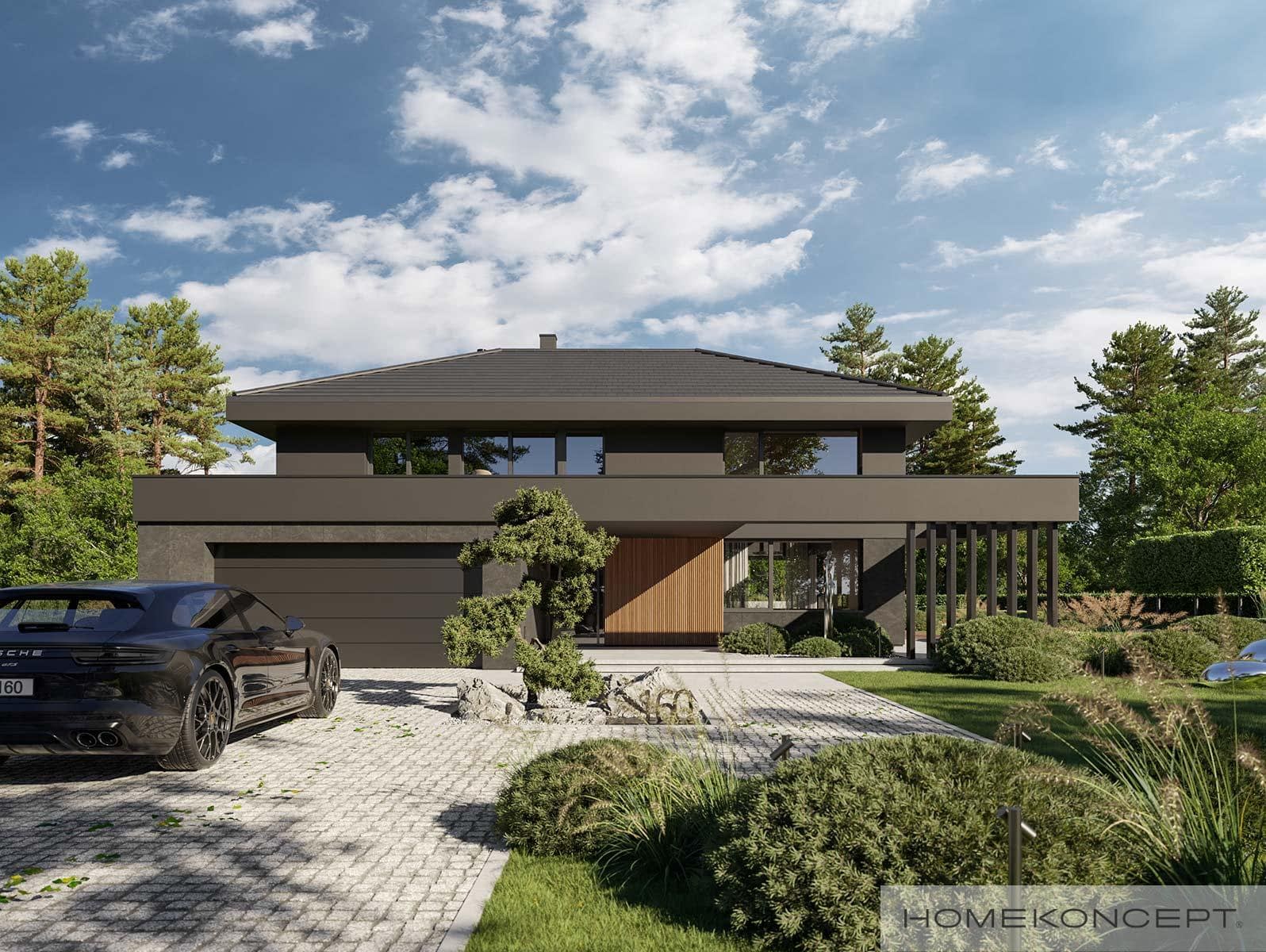 Elewacja: tynk silikonowy połączony z deskami elewacyjnymi lamelowymi oraz spiekiem kwarcowym