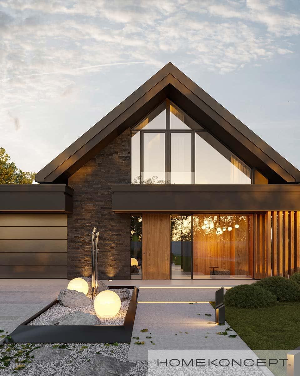 Elewacja: tynk silikonowy w połączeniu z deską elewacyjną lamelową oraz kamieniem elewacyjnym