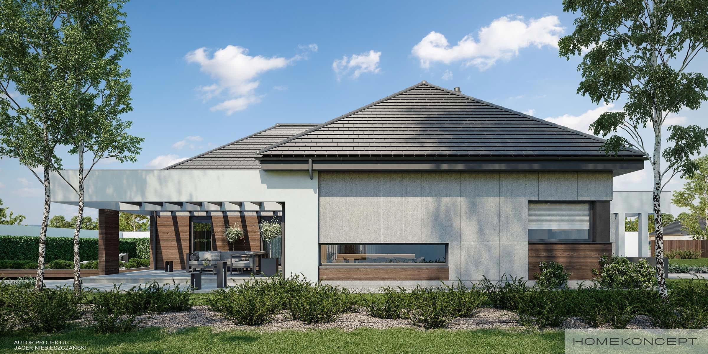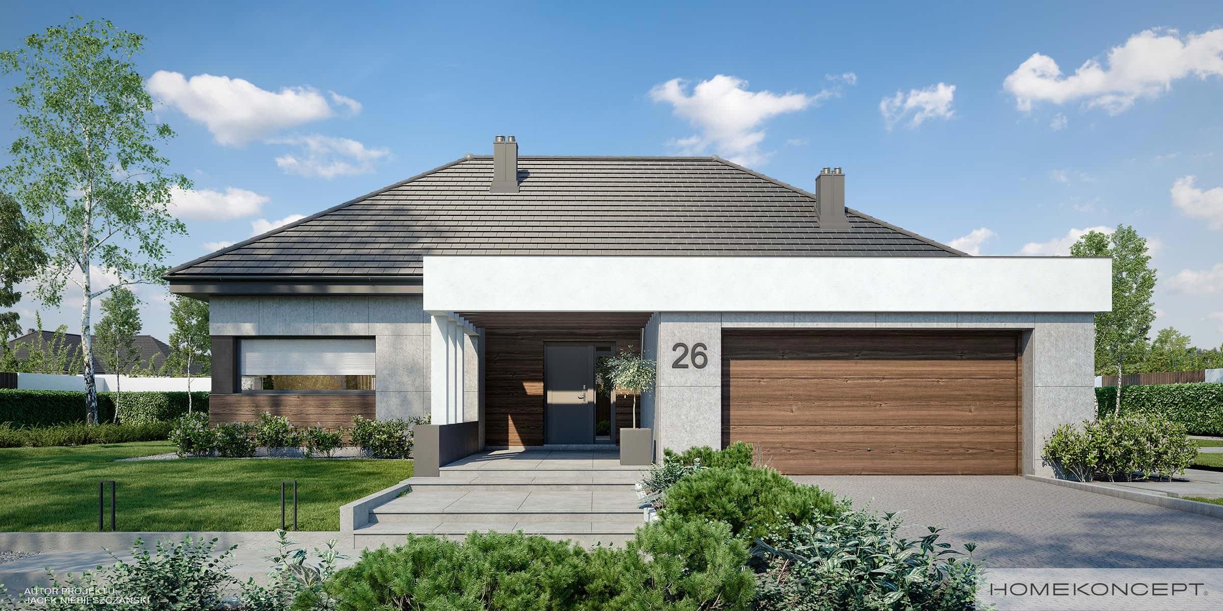 Elewacja: betonowe płyty elewacyjne połączone z tynkiem i drewnem elewacyjnym