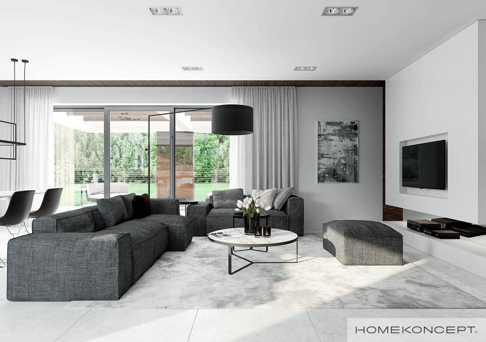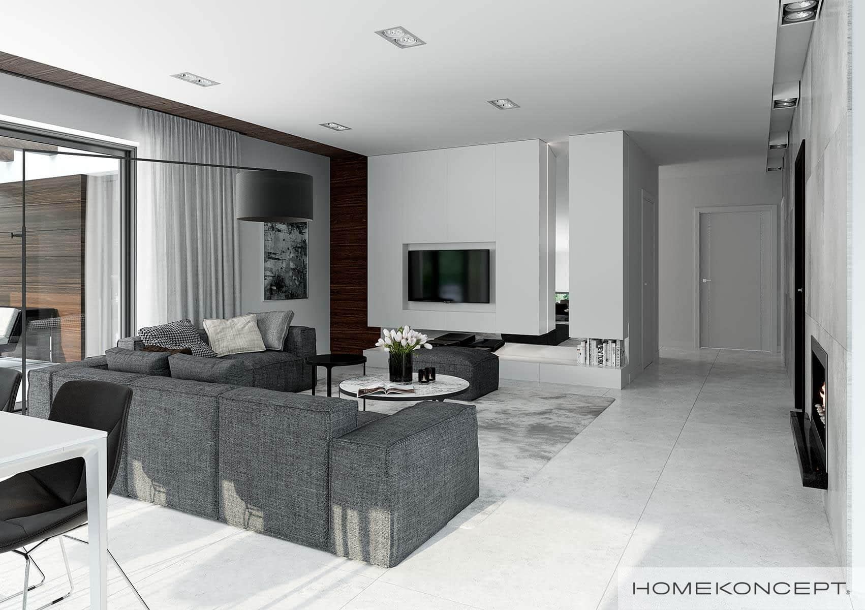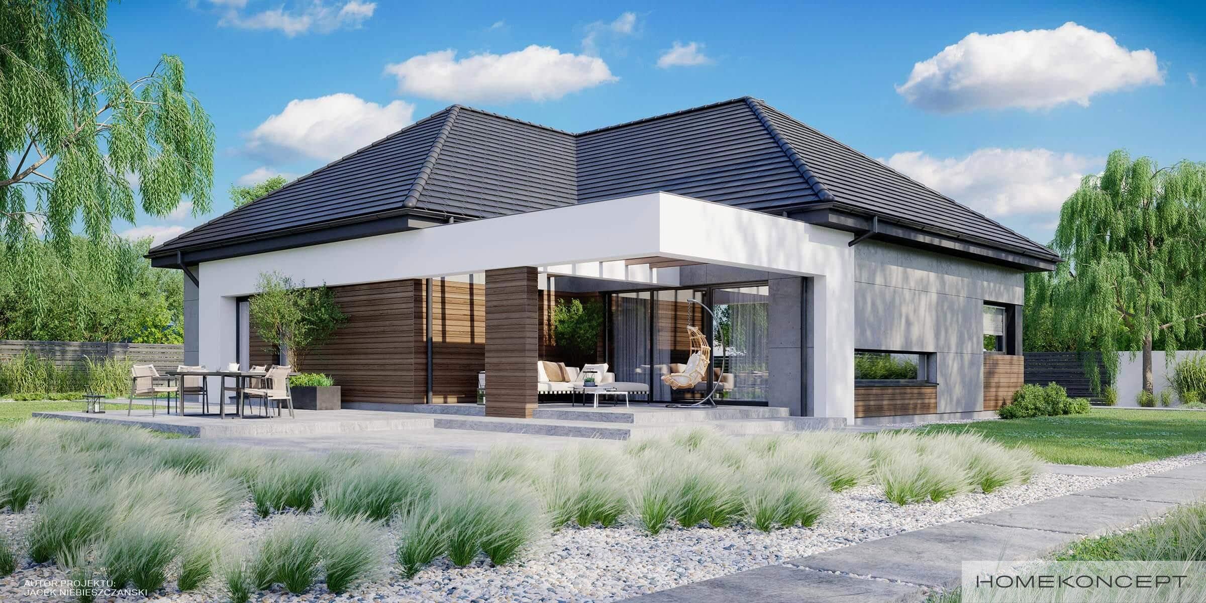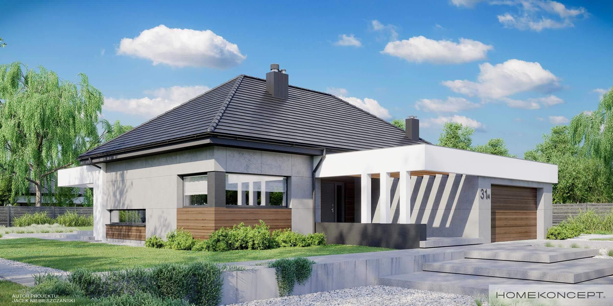 Elewacja: betonowe płyty elewacyjne połączone z tynkiem i drewnem elewacyjnym